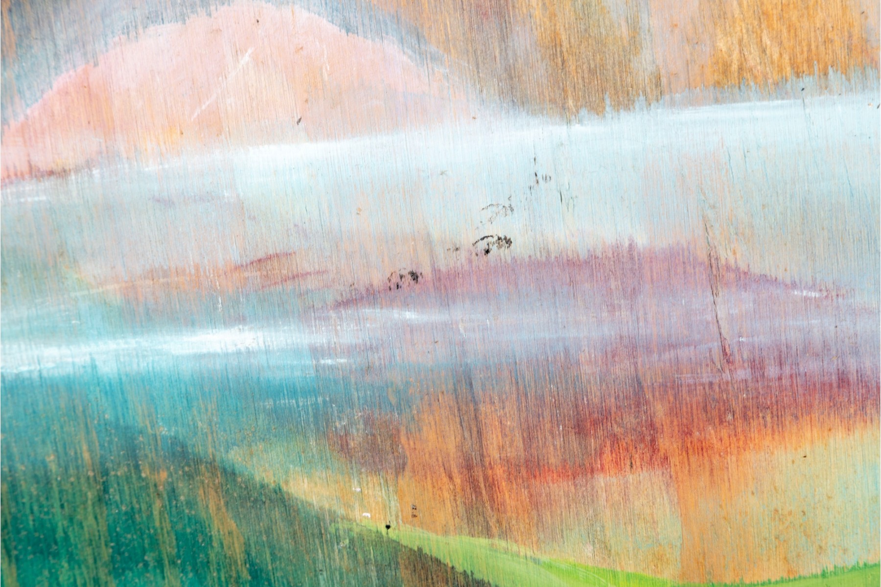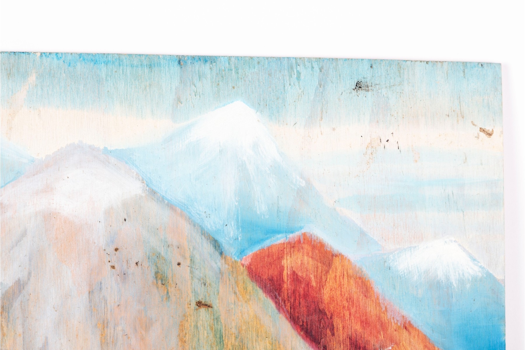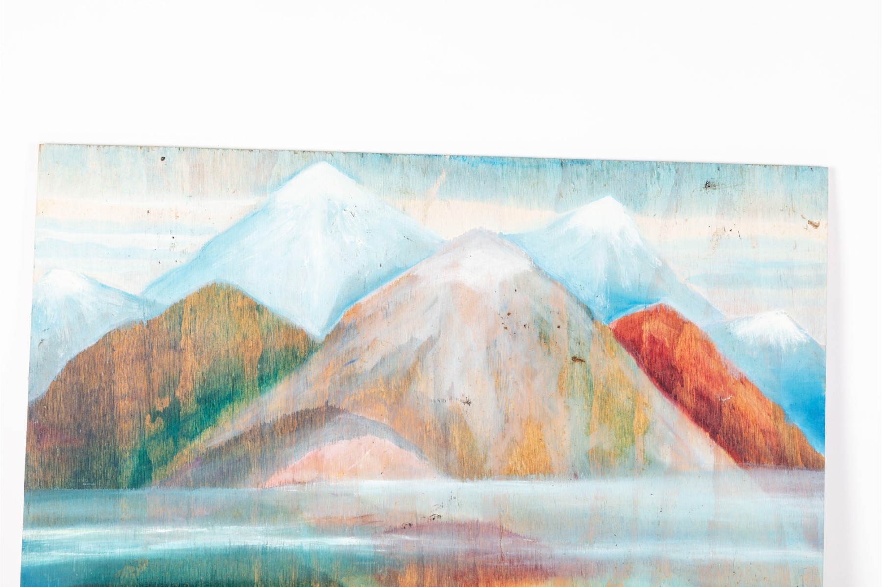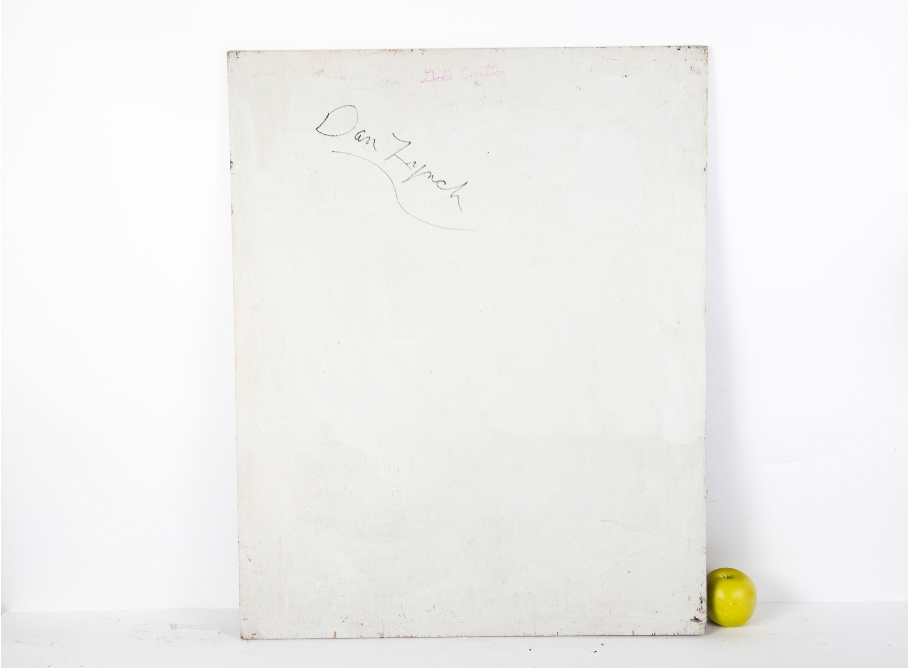 Dan Lynch (American [SC], 1930-2019) oil painting on board depicting a vibrant and refreshing landscape of a deep blue lake surrounded by dappled flowering foliage in the foreground, farm fields in the mid-ground , and towering white, orange, and green mountains in the background fading out into the pale blue sky above. Signed on the verso. Unframed.
