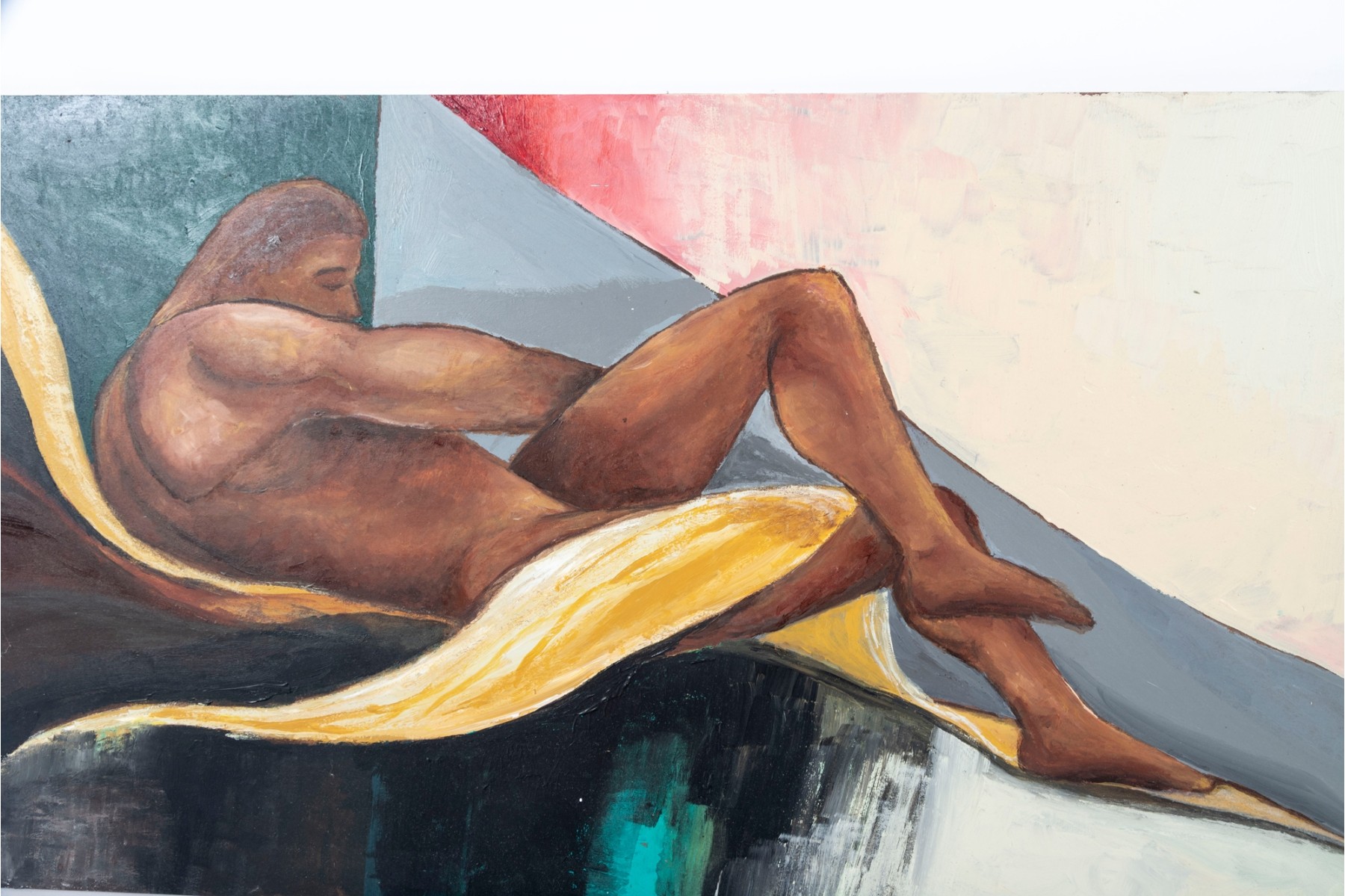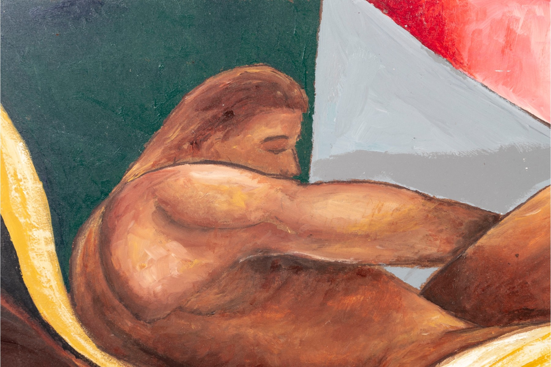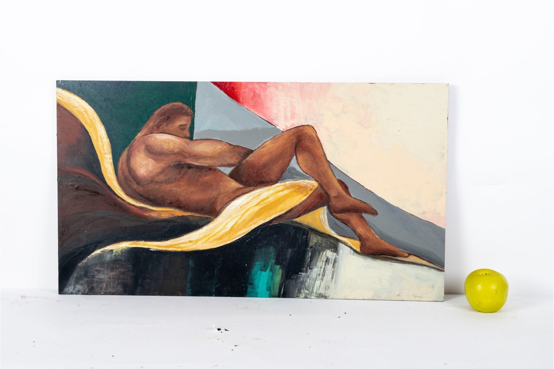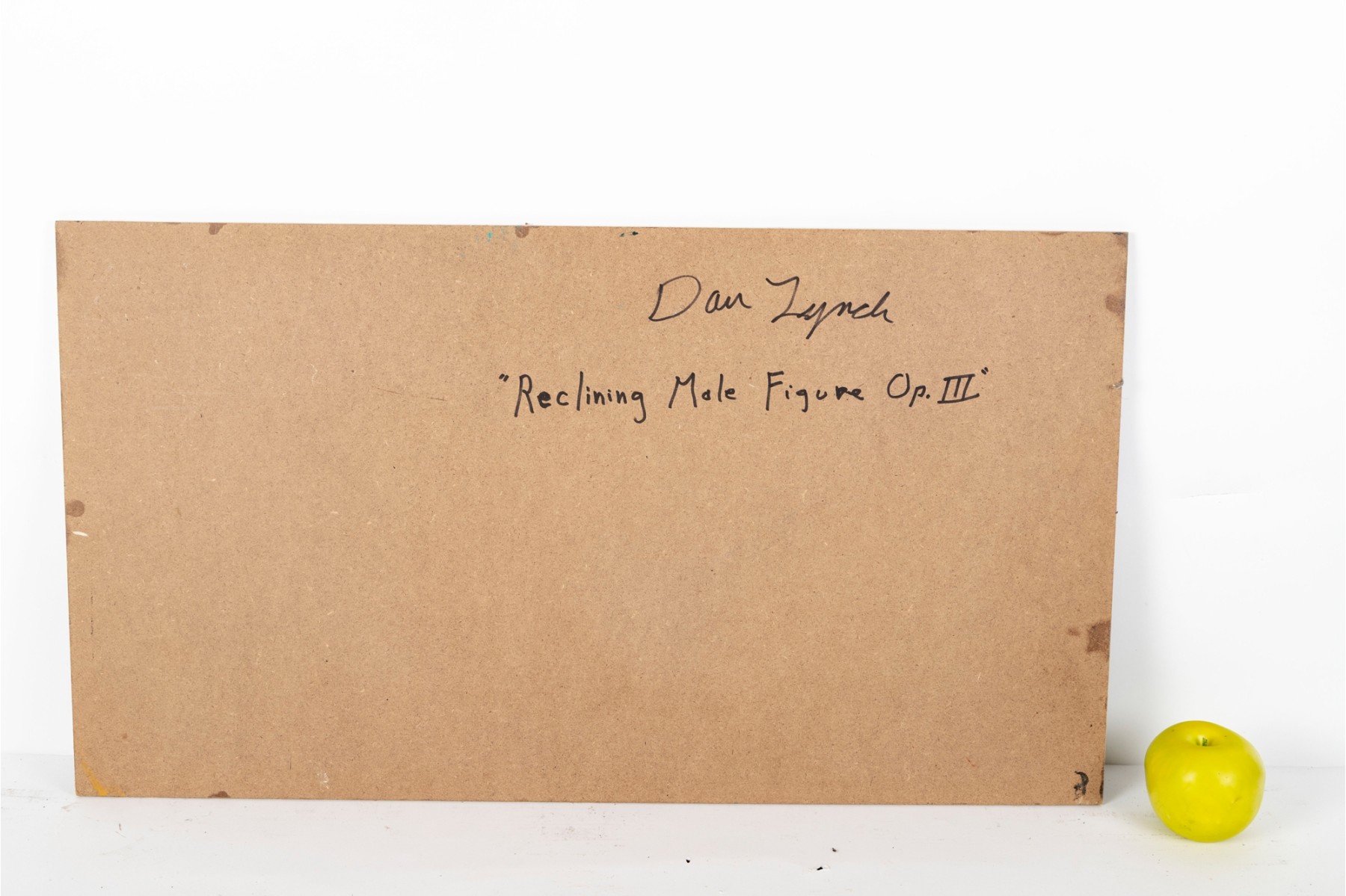 Dan Lynch (American [SC], 1930-2019) "Reclining Male Figure Op. III" oil painting on board depicting a male nude posed reclining in an abstracted landscape on a gently inclined surface draped in flowing yellow fabric. Signed lower right and on the verso with the title. Unframed.