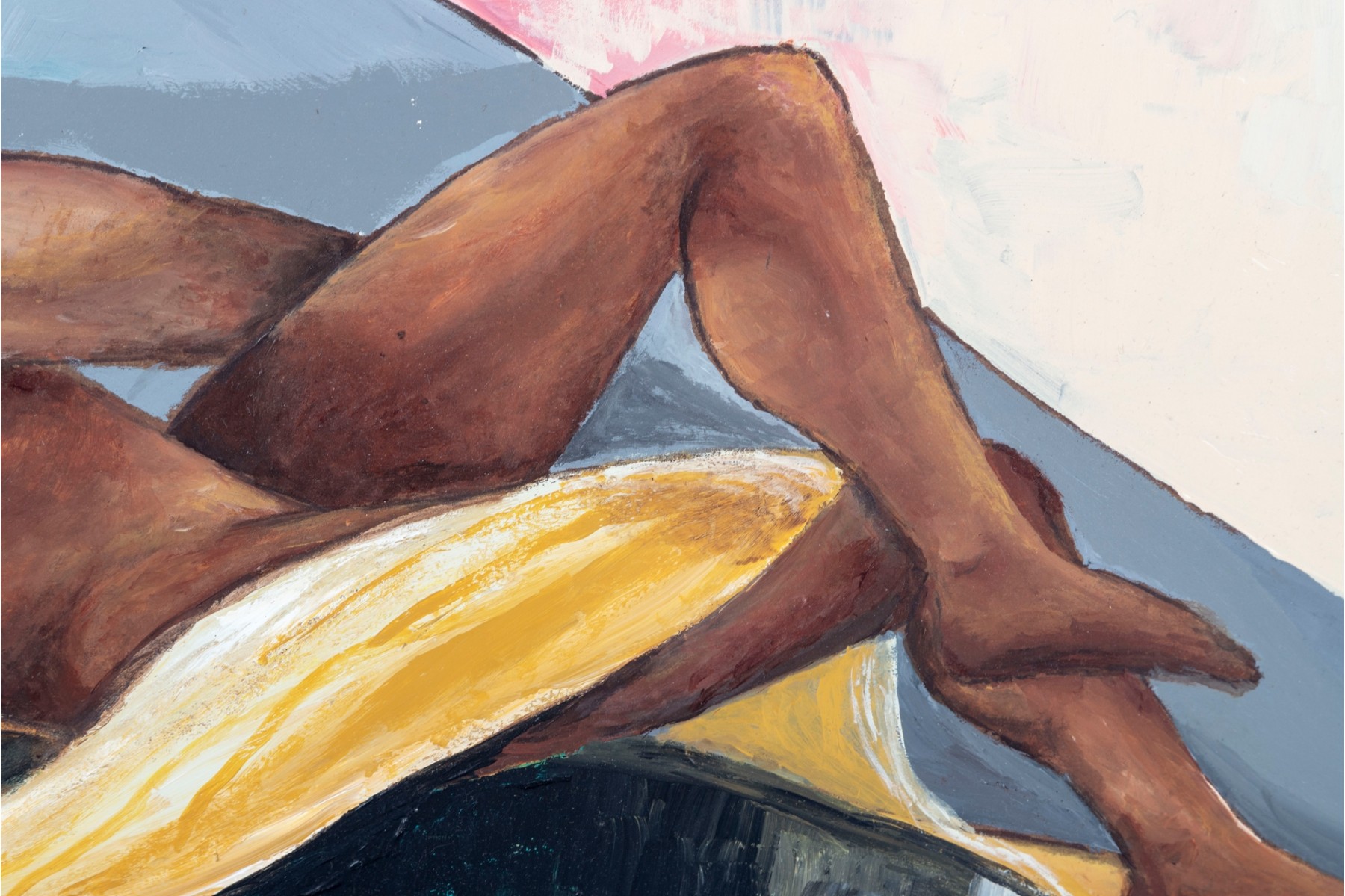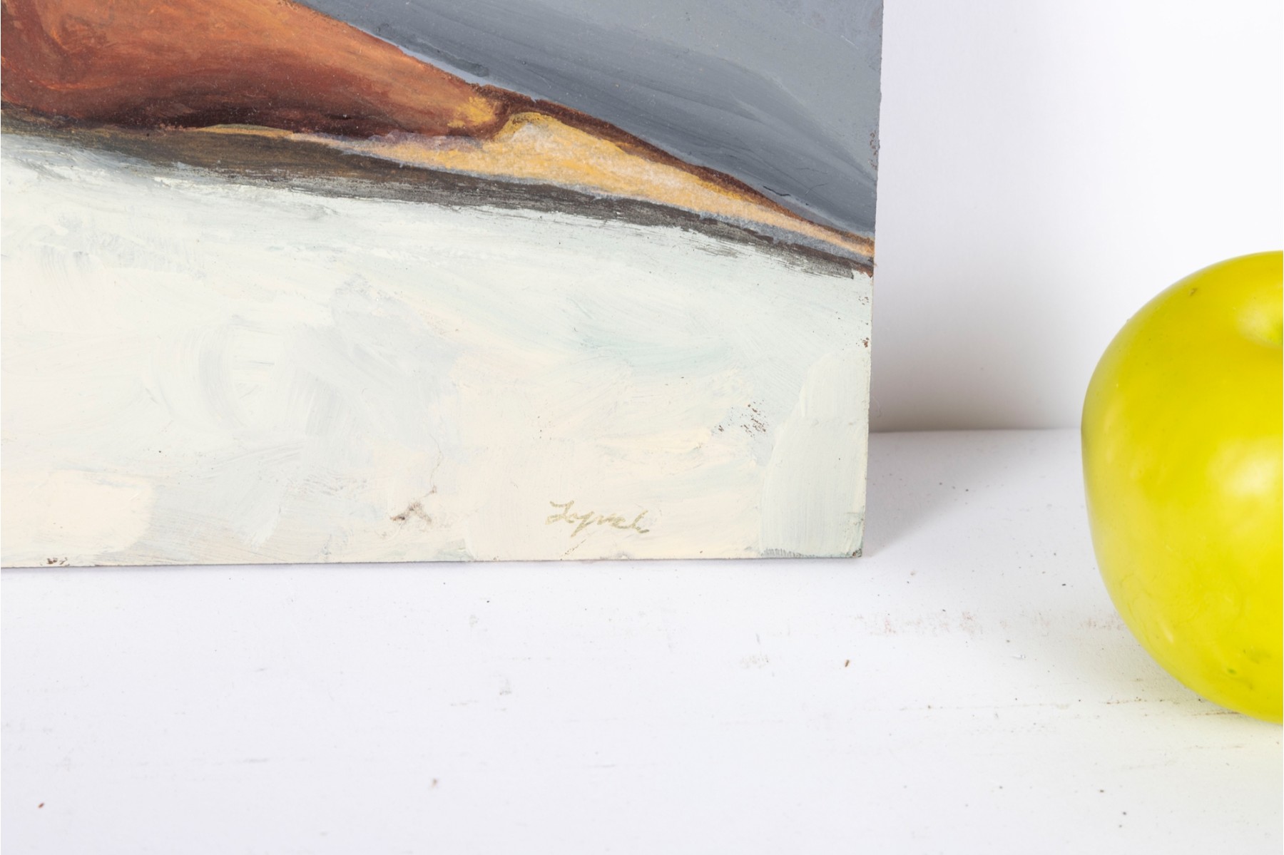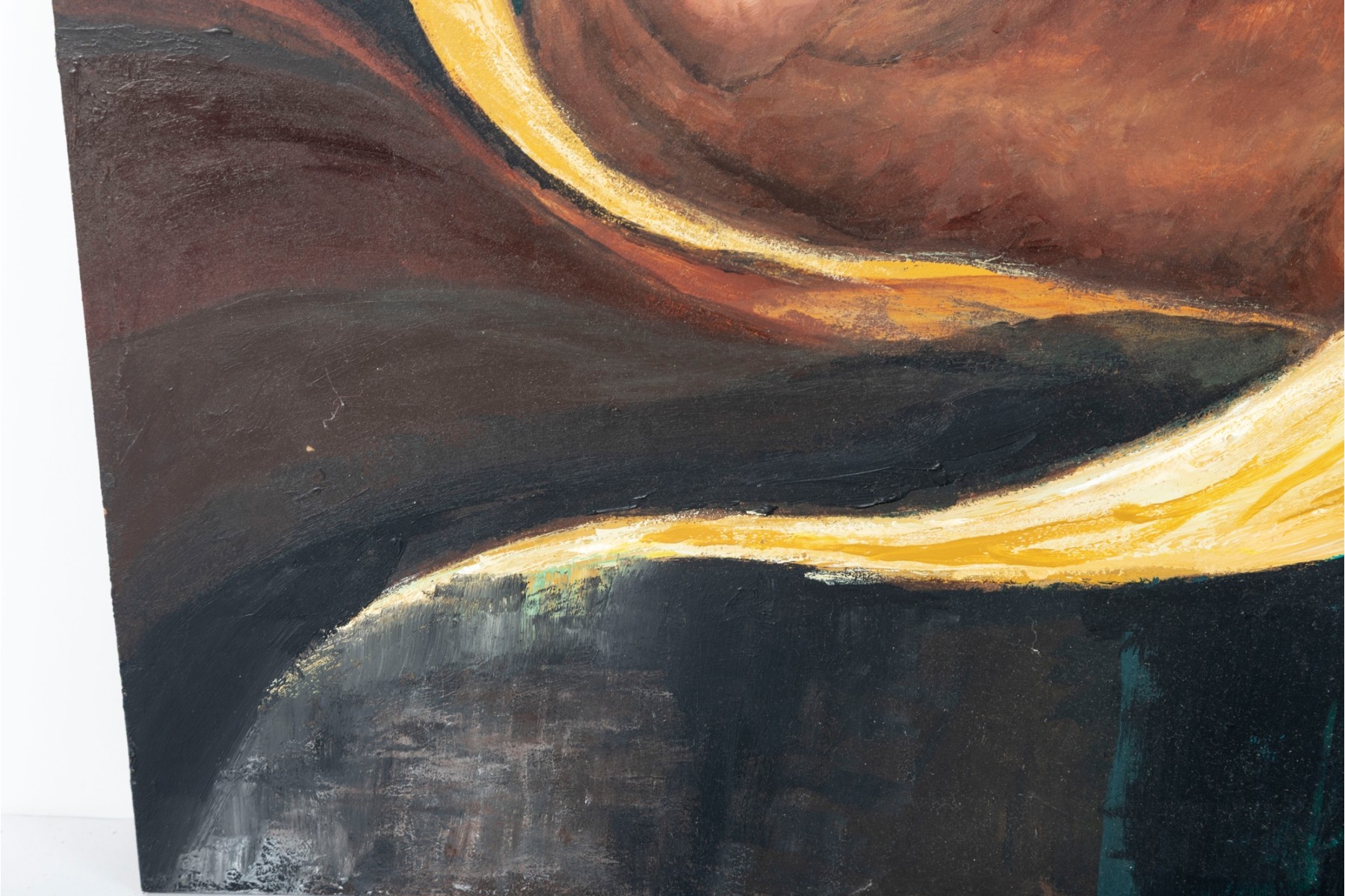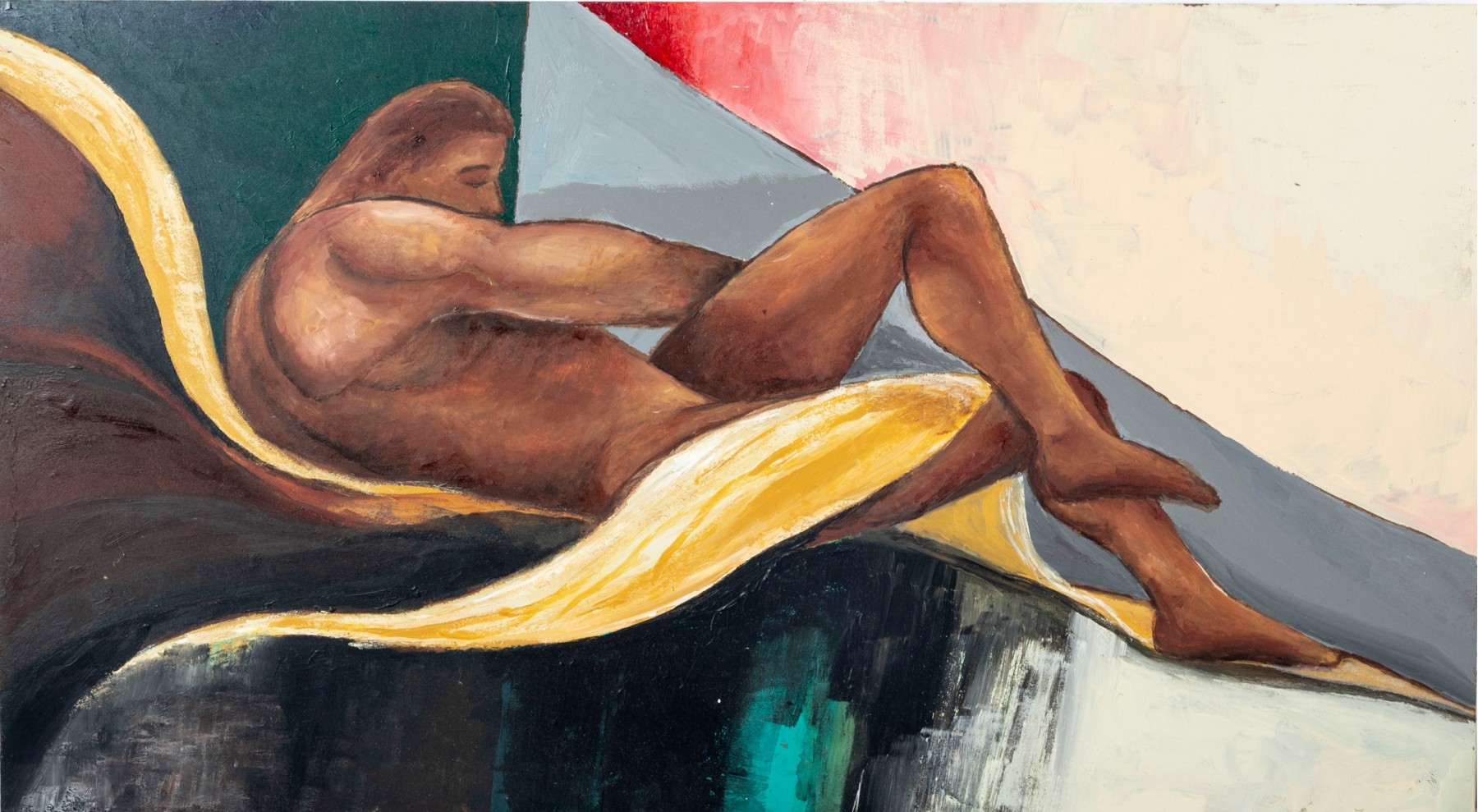 Dan Lynch (American [SC], 1930-2019) "Reclining Male Figure Op. III" oil painting on board depicting a male nude posed reclining in an abstracted landscape on a gently inclined surface draped in flowing yellow fabric. Signed lower right and on the verso with the title. Unframed.