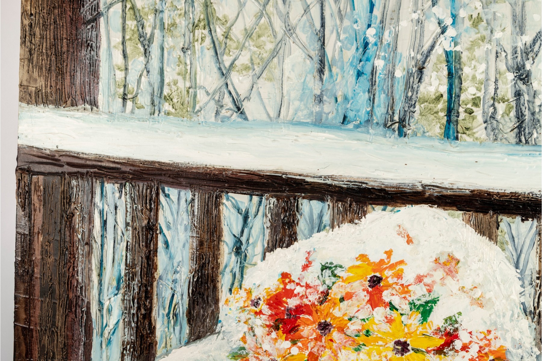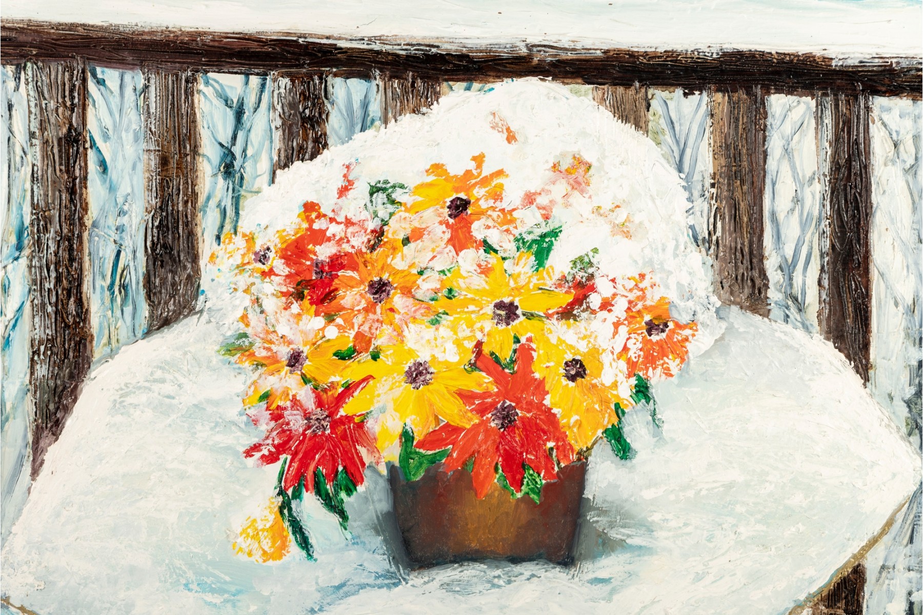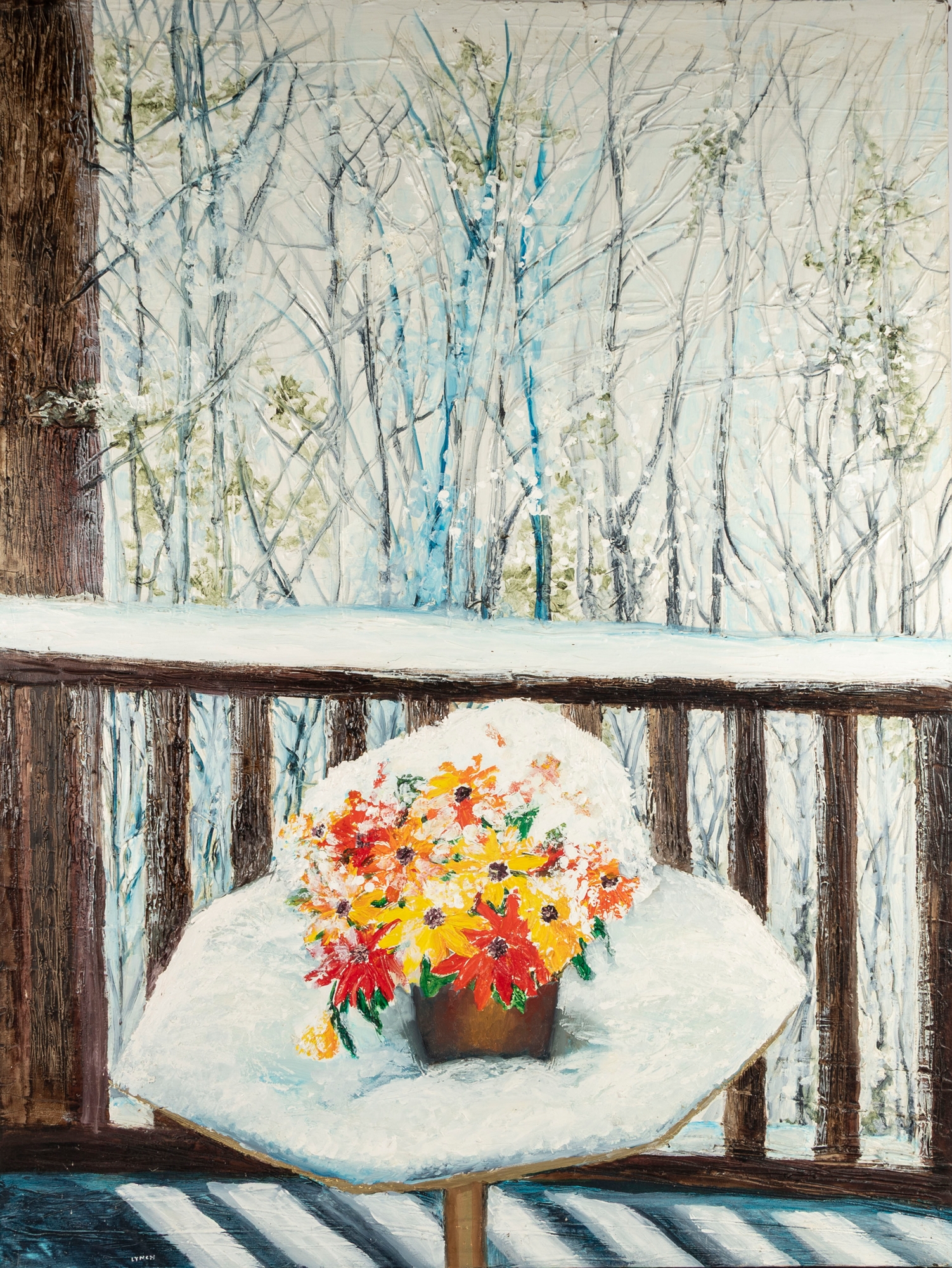 A serene winter landscape by Dan Lynch depicting a potted bouquet of colorful flowers resting on a snow-covered patio table overlooking a quiet, wooded backdrop.
