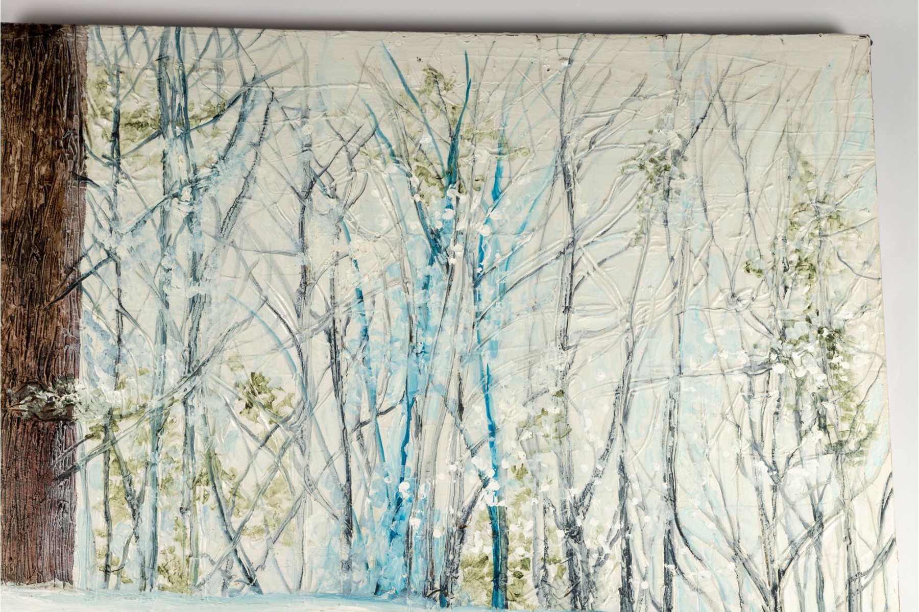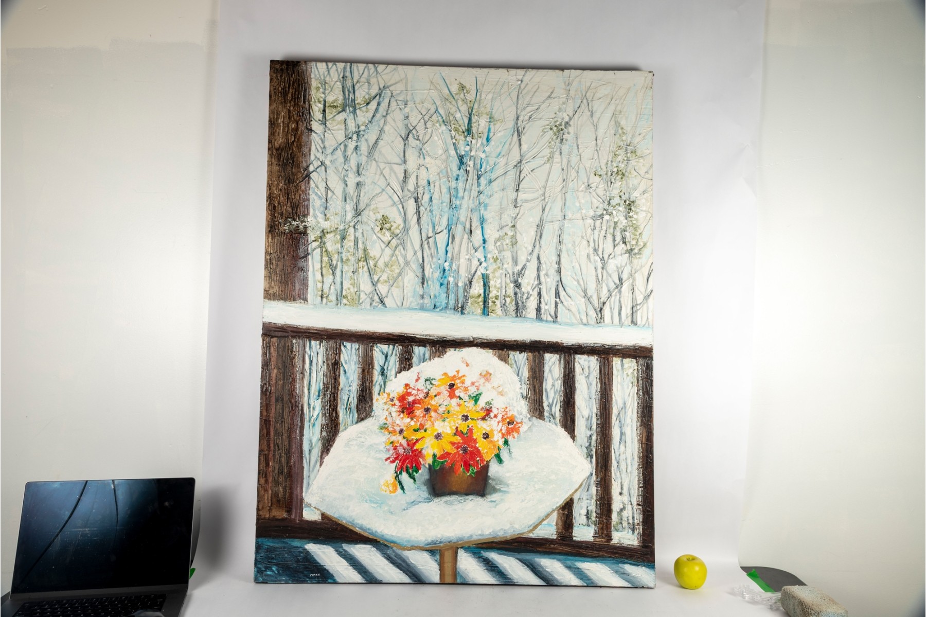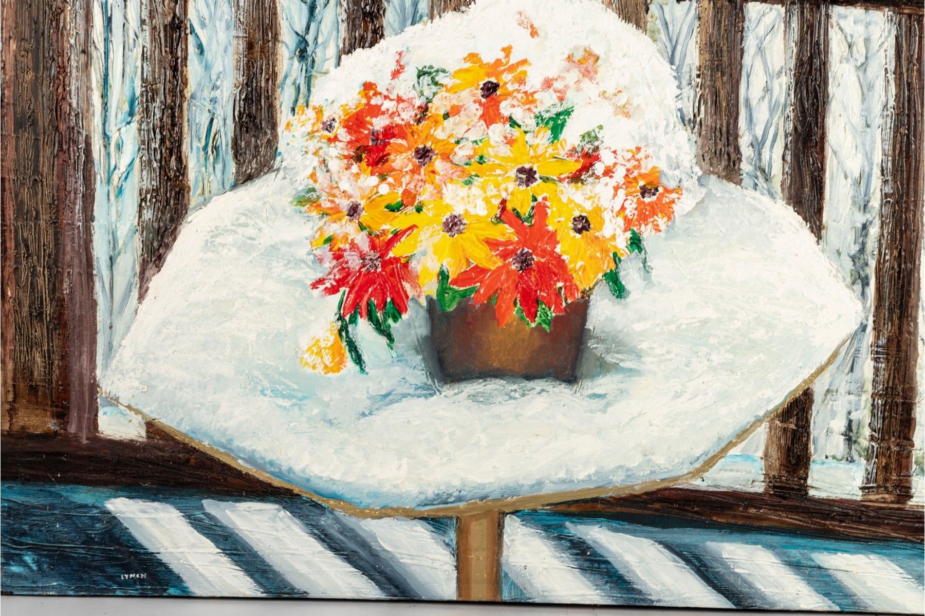 A serene winter landscape by Dan Lynch depicting a potted bouquet of colorful flowers resting on a snow-covered patio table overlooking a quiet, wooded backdrop.