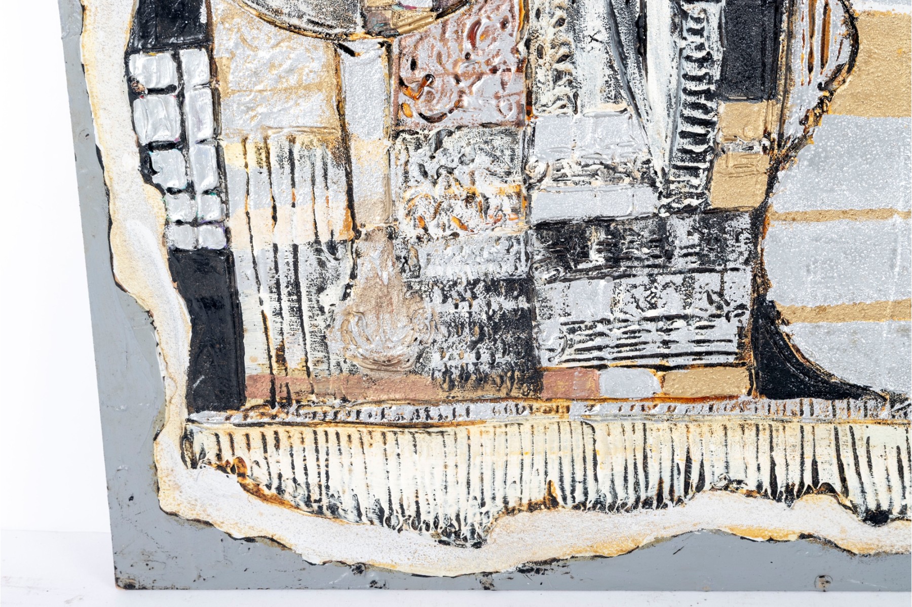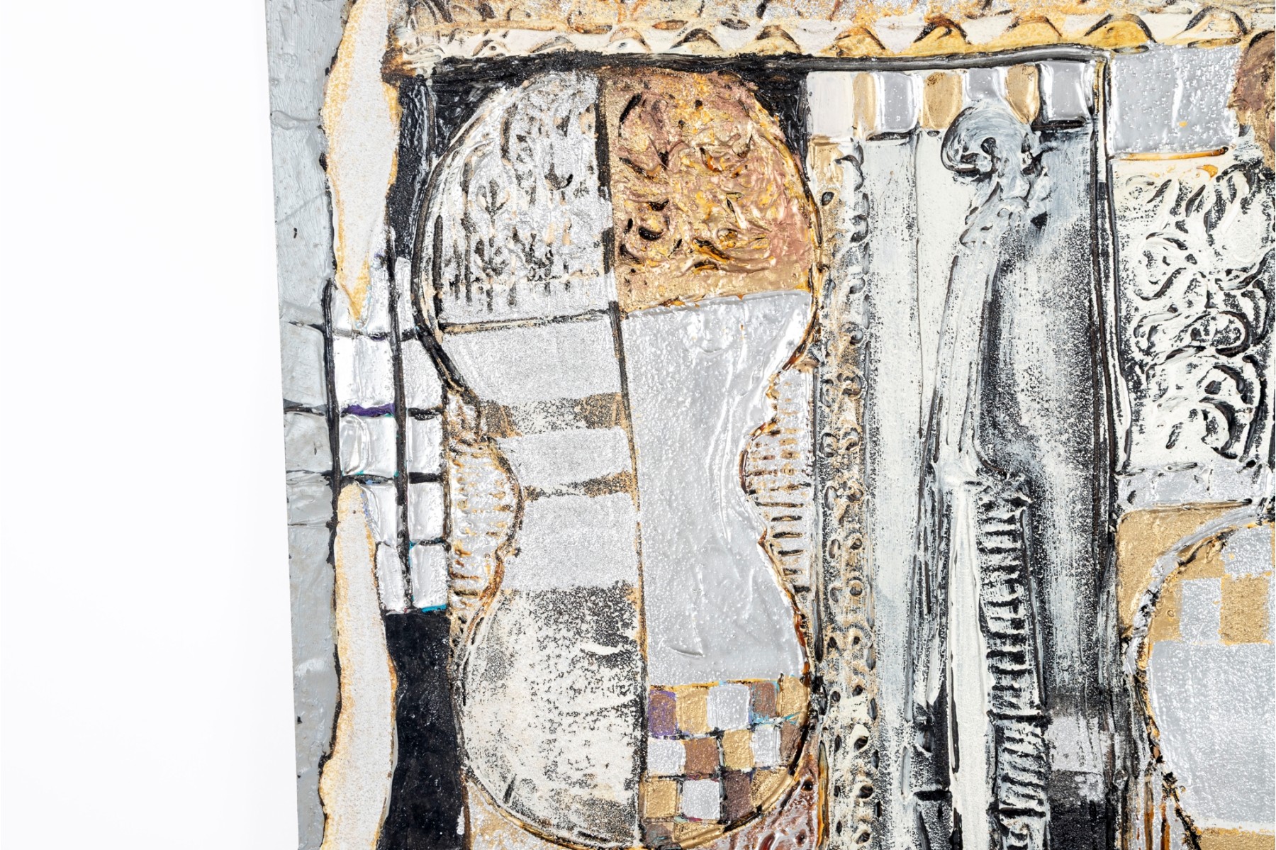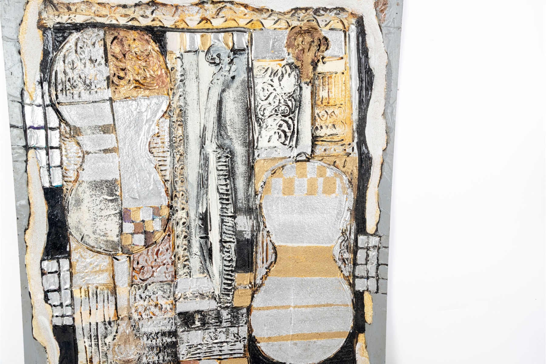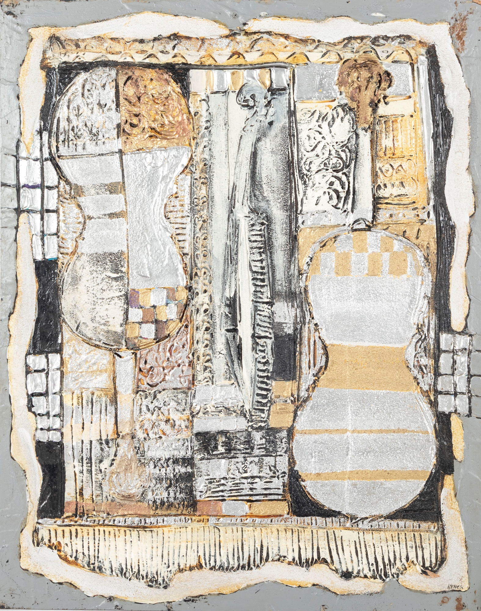 Dan Lynch (American [SC], 1930-2019) "The Guarnerius" mixed media on board depicting an abstract composition with two opposing violin forms within a rectangular field of textural gold, silver, and copper tones with black and white borders for great contrast. Signed lower right and on the verso with the title. Unframed.