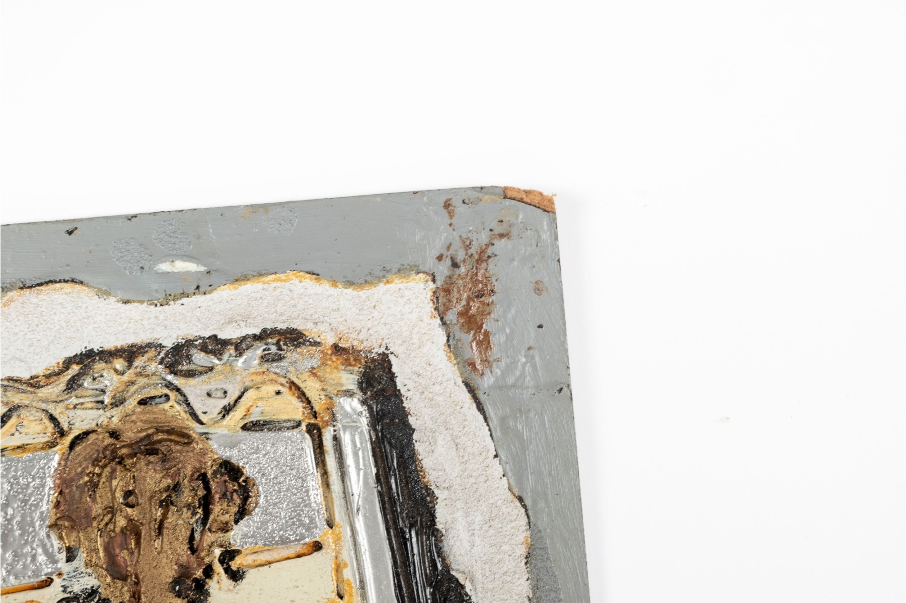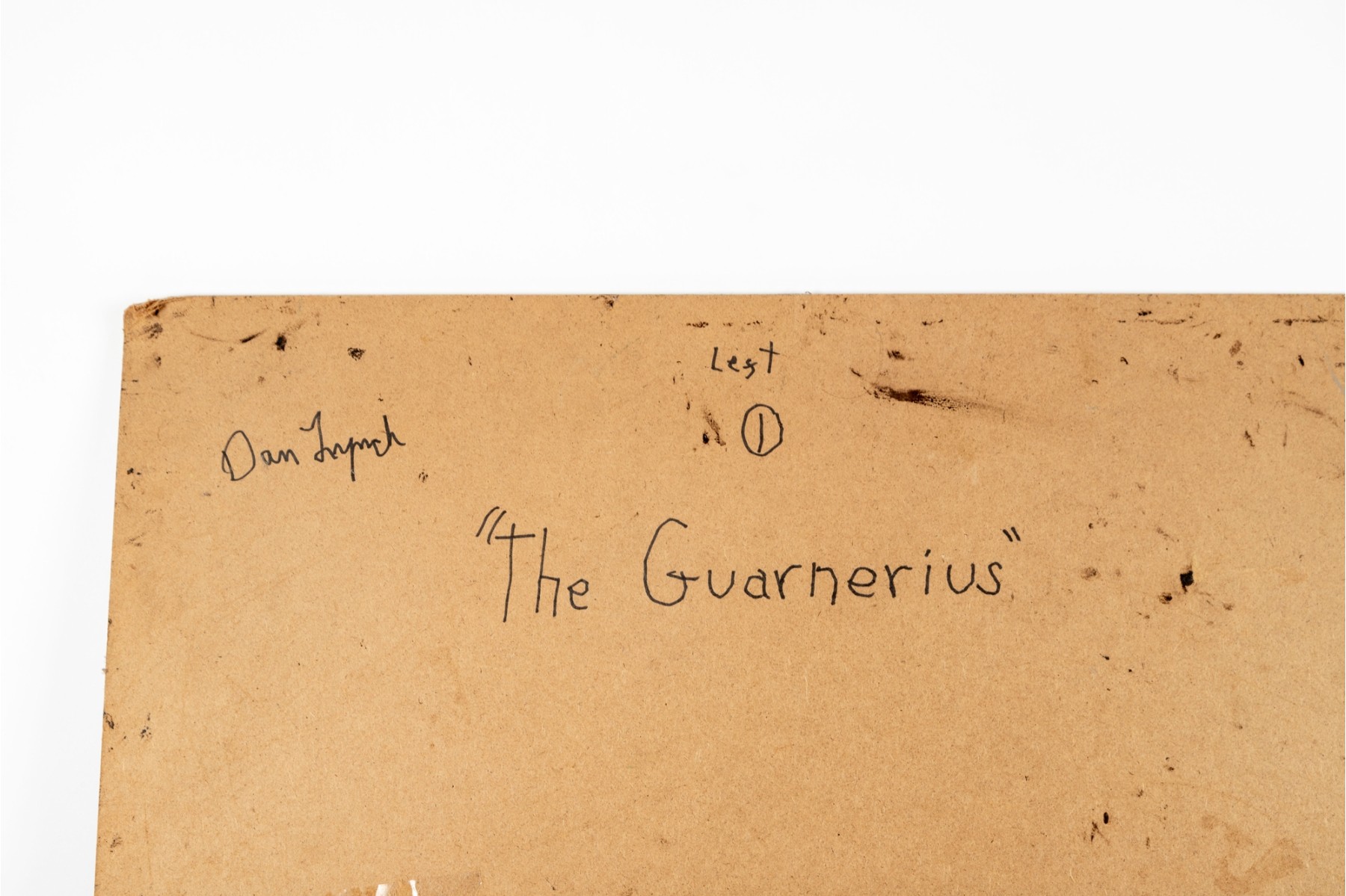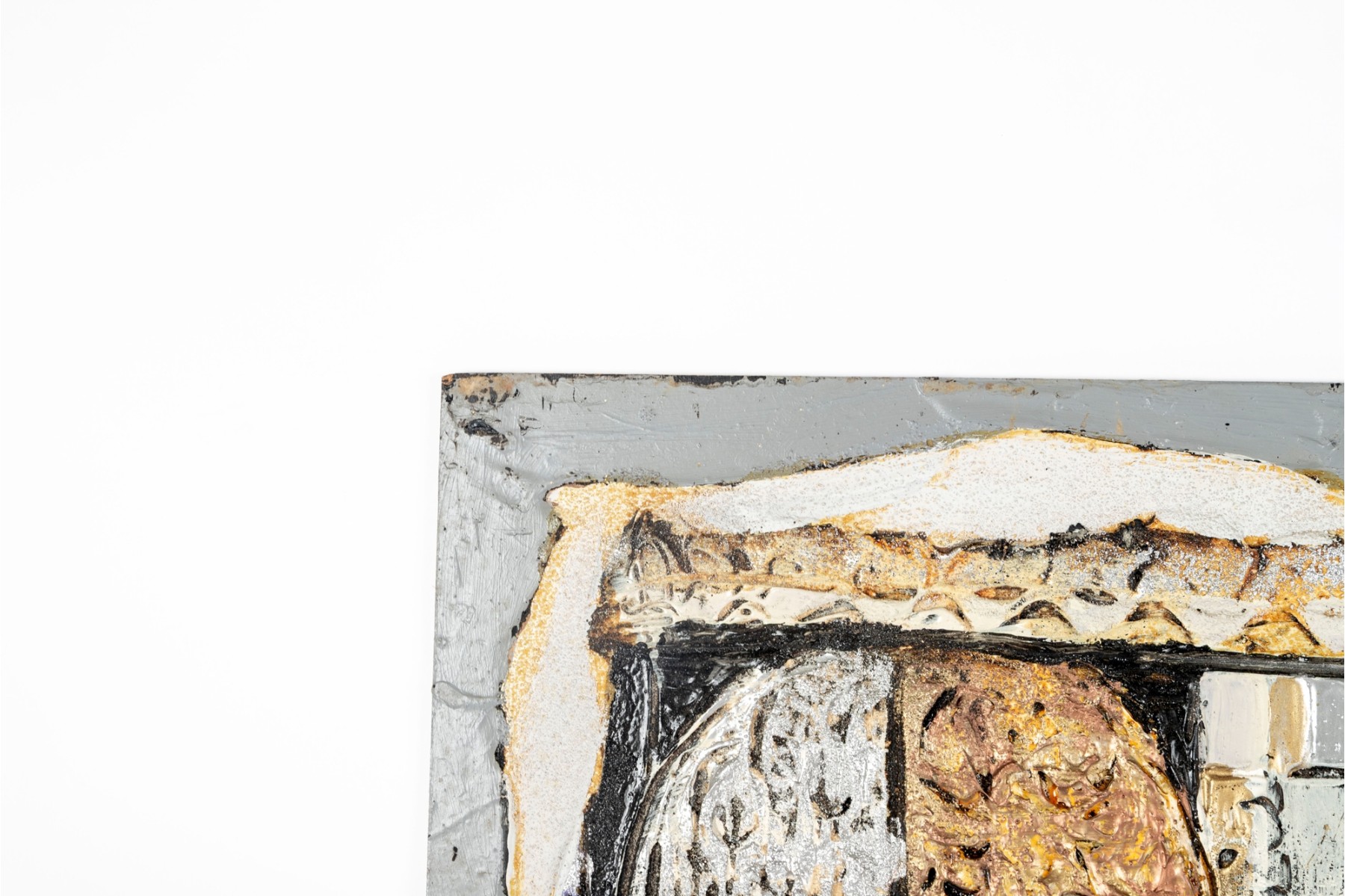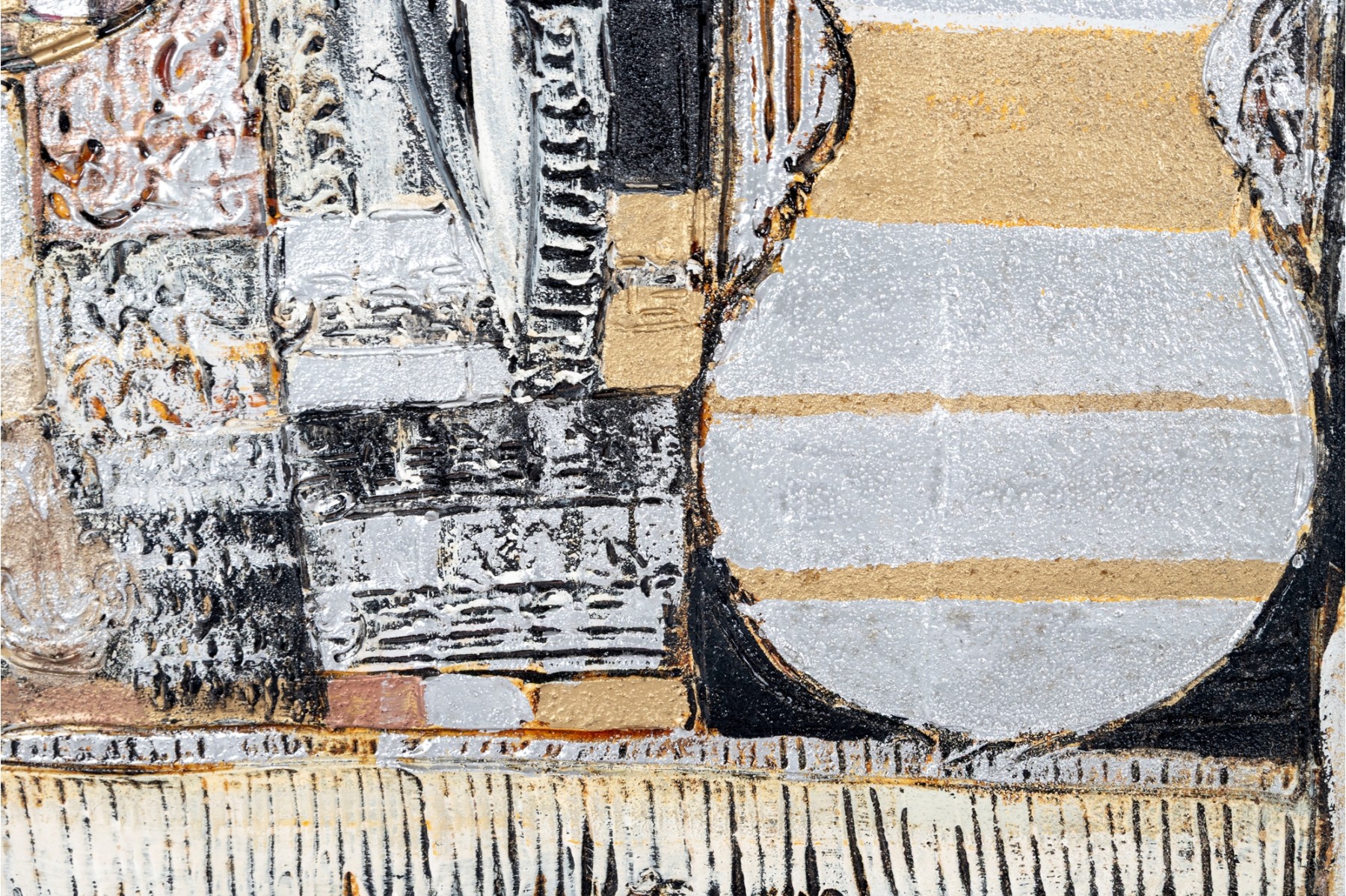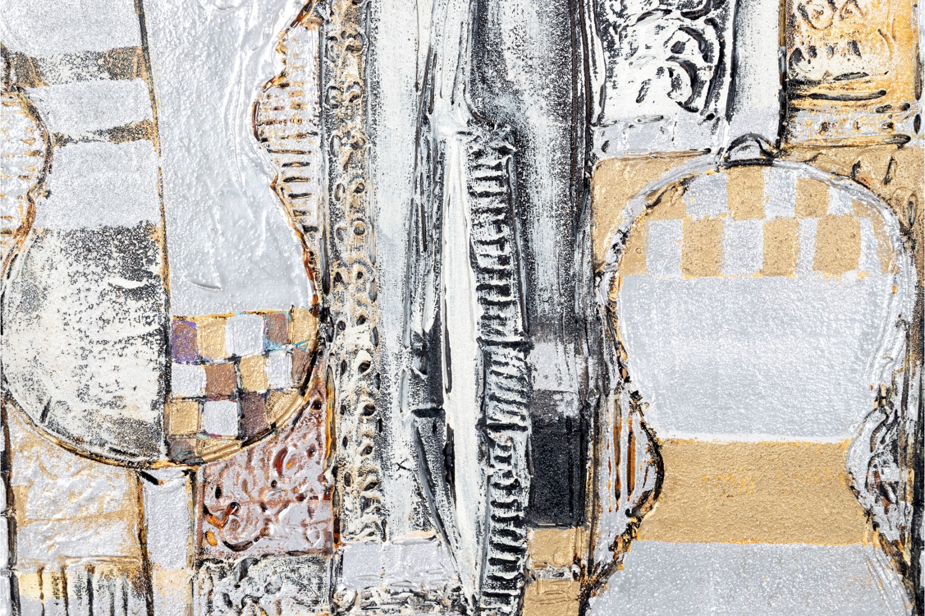 Dan Lynch (American [SC], 1930-2019) "The Guarnerius" mixed media on board depicting an abstract composition with two opposing violin forms within a rectangular field of textural gold, silver, and copper tones with black and white borders for great contrast. Signed lower right and on the verso with the title. Unframed.