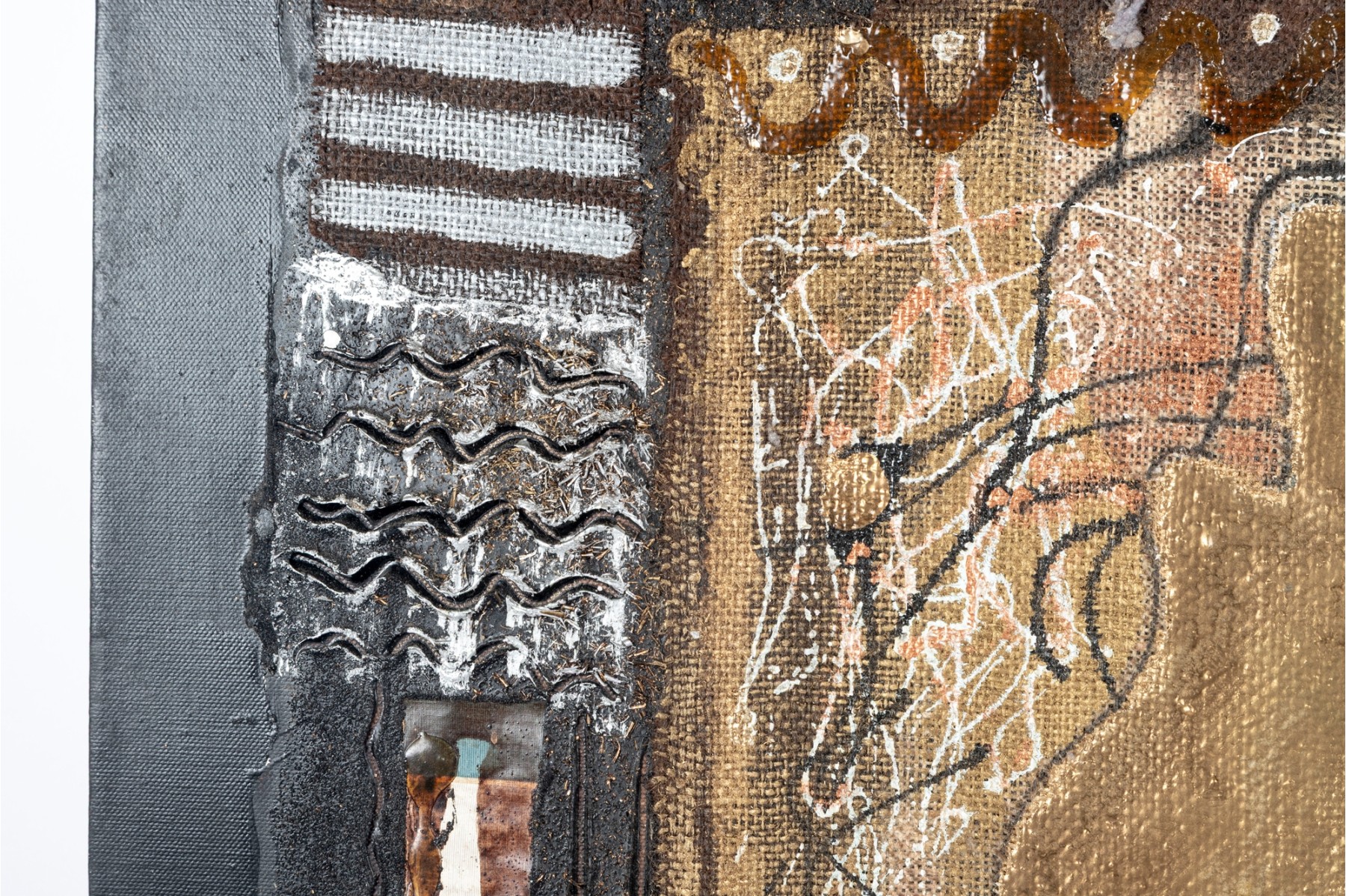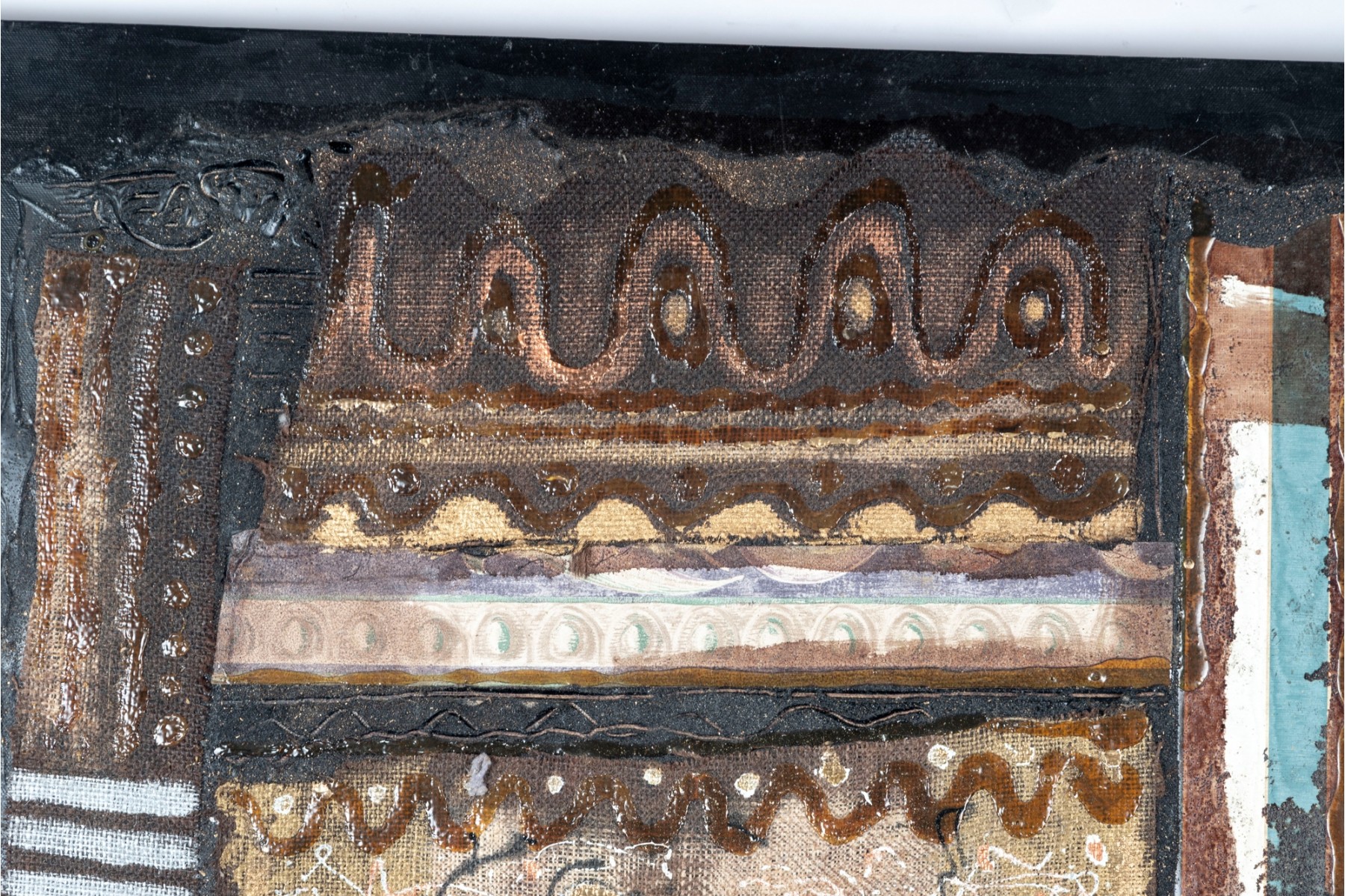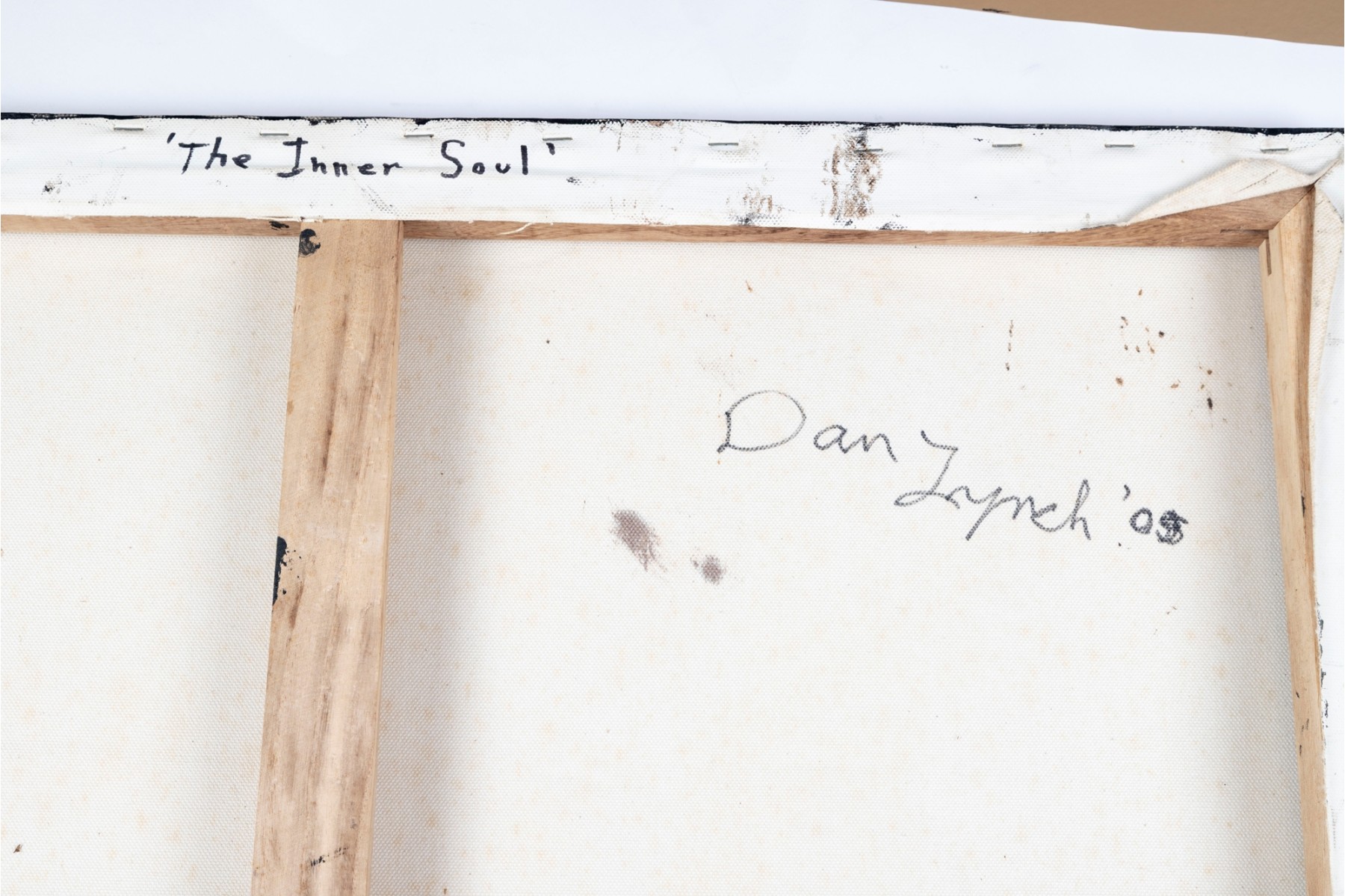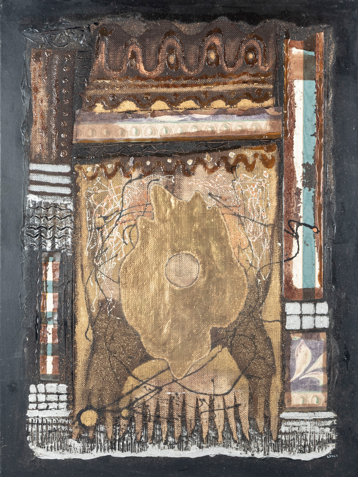 Dan Lynch (American [SC], 1930-2019) "The Inner Soul" mixed media on canvas depicting an abstract composition with a gilt center form flanked by column-like posts in textured brown, white, and blue. Signed lower right and on the verso with the title. The canvas is mounted to a stretcher, unframed.
