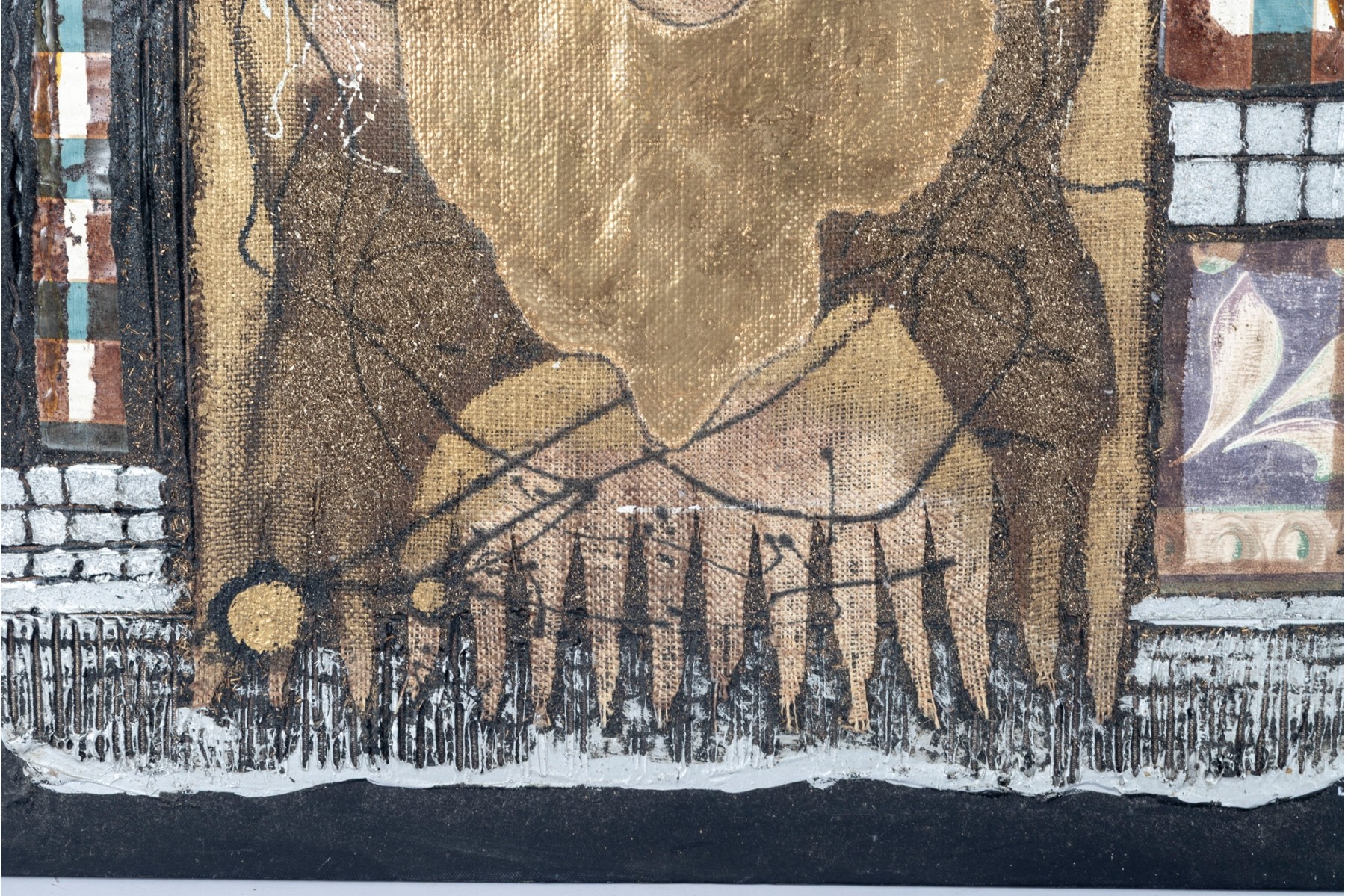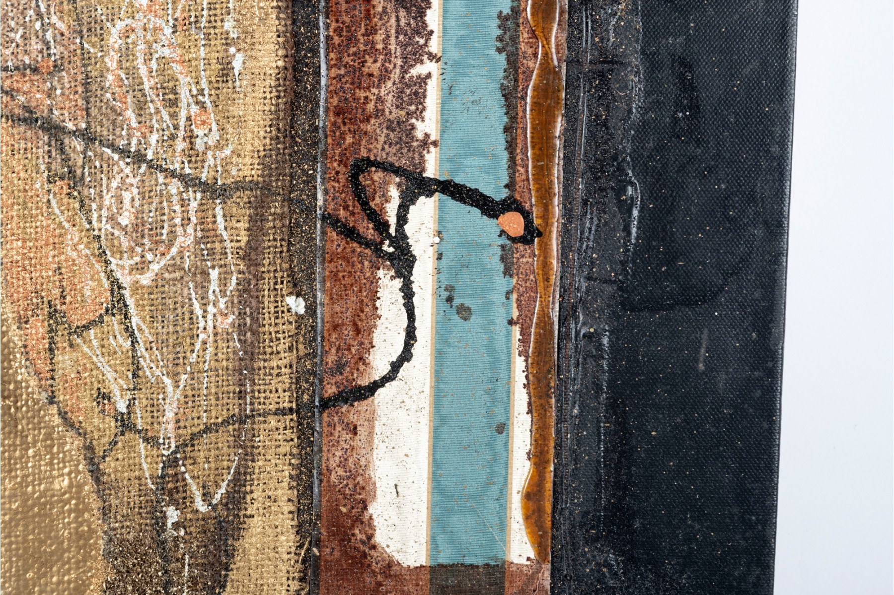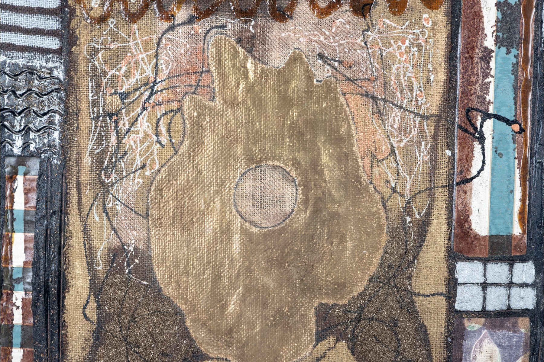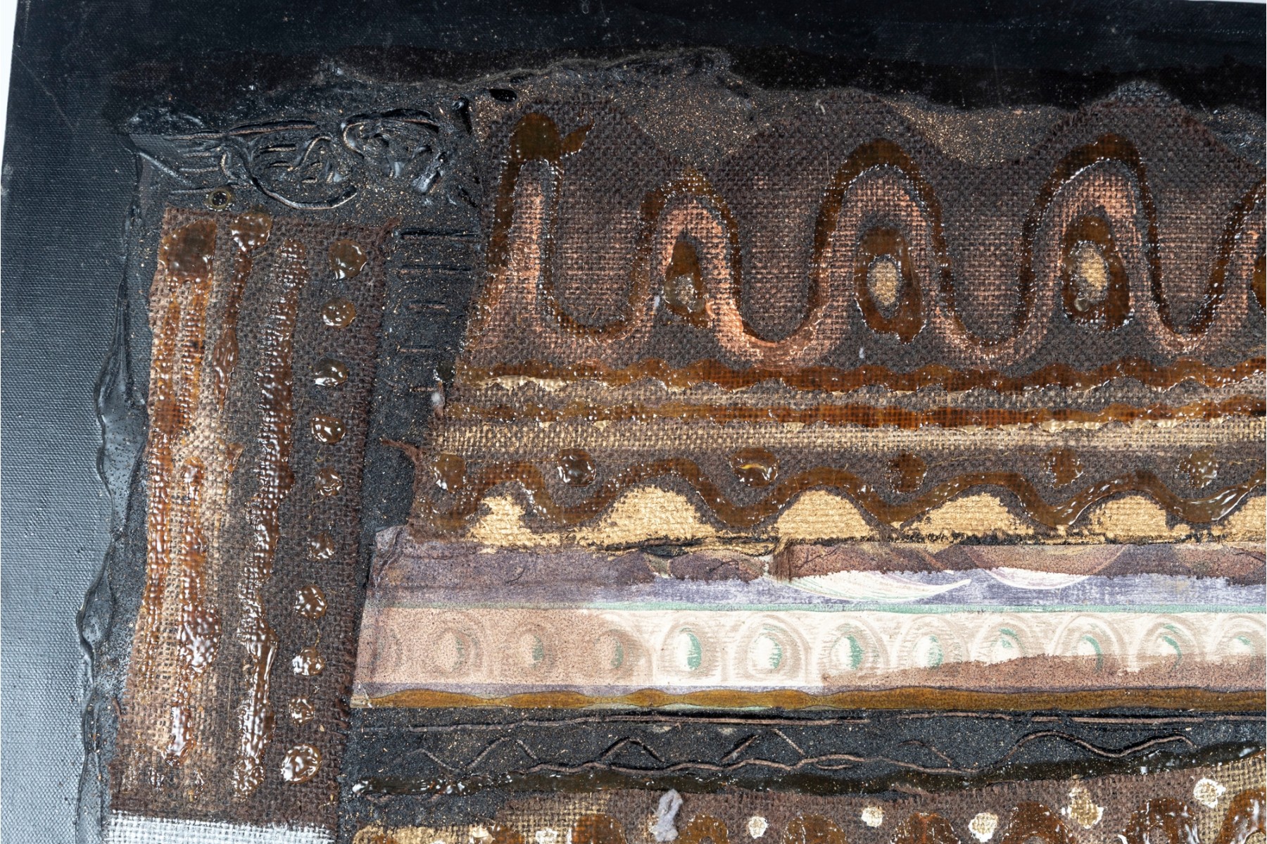 Dan Lynch (American [SC], 1930-2019) "The Inner Soul" mixed media on canvas depicting an abstract composition with a gilt center form flanked by column-like posts in textured brown, white, and blue. Signed lower right and on the verso with the title. The canvas is mounted to a stretcher, unframed.