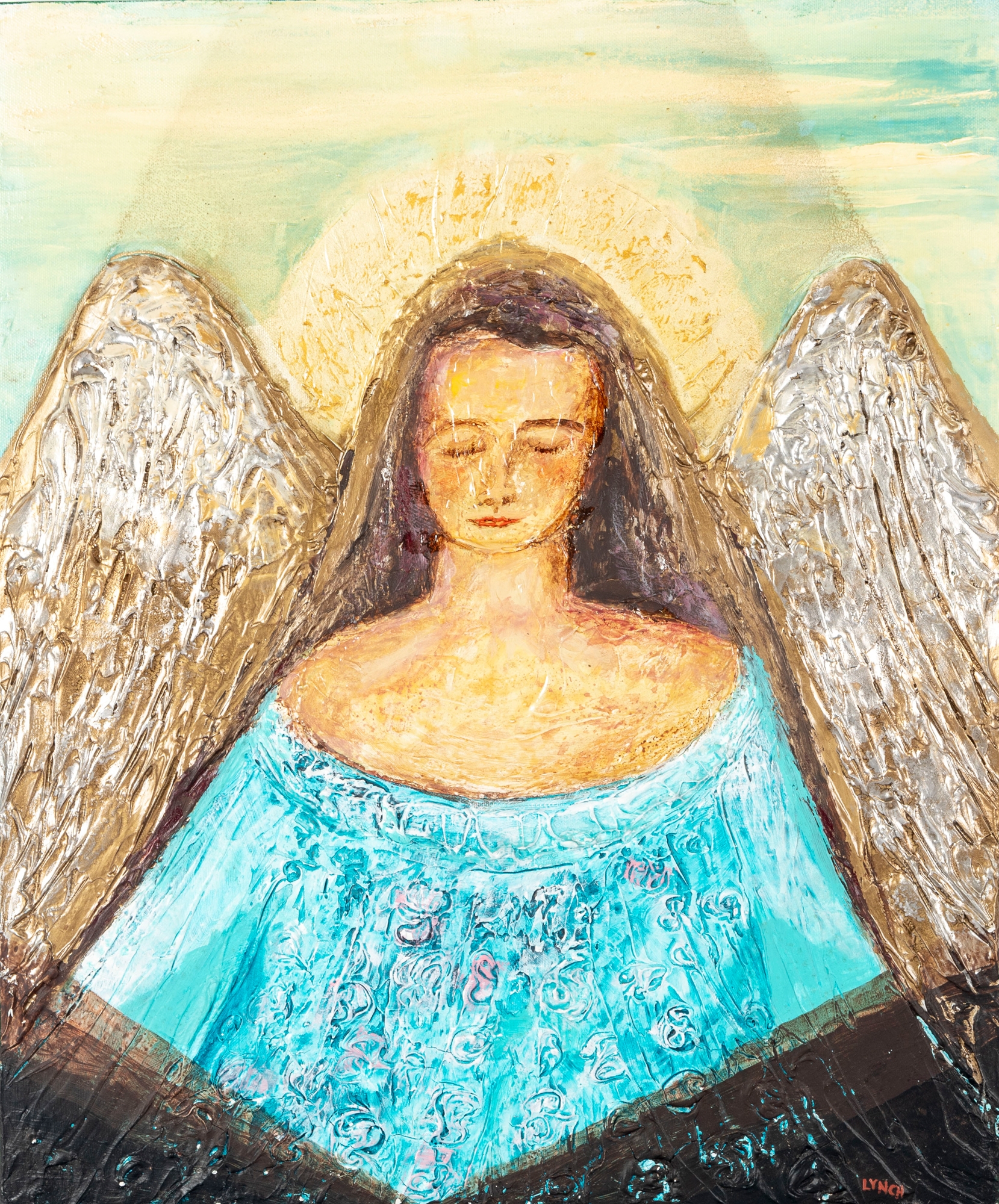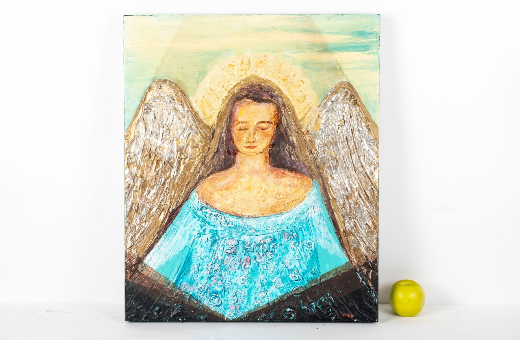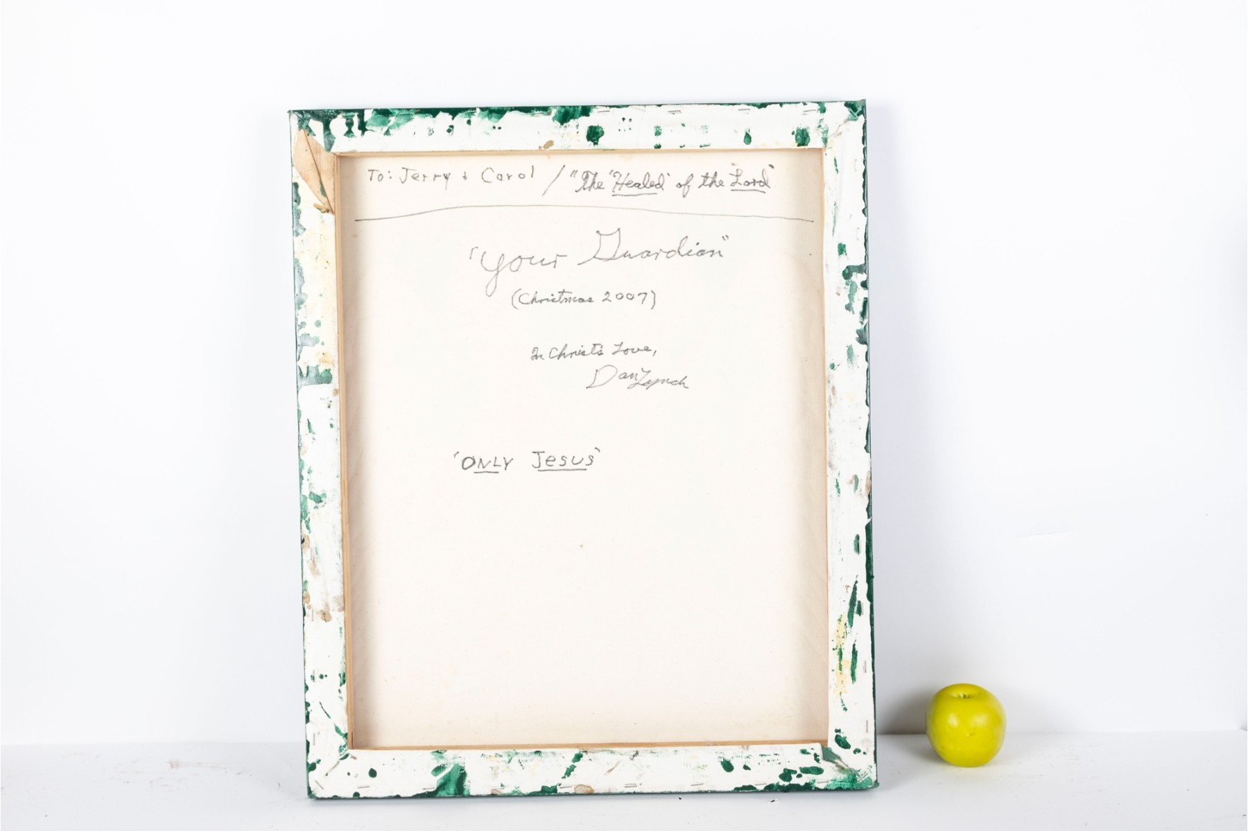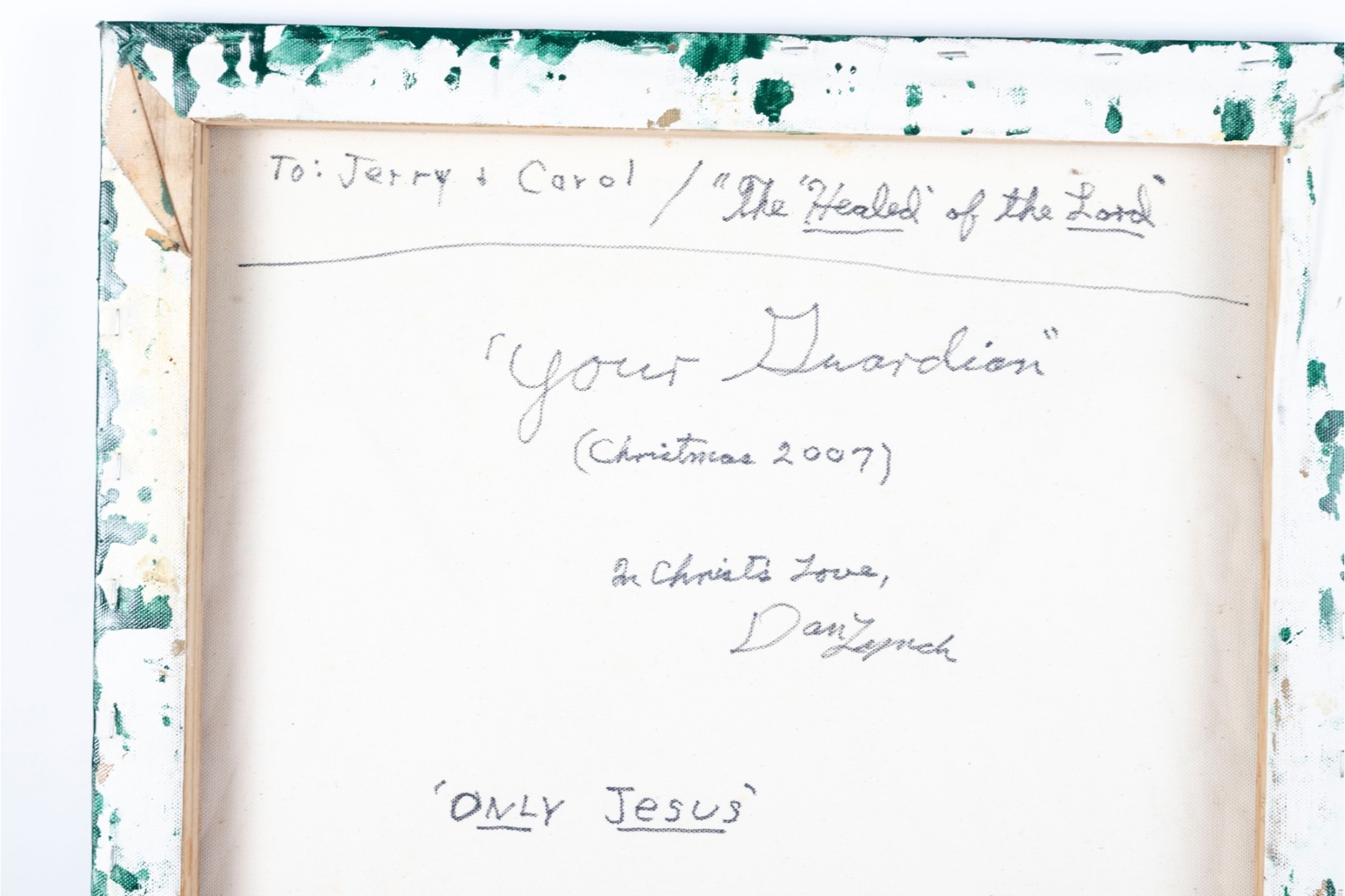 Dan Lynch (American [SC], 1930-2019) "Your Guardian" mixed media on canvas depicting an angel with long brunette hair and silvery wings wearing bright aqua blue bathed in rays of light against a yellow and green-blue sky, posed standing with a peaceful, resting expression. Signed lower right and on the verso with the dedication "To: Jerry + Carol / "The Healed of the Lord"; "Your Guardian" (Christmas 2007); In Christ's Love, Dan Lynch; 'Only Jesus.'" The canvas is mounted to a stretcher, unframed.