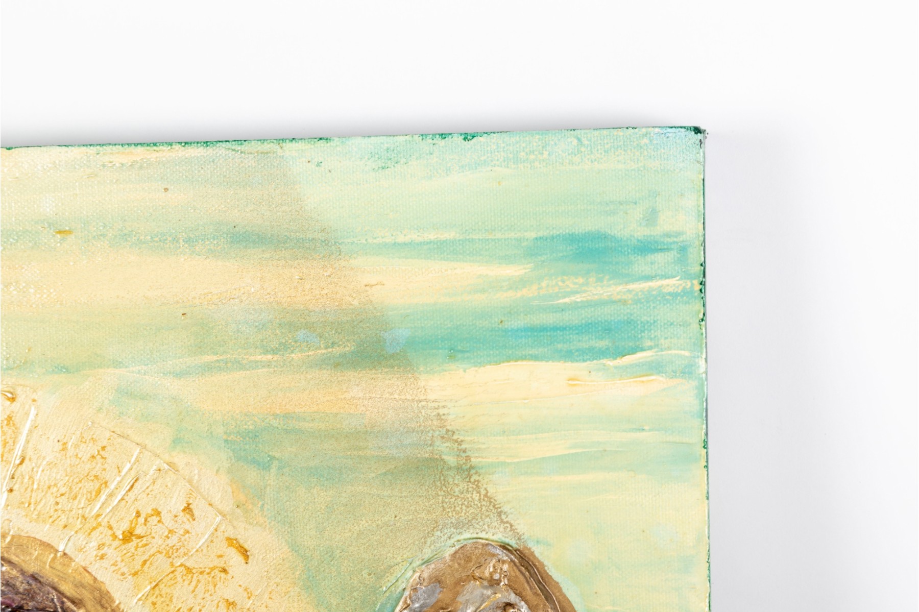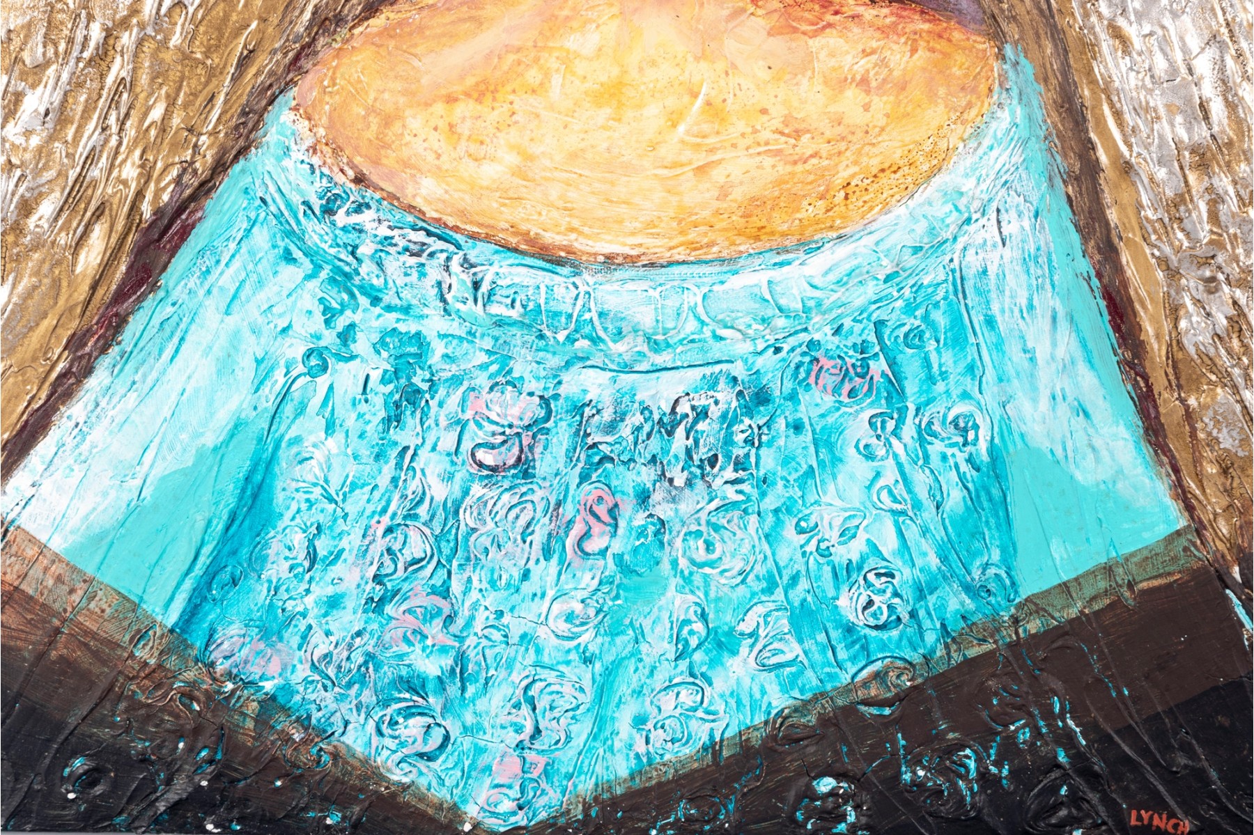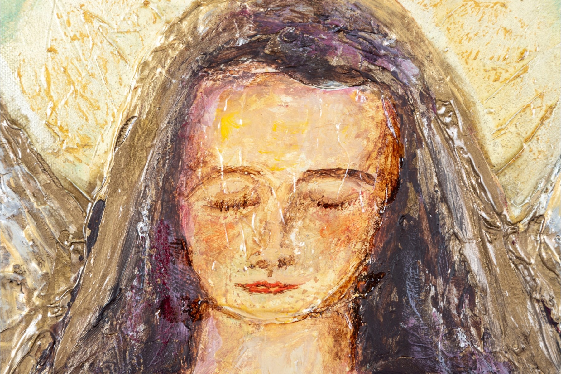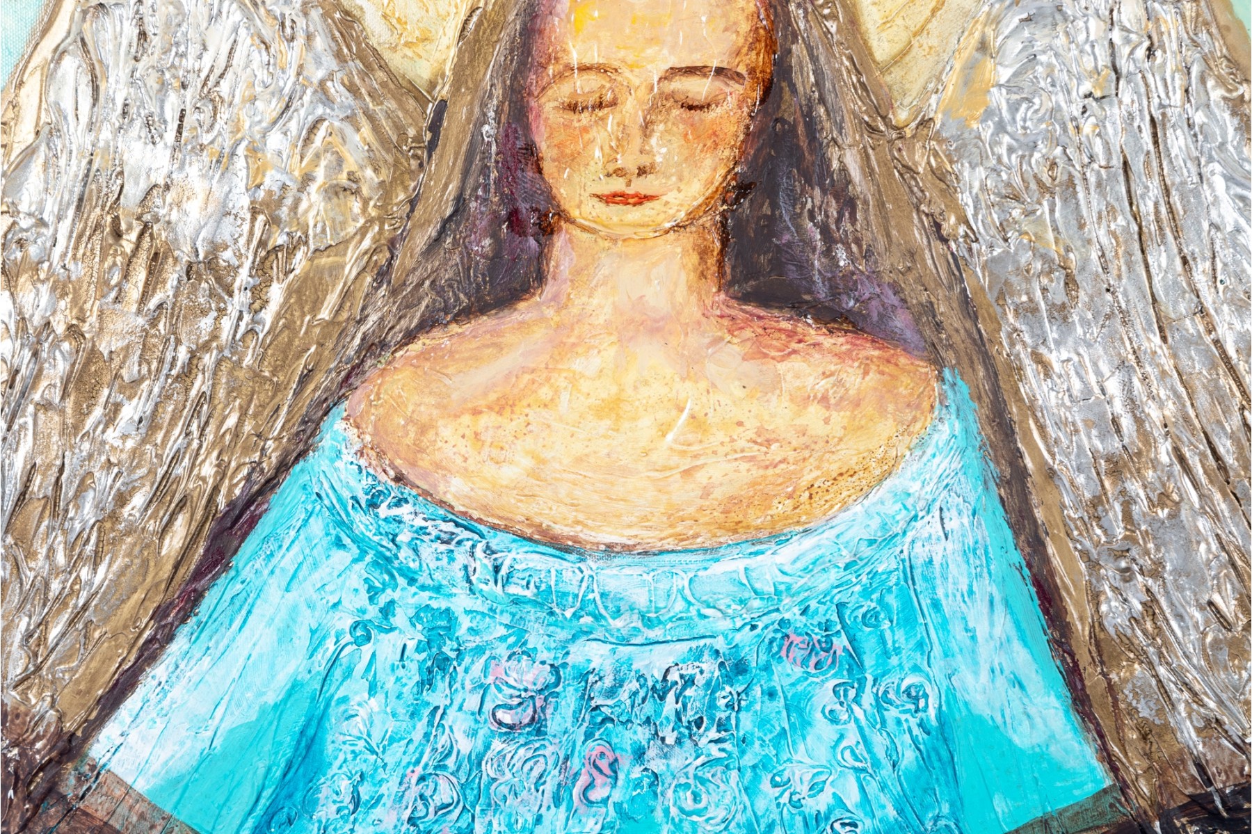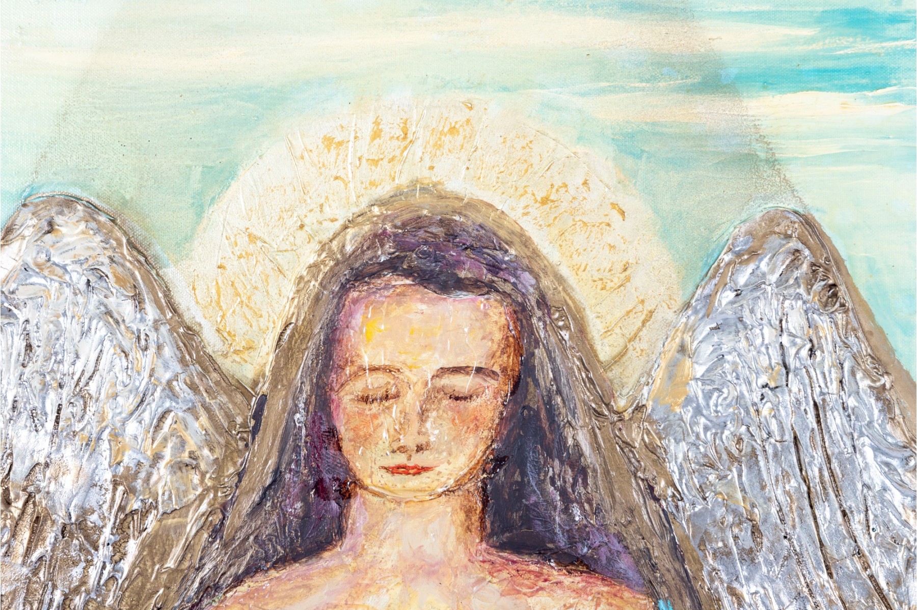Dan Lynch (American [SC], 1930-2019) "Your Guardian" mixed media on canvas depicting an angel with long brunette hair and silvery wings wearing bright aqua blue bathed in rays of light against a yellow and green-blue sky, posed standing with a peaceful, resting expression. Signed lower right and on the verso with the dedication "To: Jerry + Carol / "The Healed of the Lord"; "Your Guardian" (Christmas 2007); In Christ's Love, Dan Lynch; 'Only Jesus.'" The canvas is mounted to a stretcher, unframed.