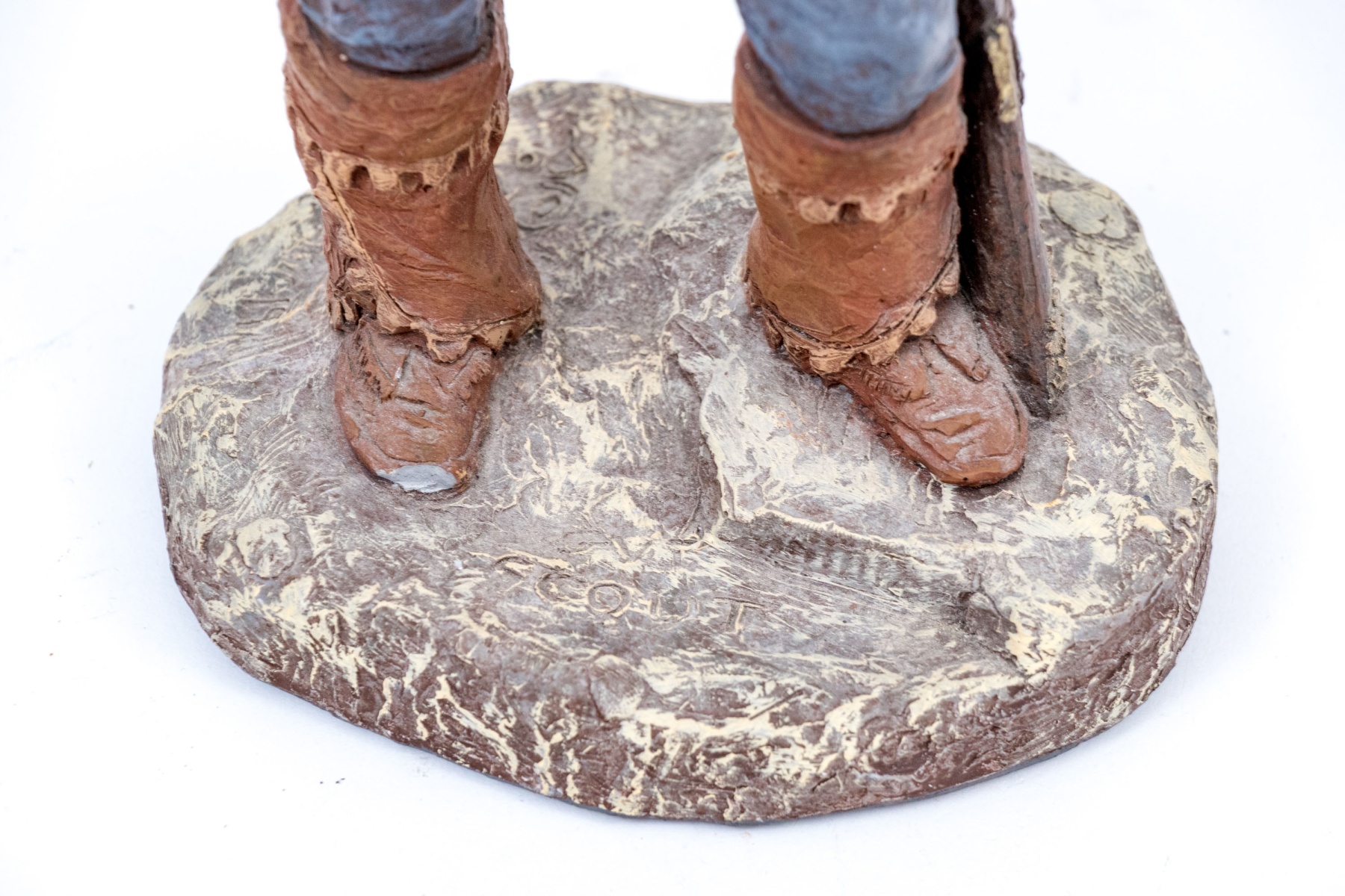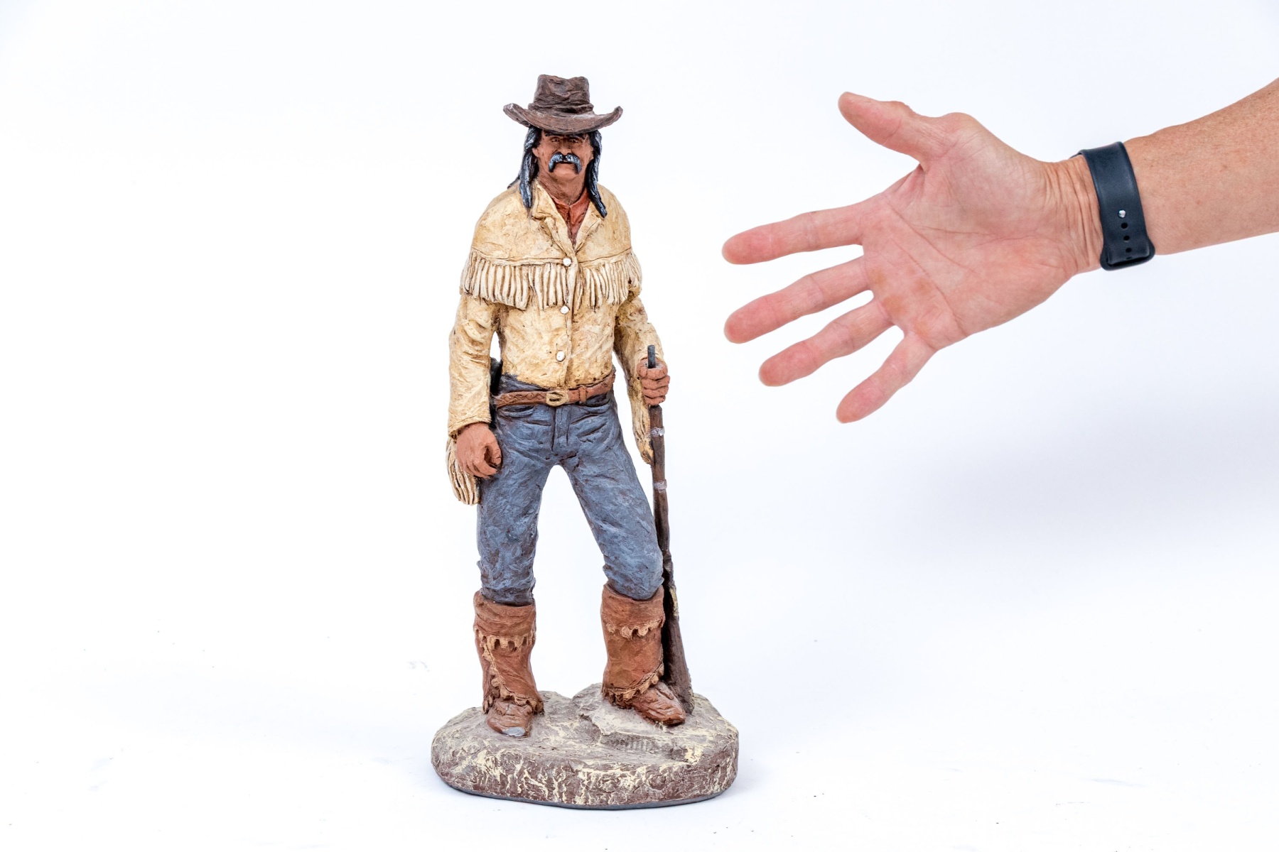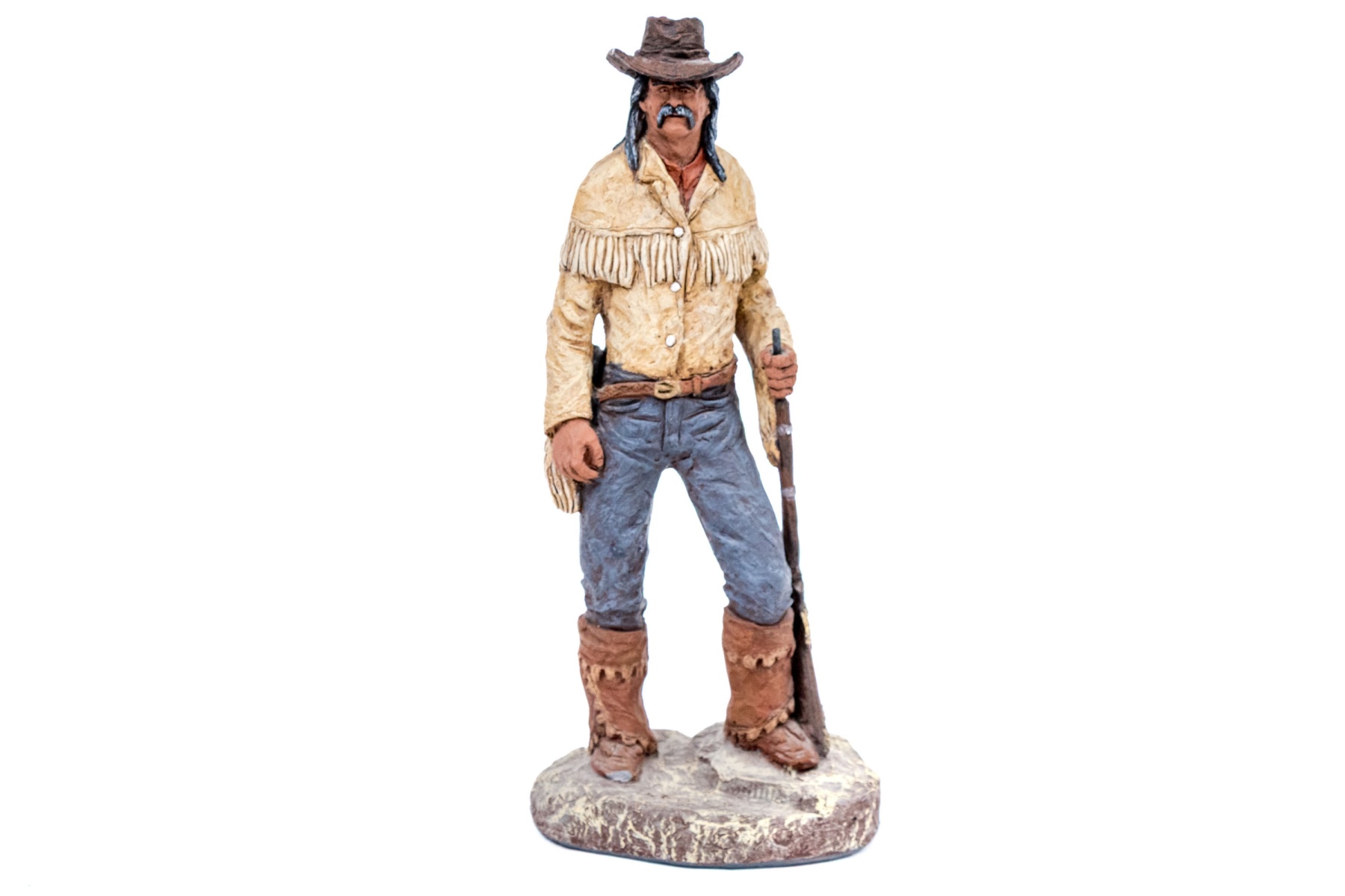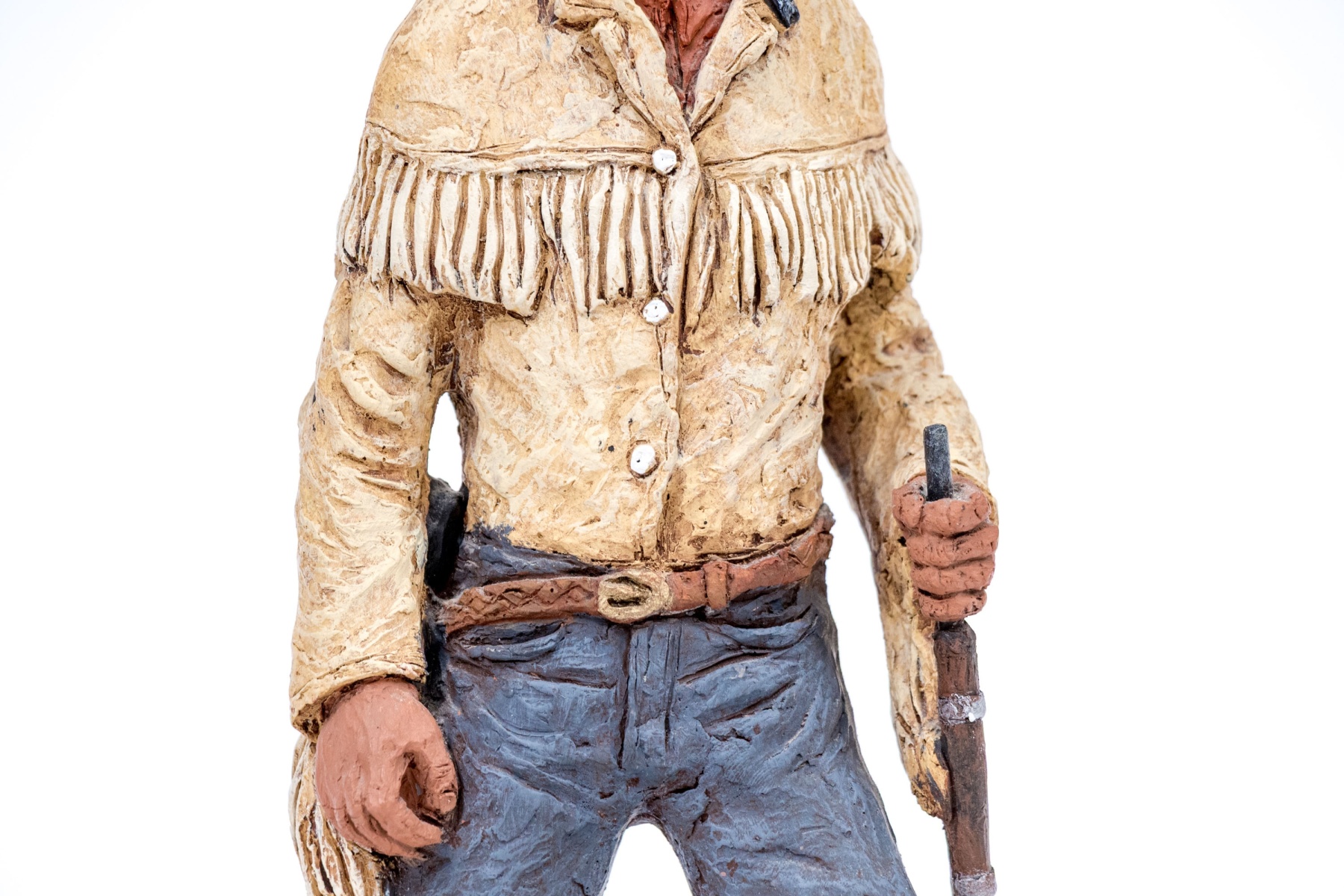Daniel Monfort (American, b. 1942) "Scout" sculpture depicting a man in Western attire including a brown brimmed hat, light leather shirt with tassel trim, and denim jeans with brown leather boots. The man poses looking forward with one foot raised over a stone, holding a rifle over a rocky base. Titled on the base and bearing a sticker label underfoot.