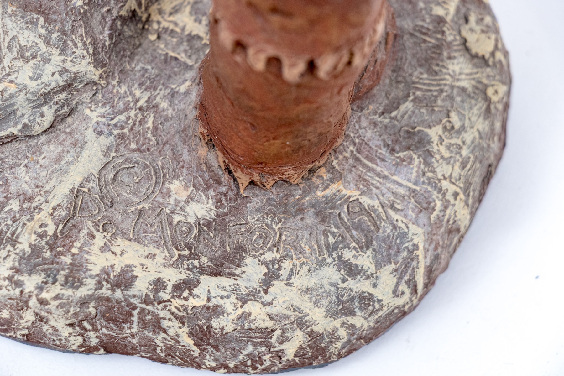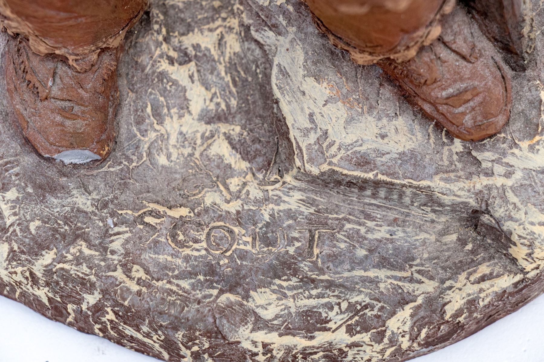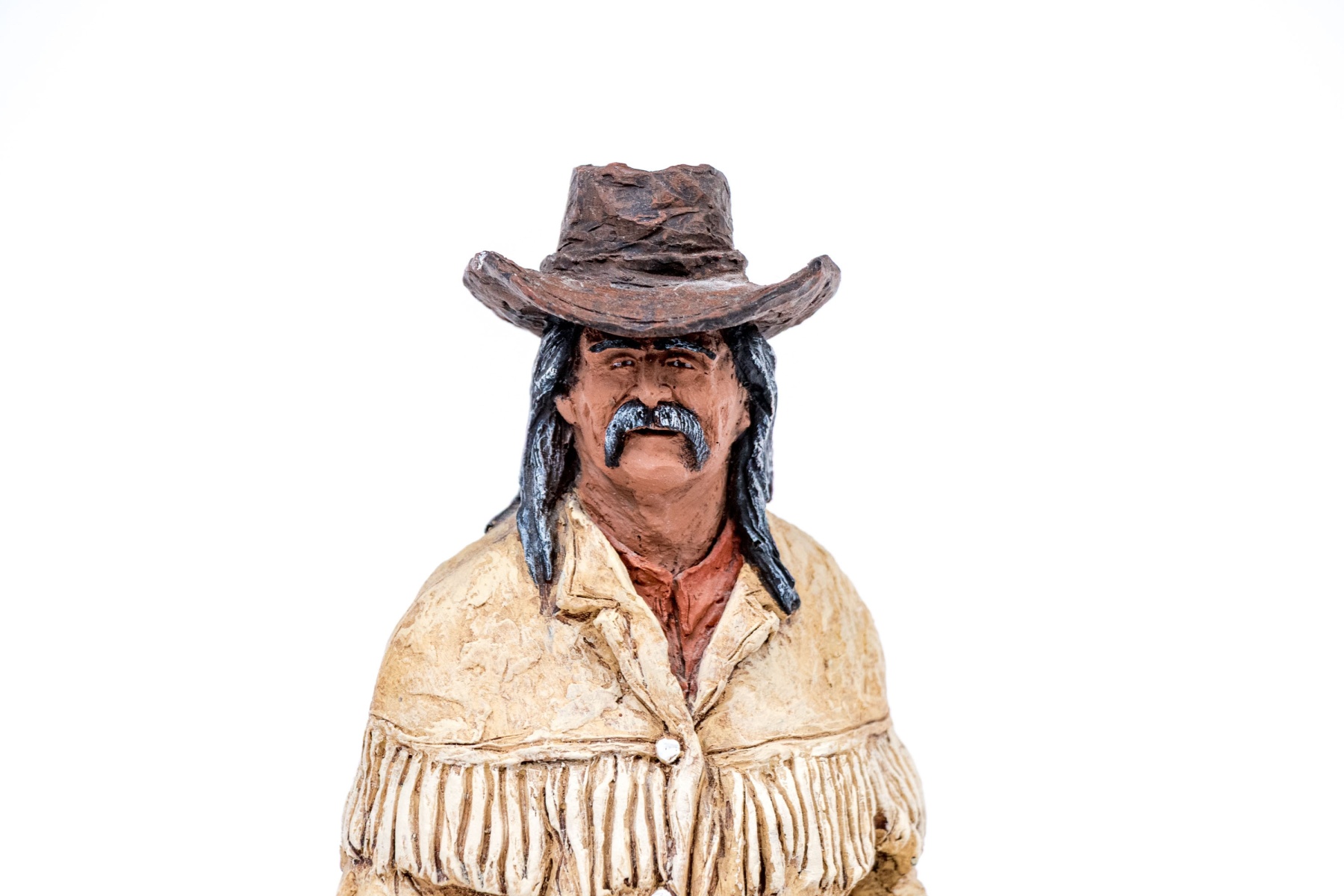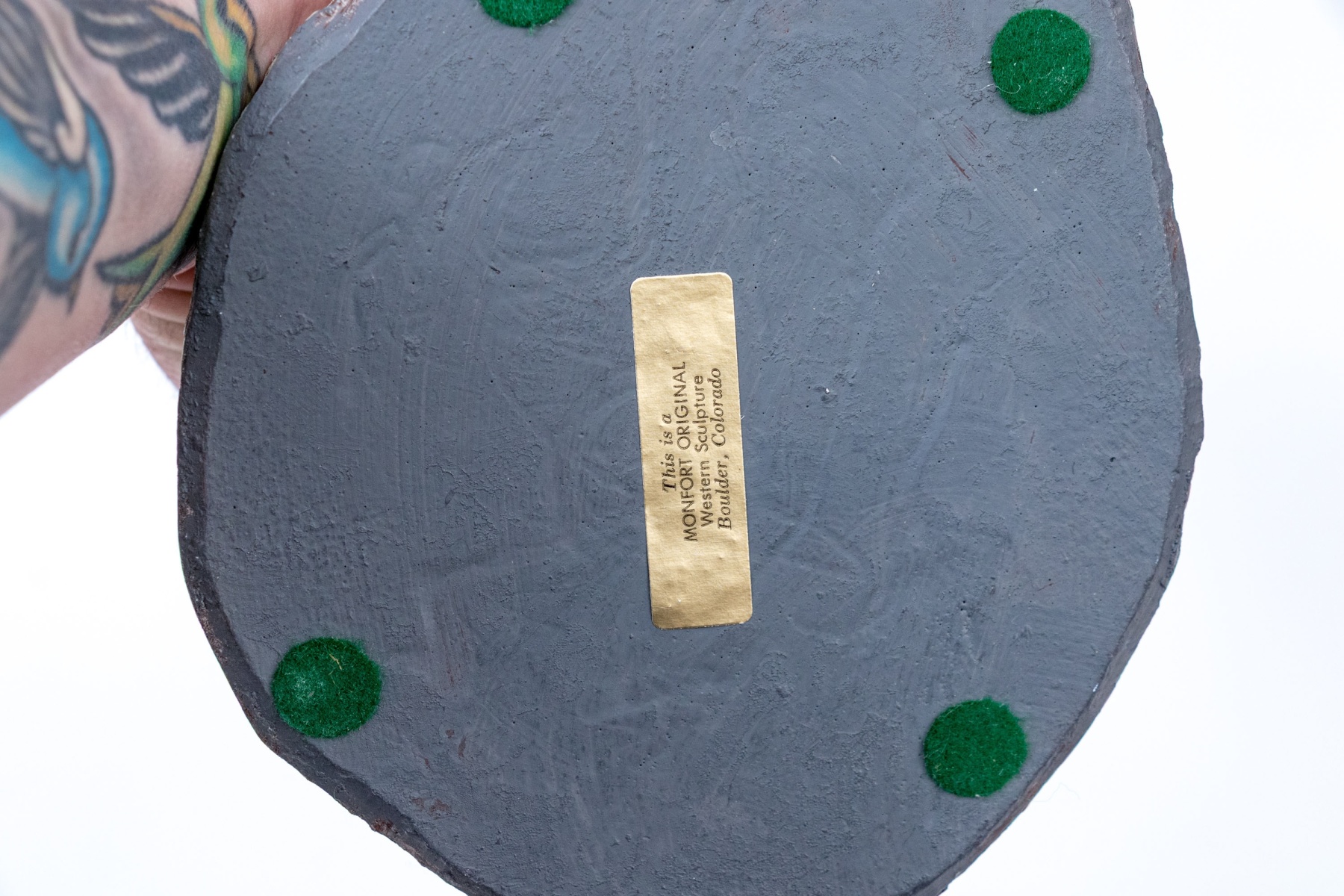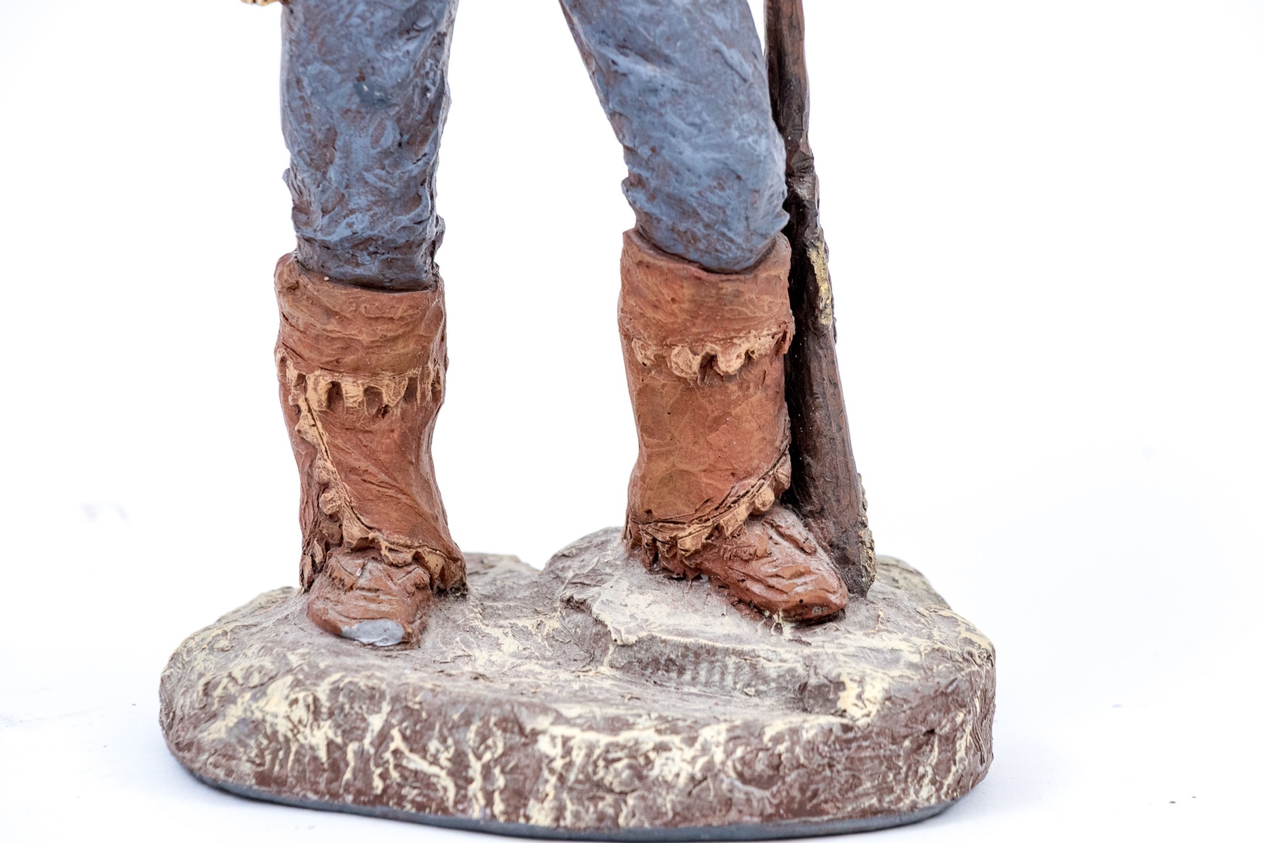 Daniel Monfort (American, b. 1942) "Scout" sculpture depicting a man in Western attire including a brown brimmed hat, light leather shirt with tassel trim, and denim jeans with brown leather boots. The man poses looking forward with one foot raised over a stone, holding a rifle over a rocky base. Titled on the base and bearing a sticker label underfoot.