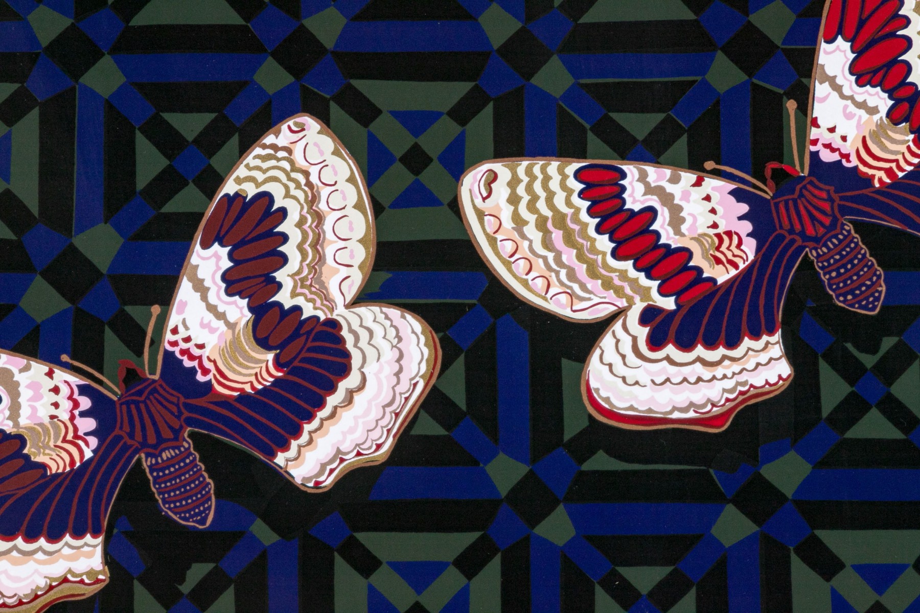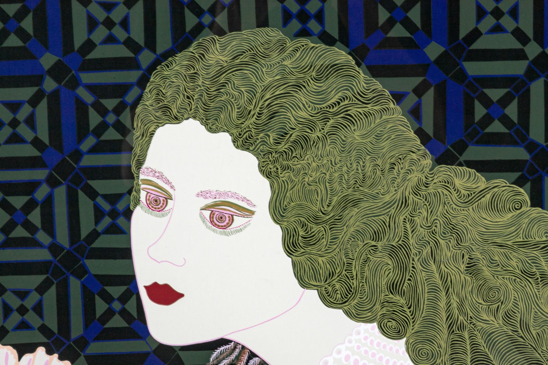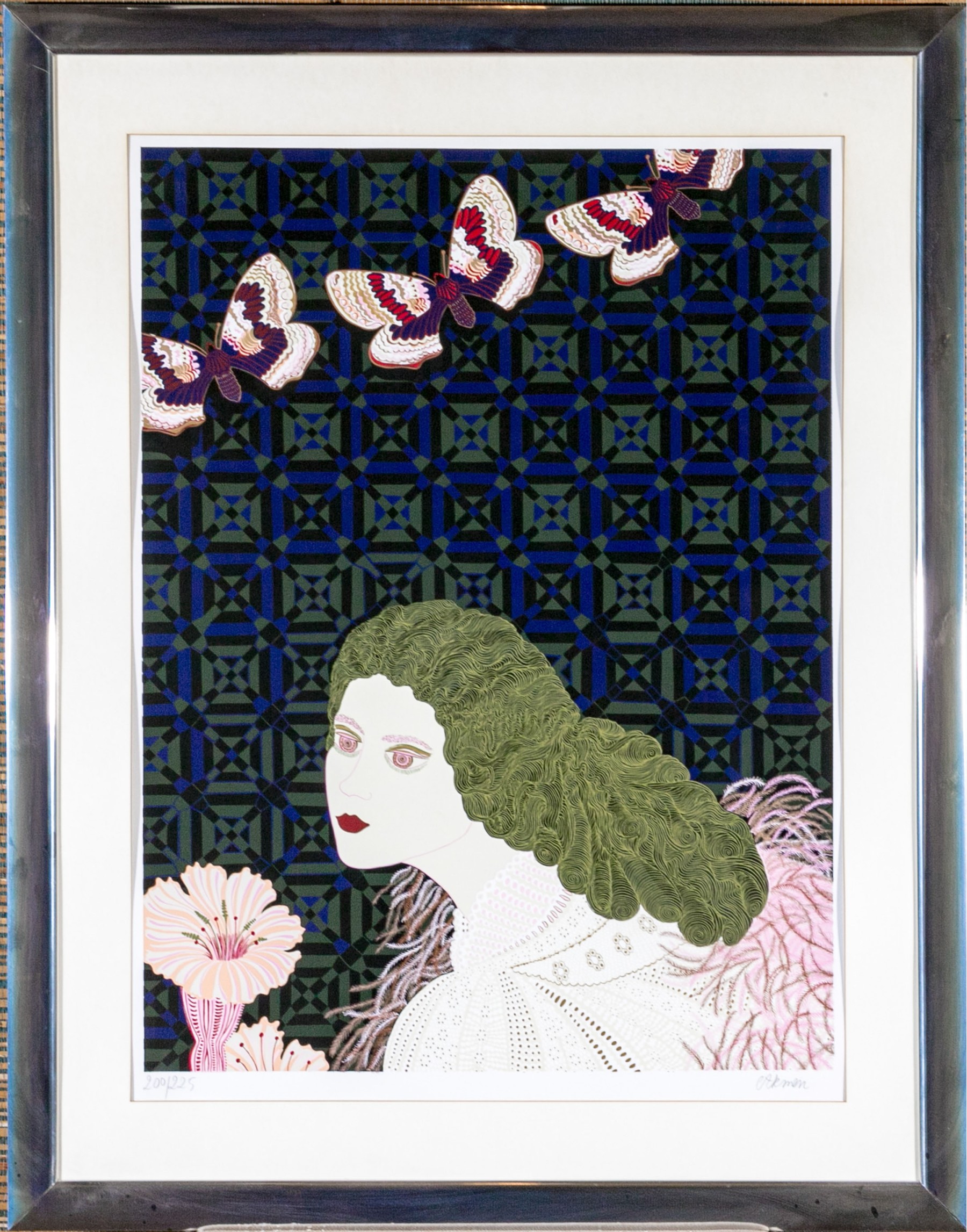 Serigraph depicting a surrealist woman with pink eyes, green hair and a flower, beneath butterflies.