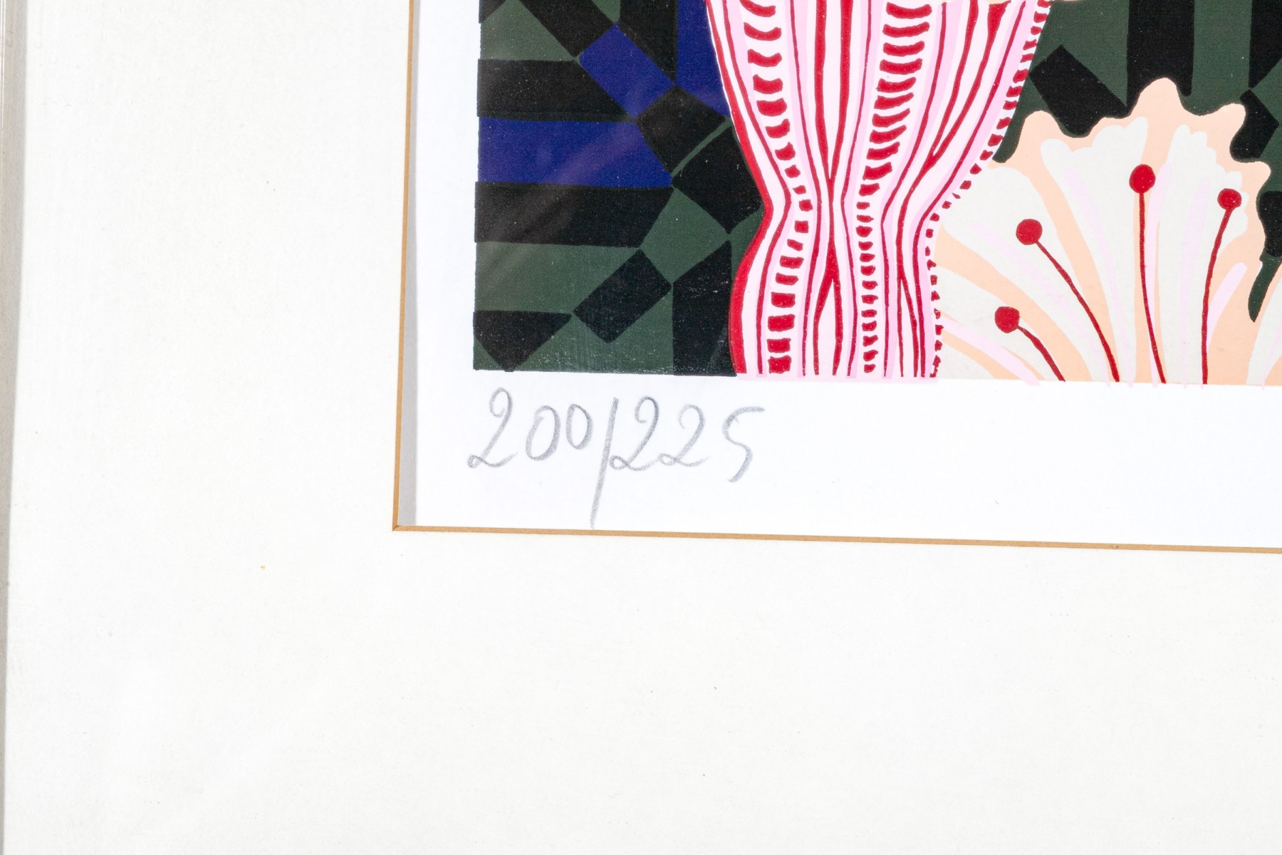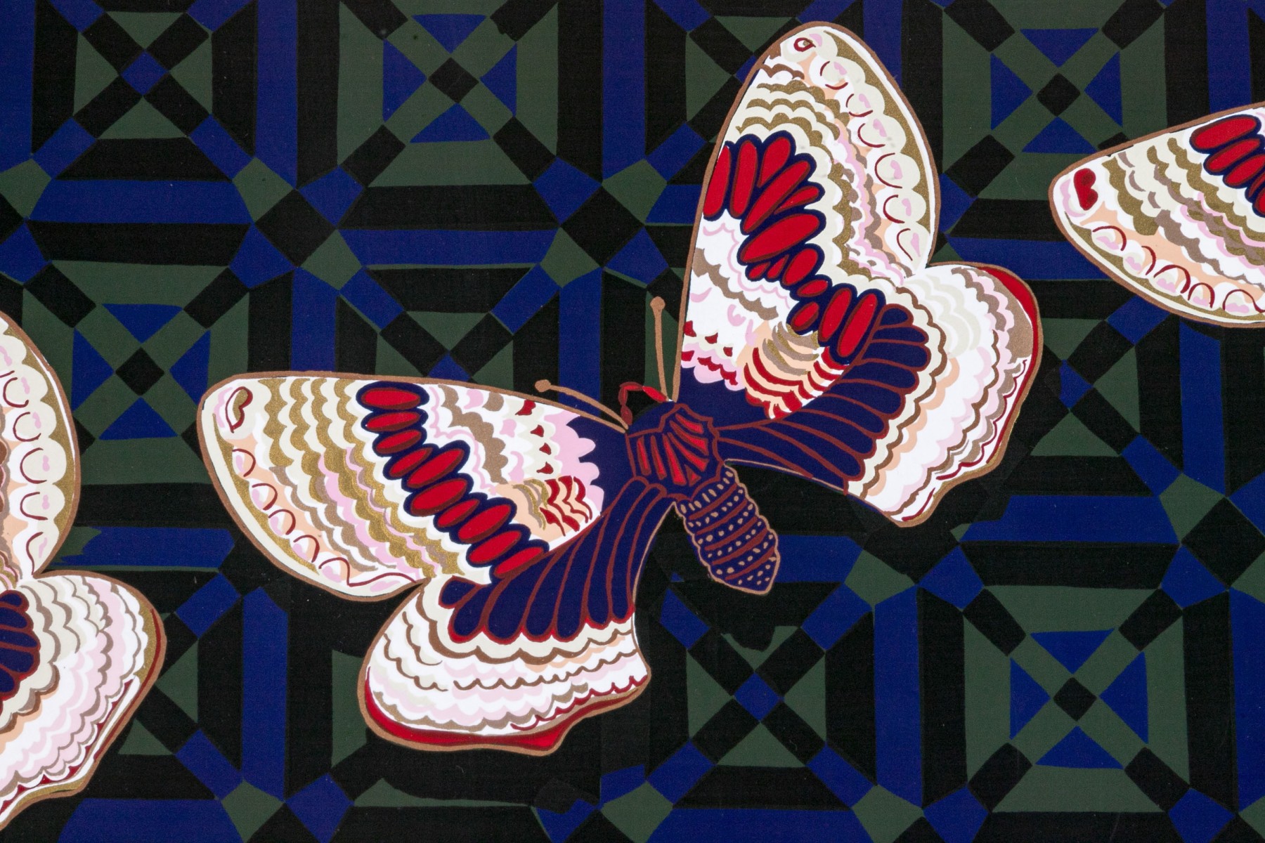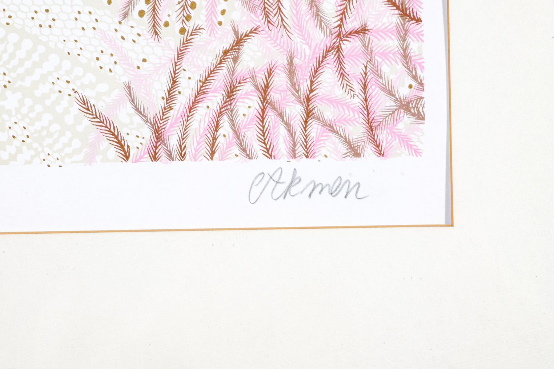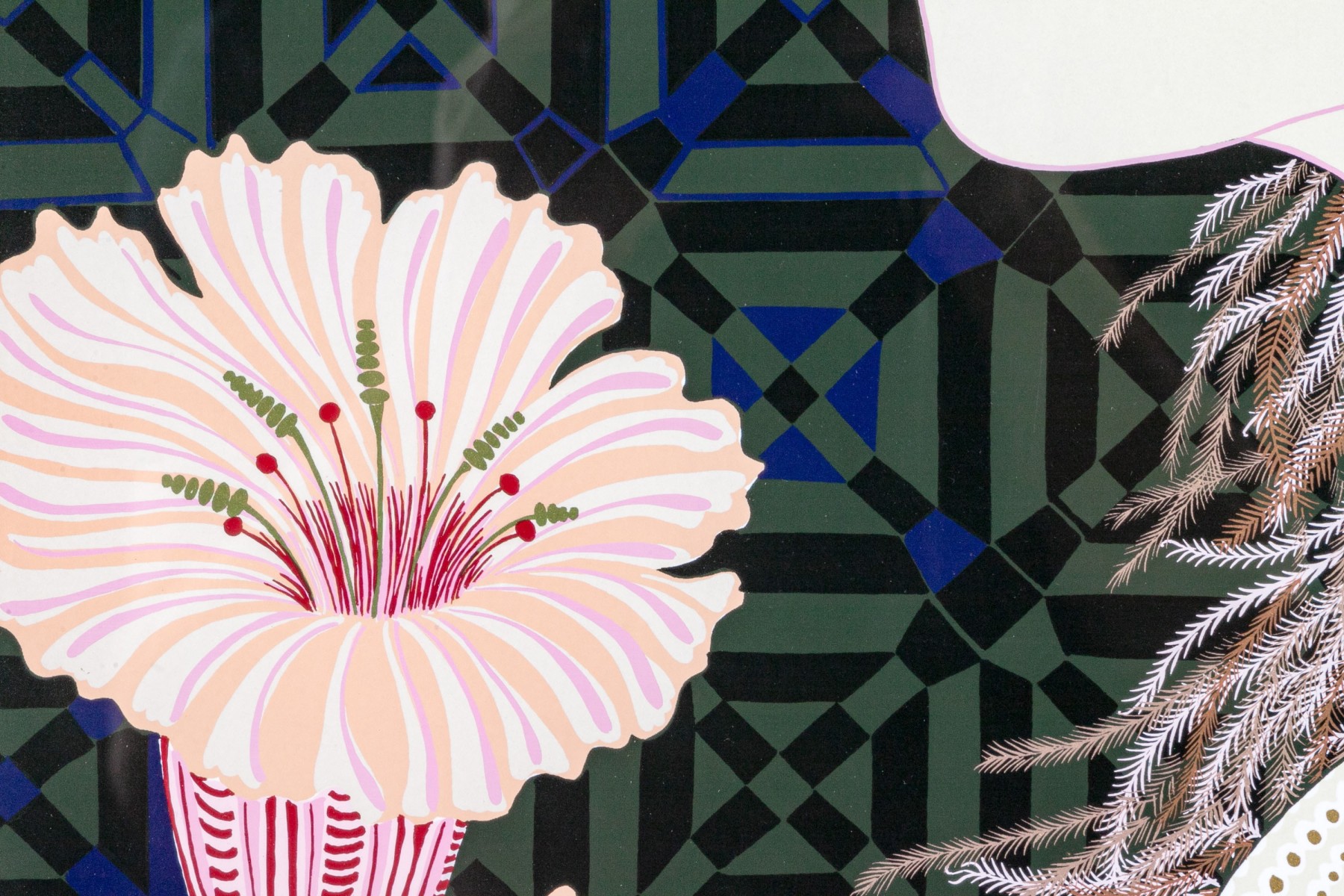 Serigraph depicting a surrealist woman with pink eyes, green hair and a flower, beneath butterflies.