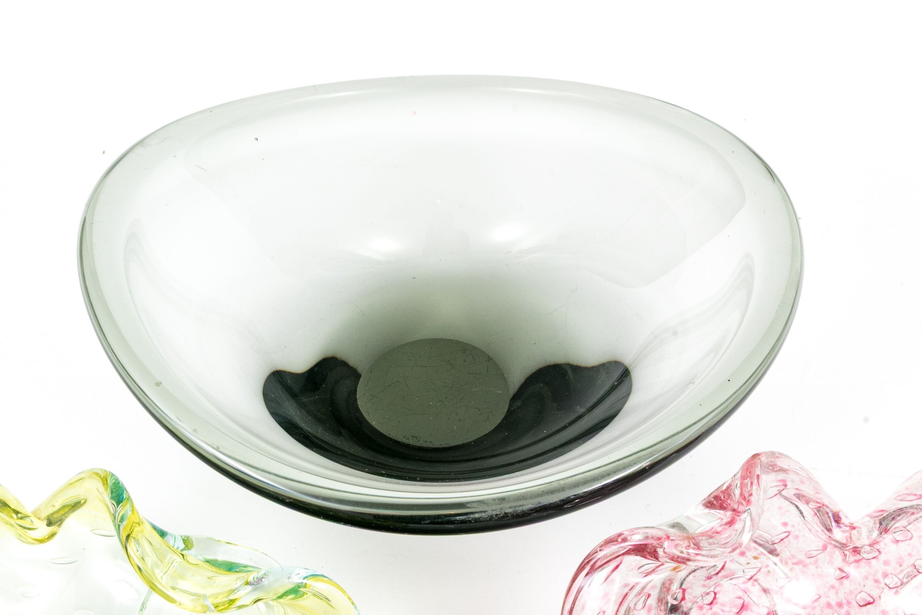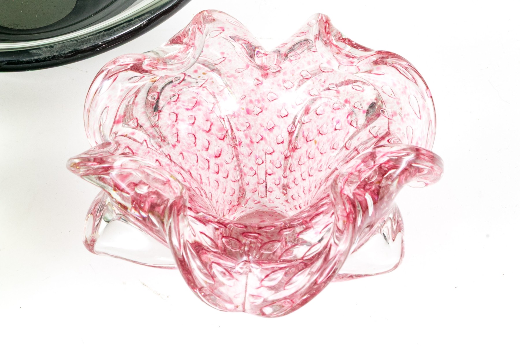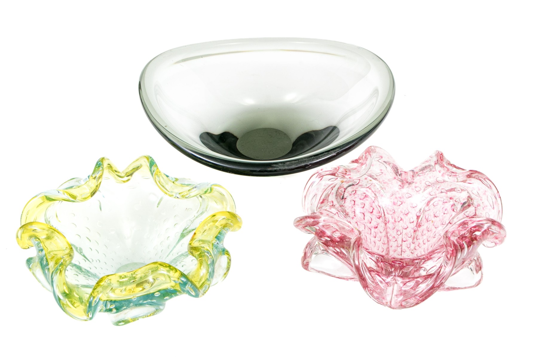 A wonderful trio of glass bowls comprised of a Danish bowl signed underfoot and two vintage floral Murano bowls in pretty pink and vibrant chartreuse green both with shapely petaled rims and suspended bubbles.