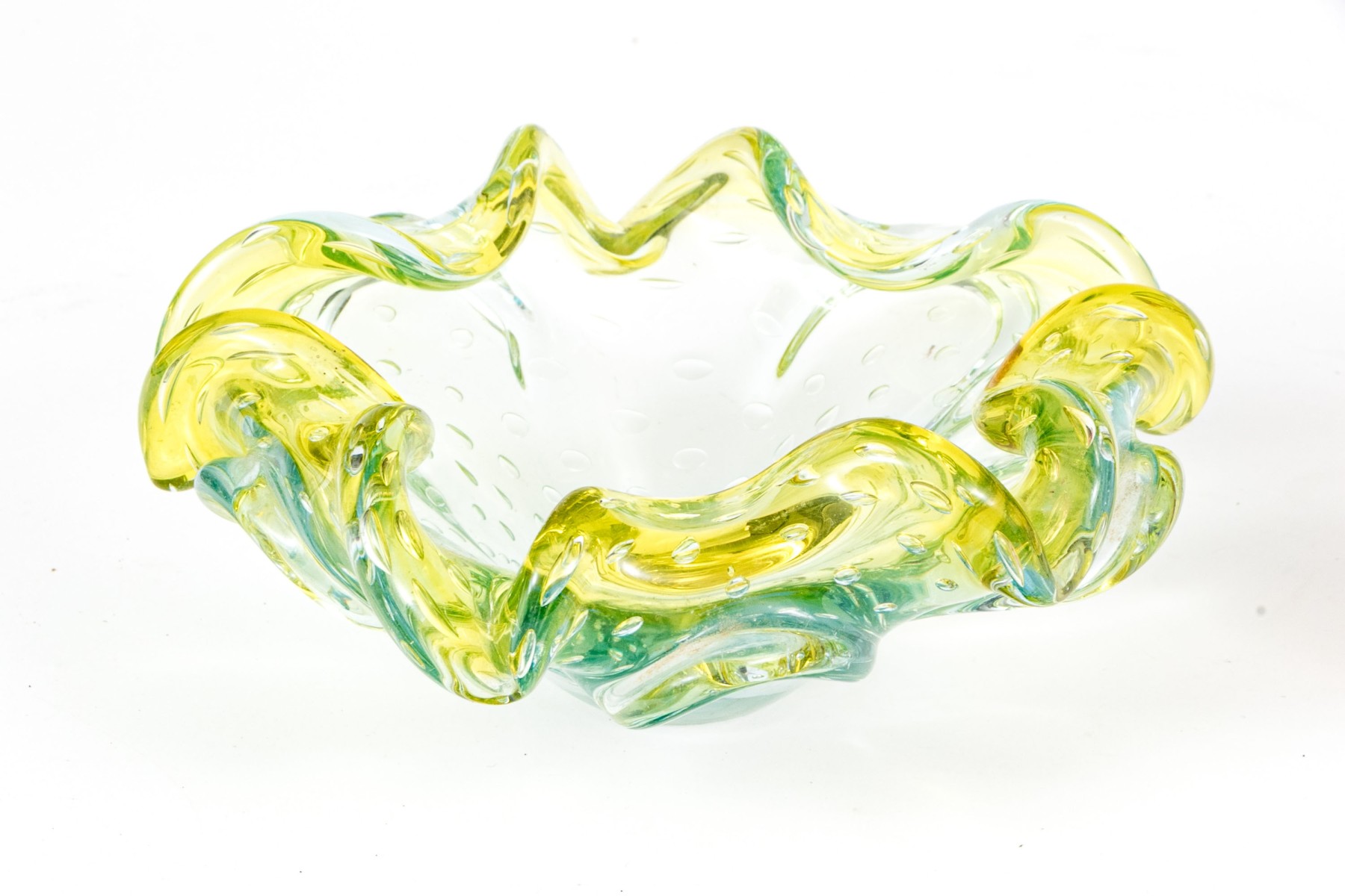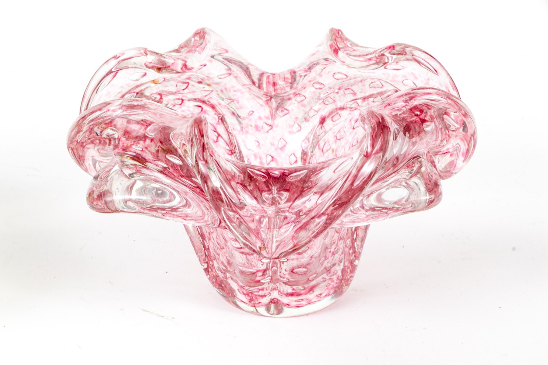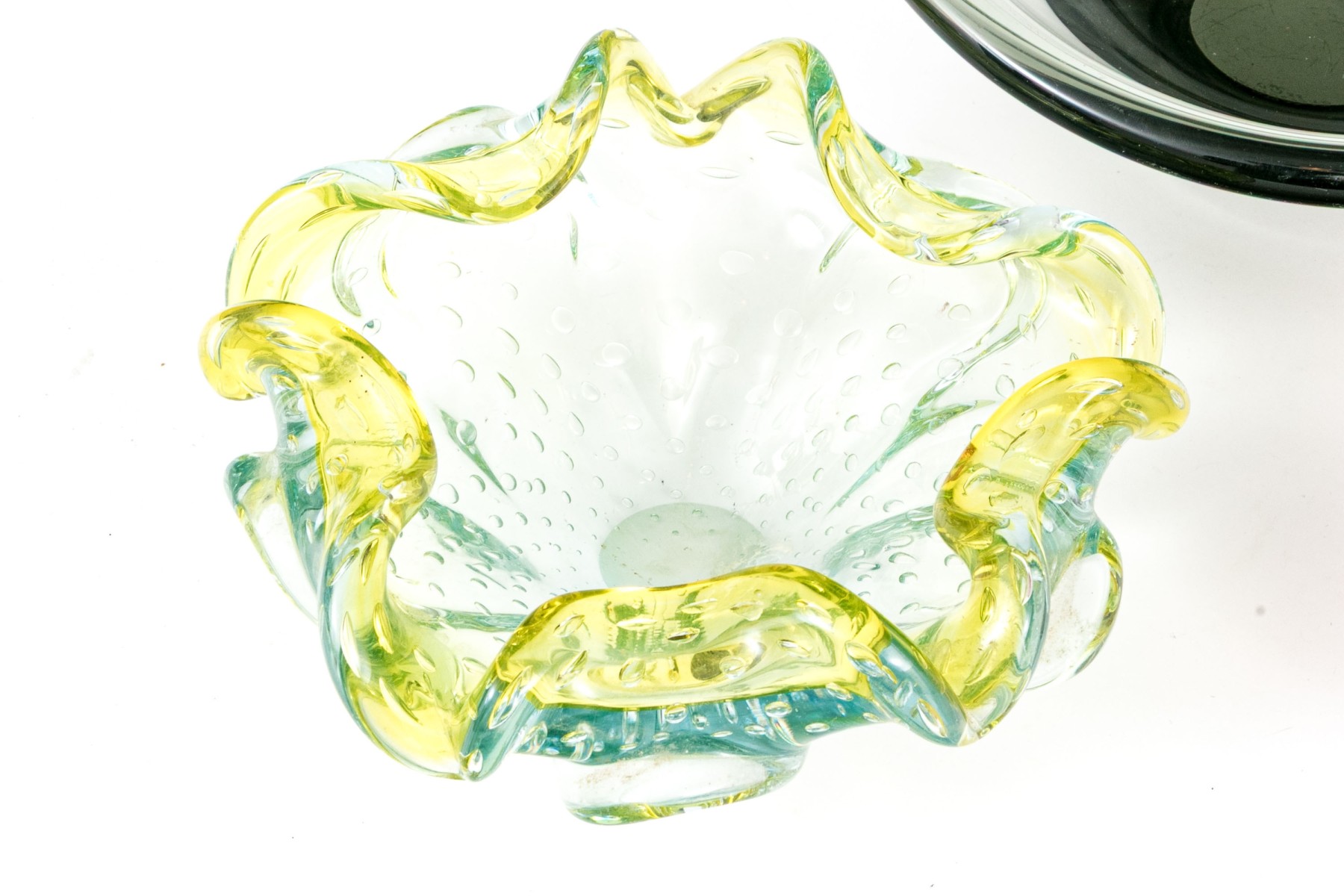 A wonderful trio of glass bowls comprised of a Danish bowl signed underfoot and two vintage floral Murano bowls in pretty pink and vibrant chartreuse green both with shapely petaled rims and suspended bubbles.