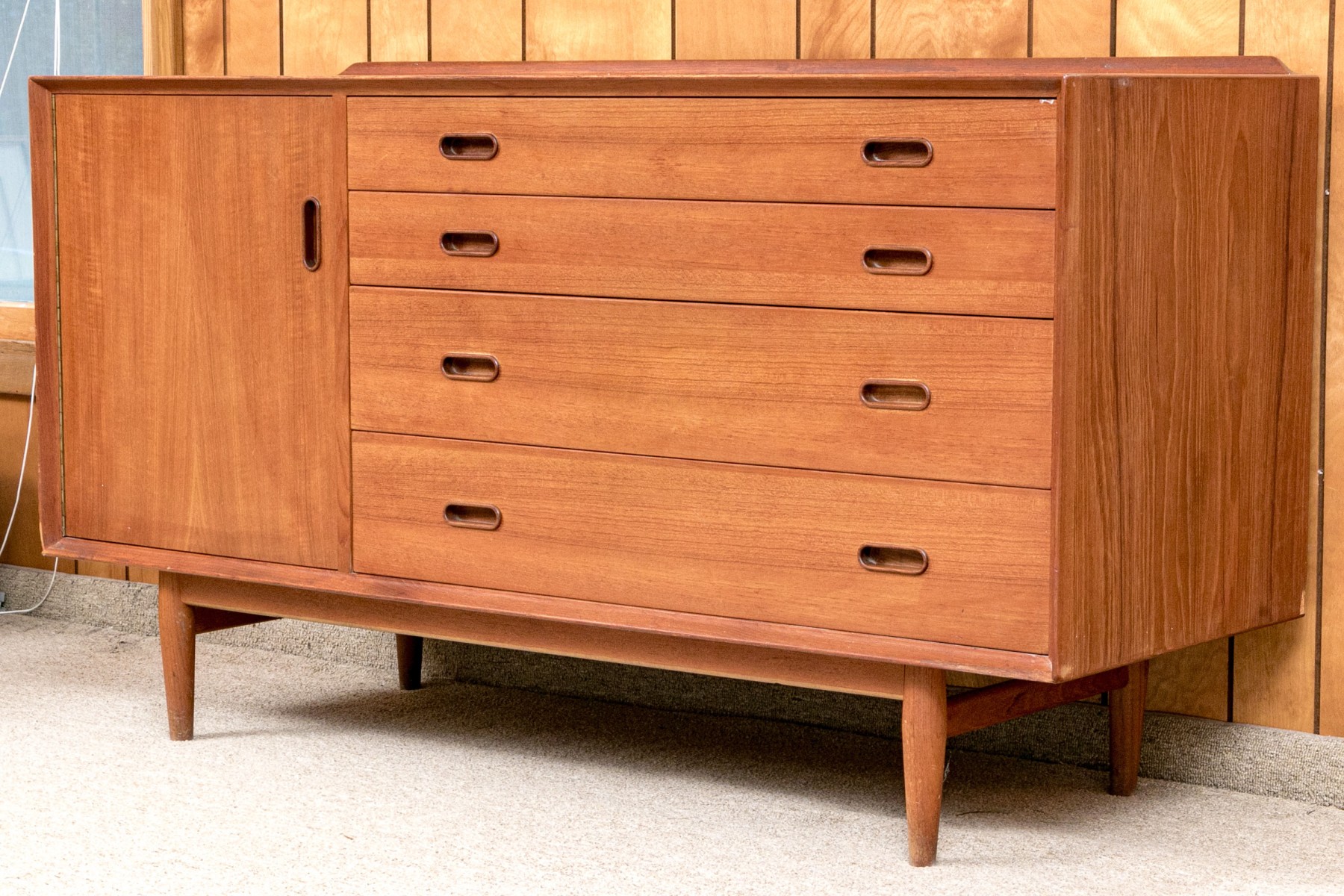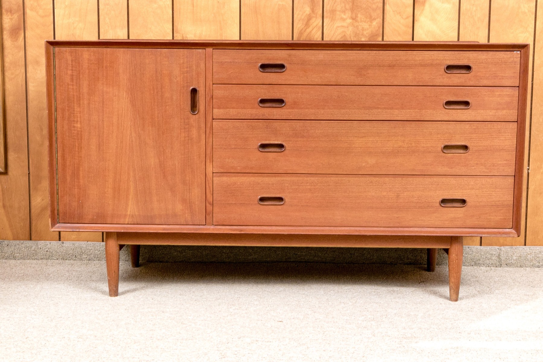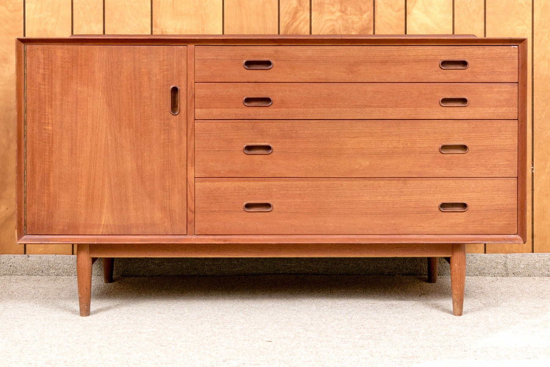 A handsome Arne Vodder for Sibast Furniture Danish mid-century "OS16" credenza in gorgeous, warm brown teak. Features a strong rectangular profile with a single cabinet door opening to a shelved interior to the left, and four graduating drawers to the right, all adorned with sleek, oval pocket handles. Raised on a simple, short apron supported by tapered legs for a classic 50's aesthetic.