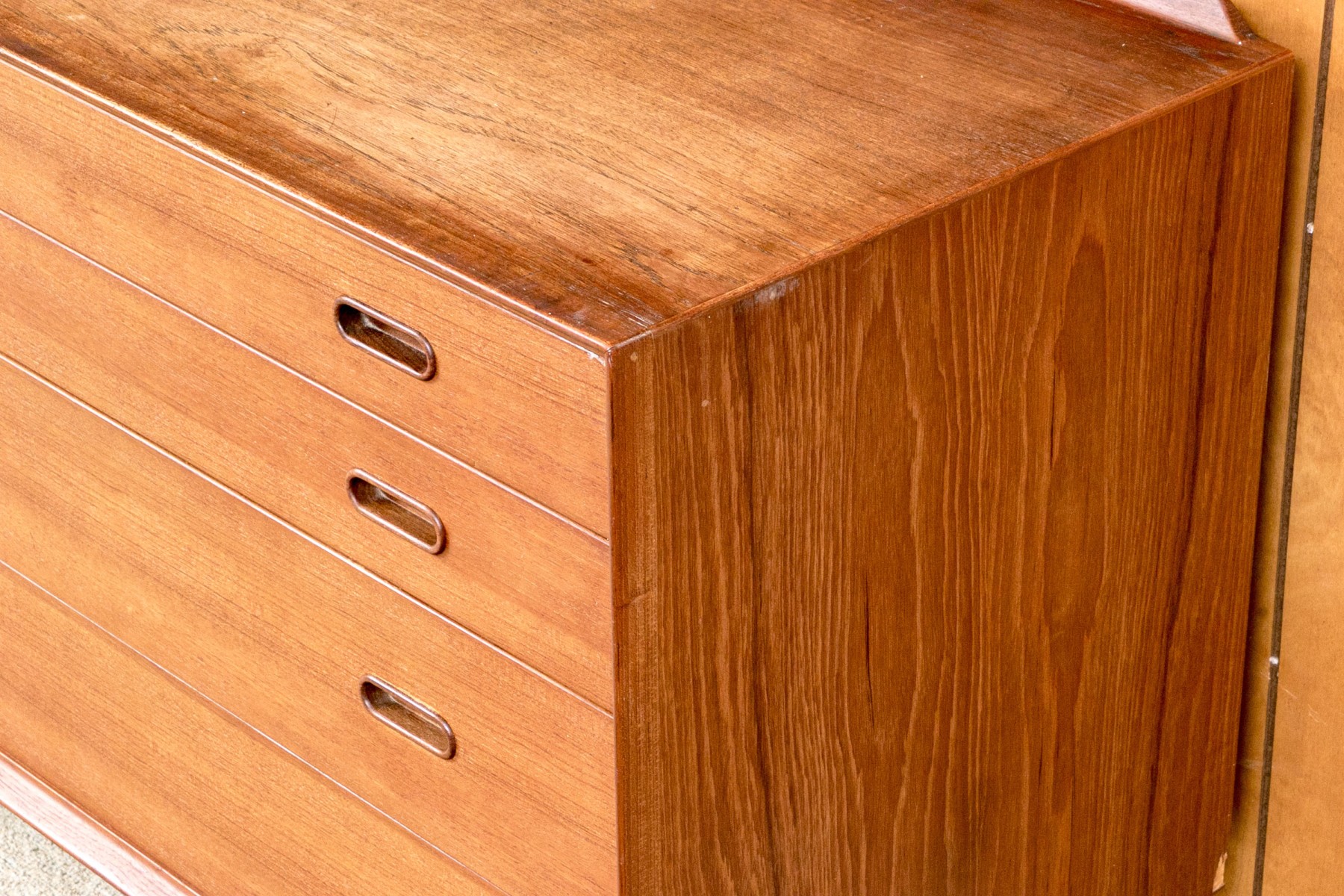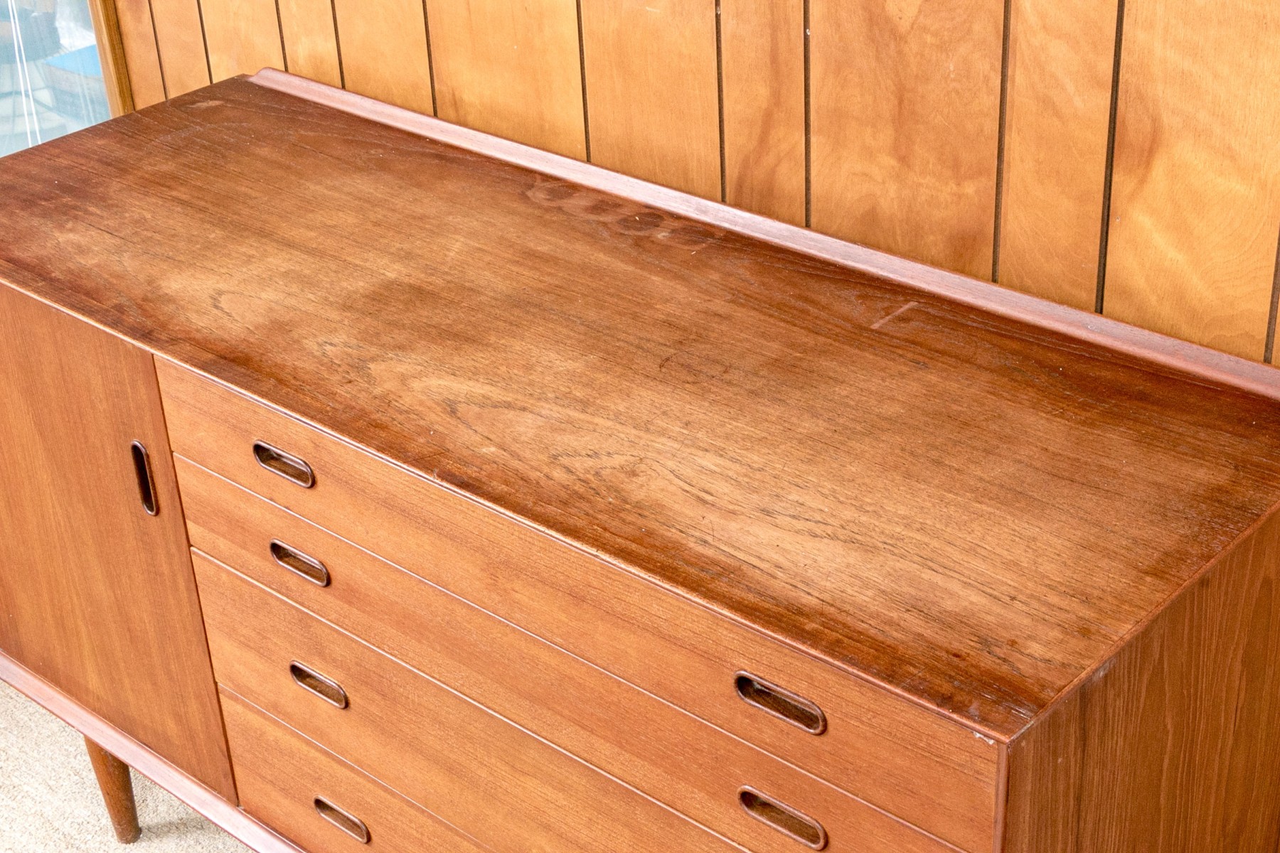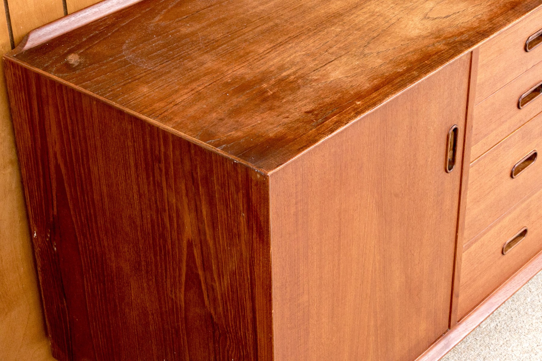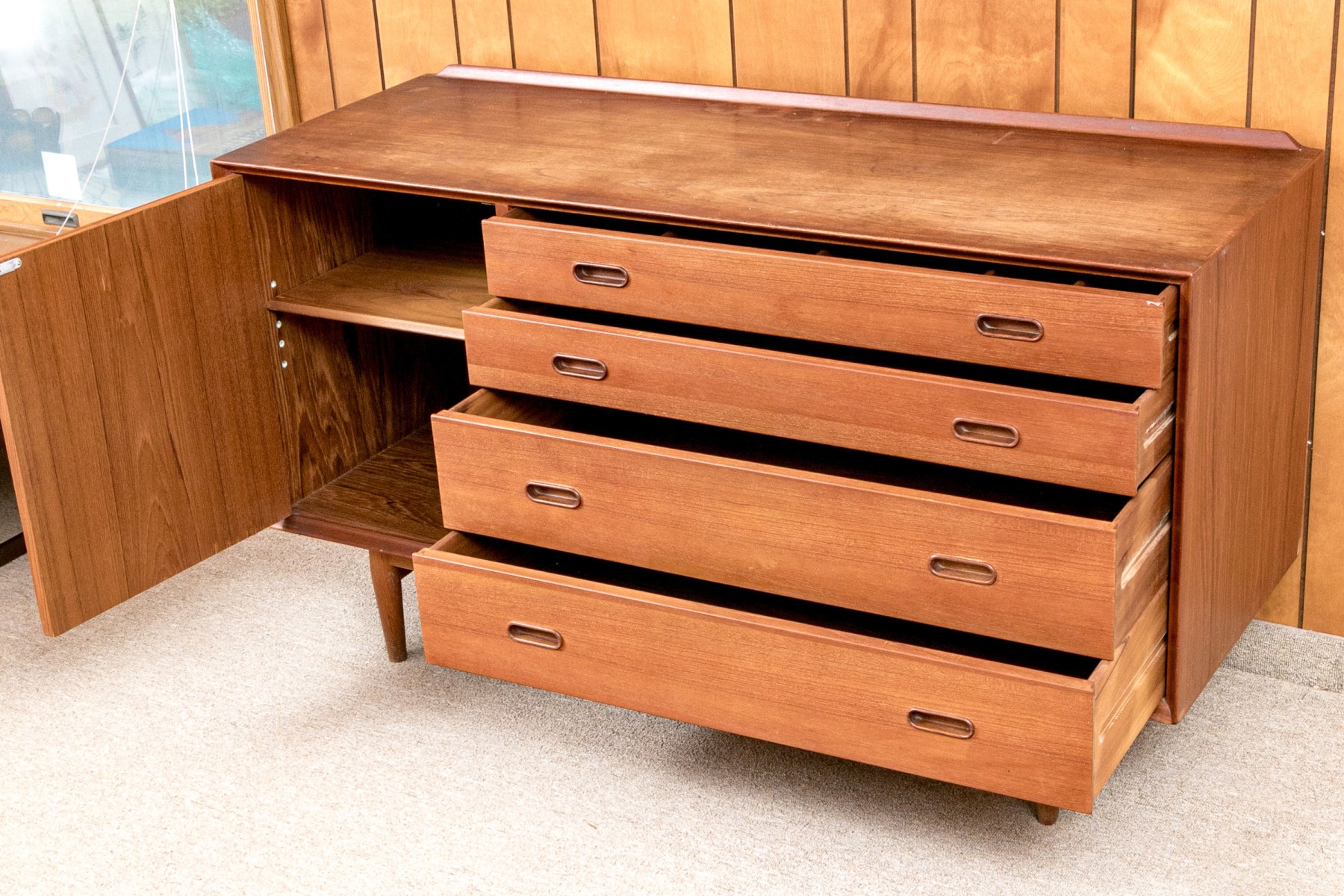 A handsome Arne Vodder for Sibast Furniture Danish mid-century "OS16" credenza in gorgeous, warm brown teak. Features a strong rectangular profile with a single cabinet door opening to a shelved interior to the left, and four graduating drawers to the right, all adorned with sleek, oval pocket handles. Raised on a simple, short apron supported by tapered legs for a classic 50's aesthetic.