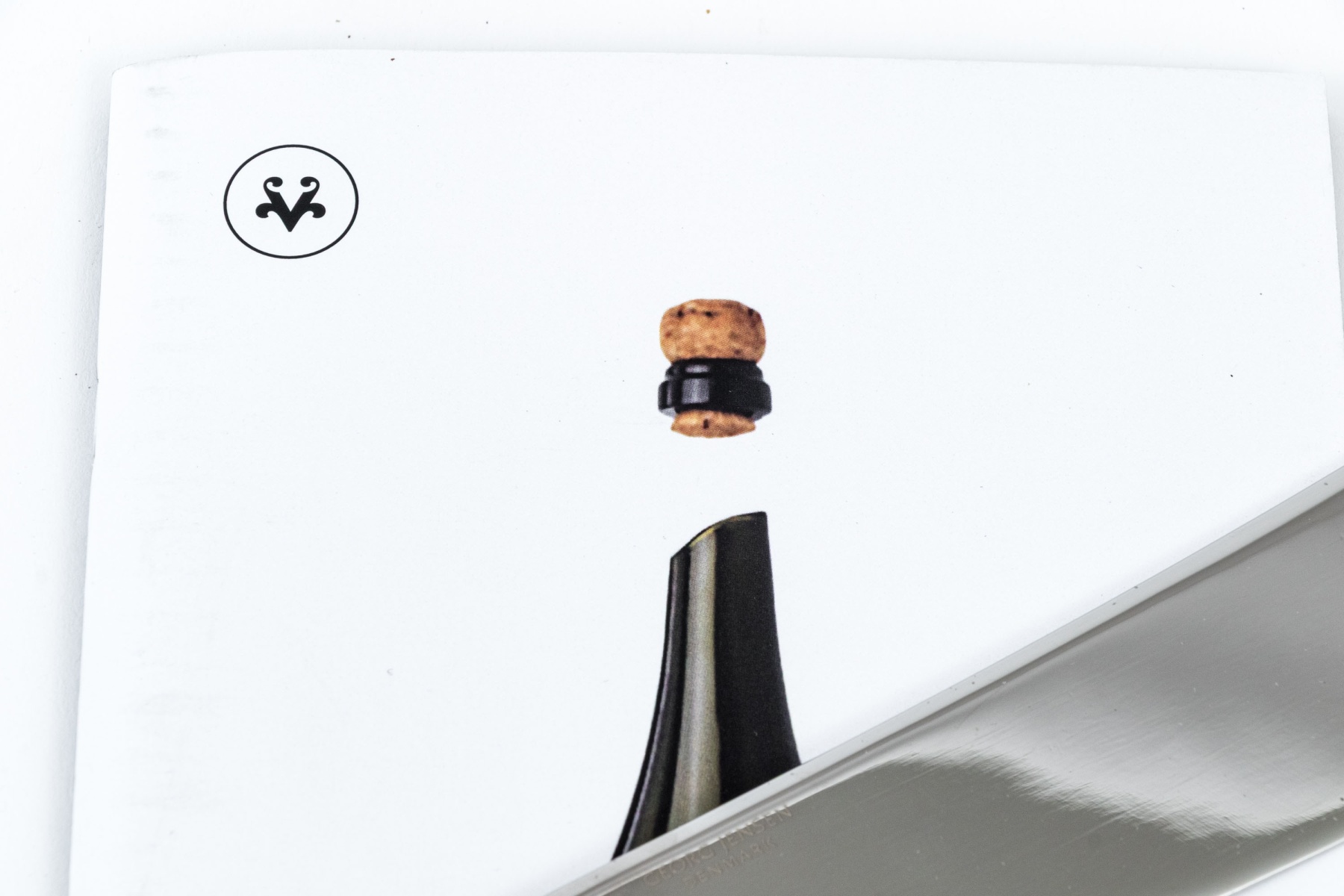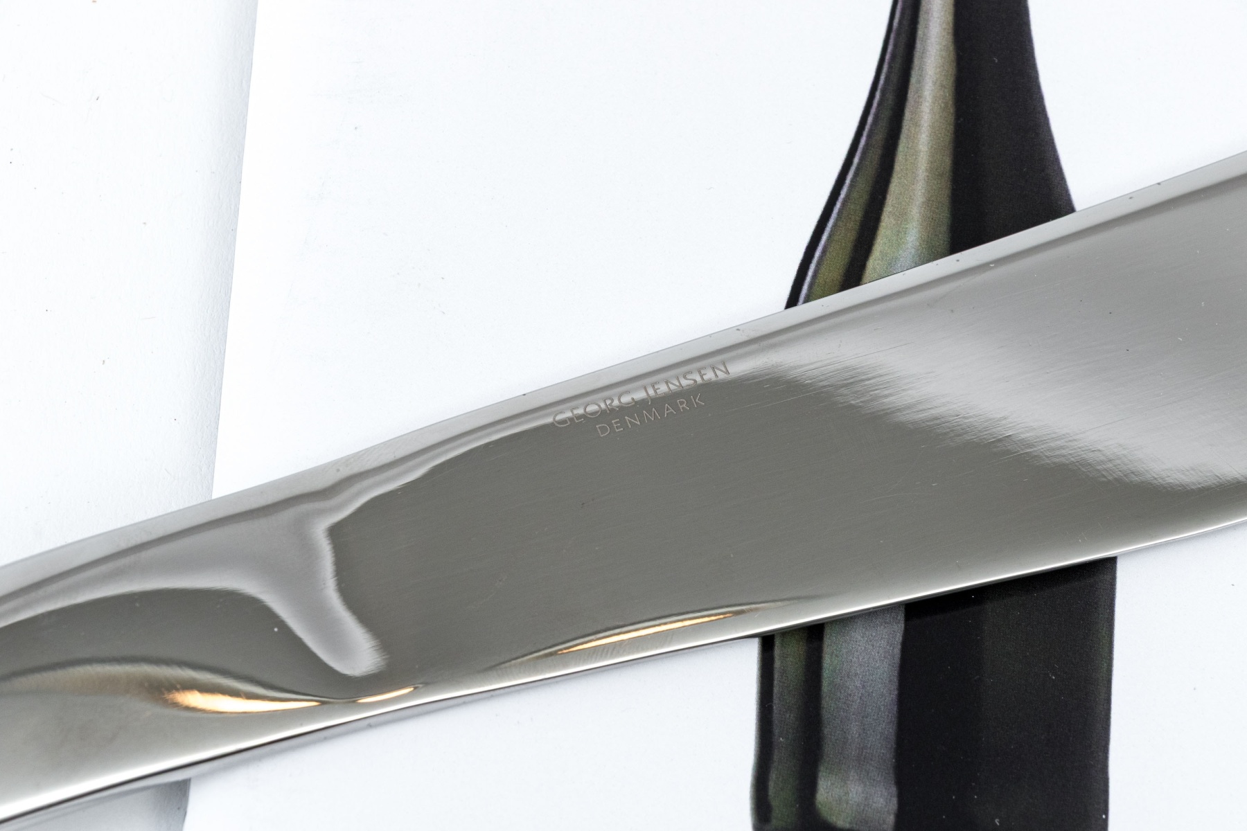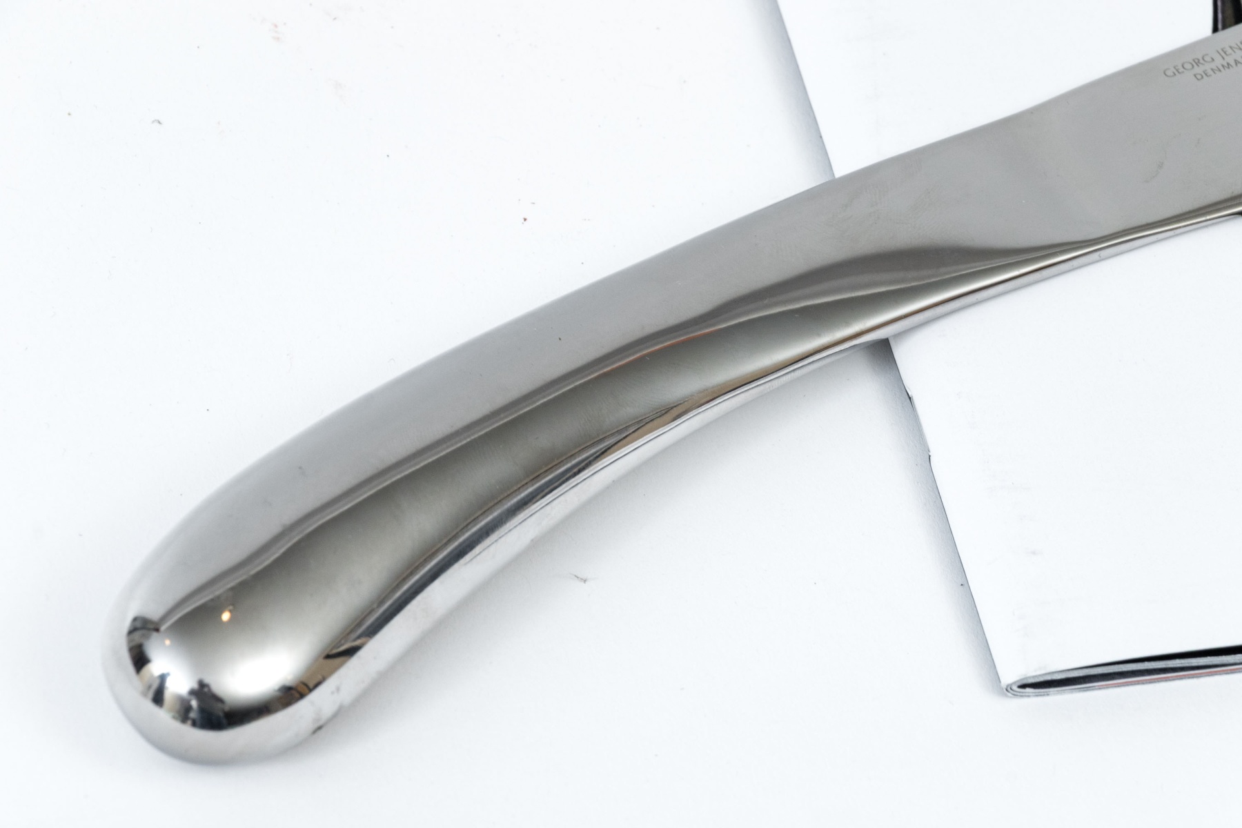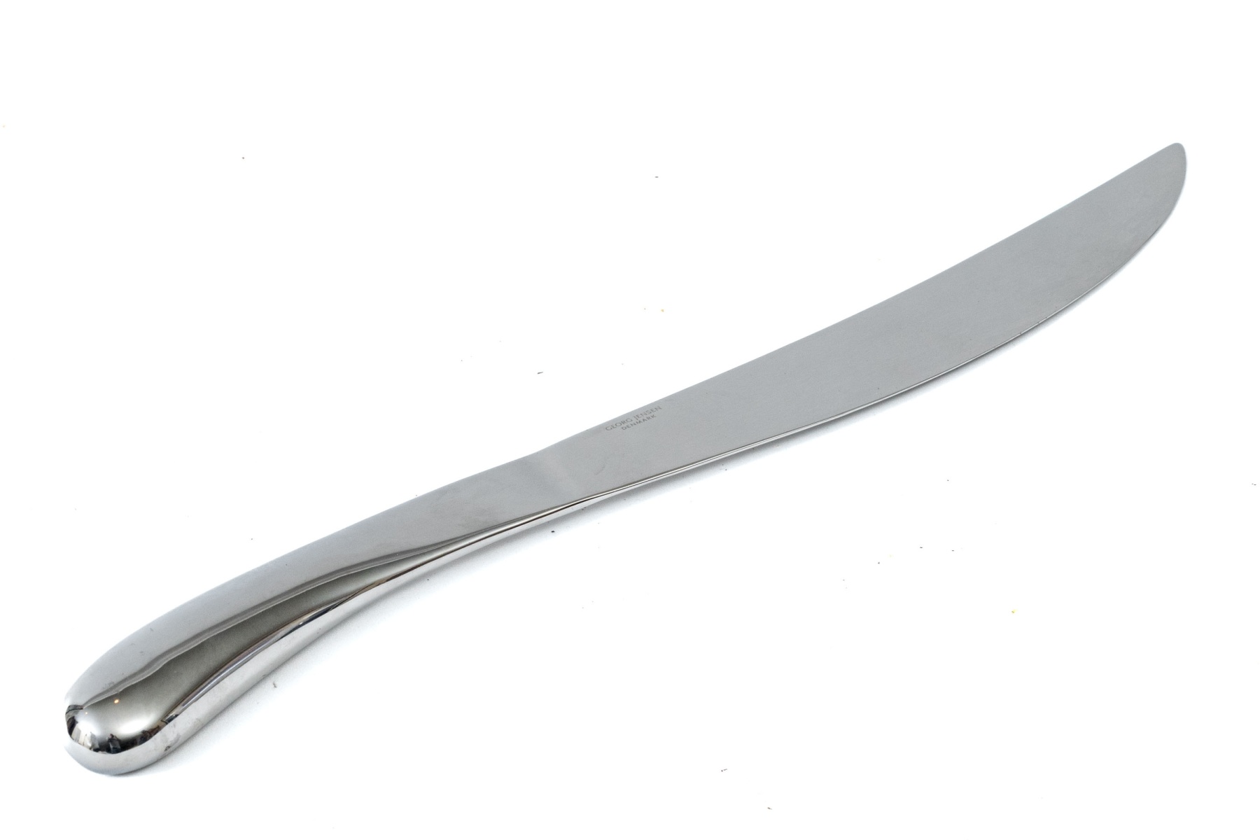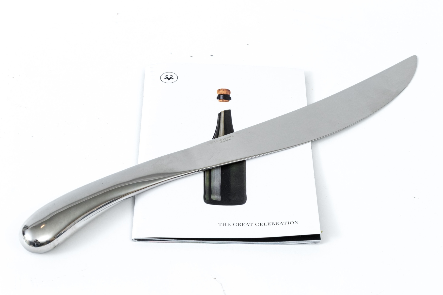 A handsome Danish Georg Jensen "Indulgence" Stainless Steel champagne saber polished to a mirror finish and designed with a sleek, continuous curve from the thin, elegant blade to the thicker, rounded handle. Marked to the lower blade on one side.
