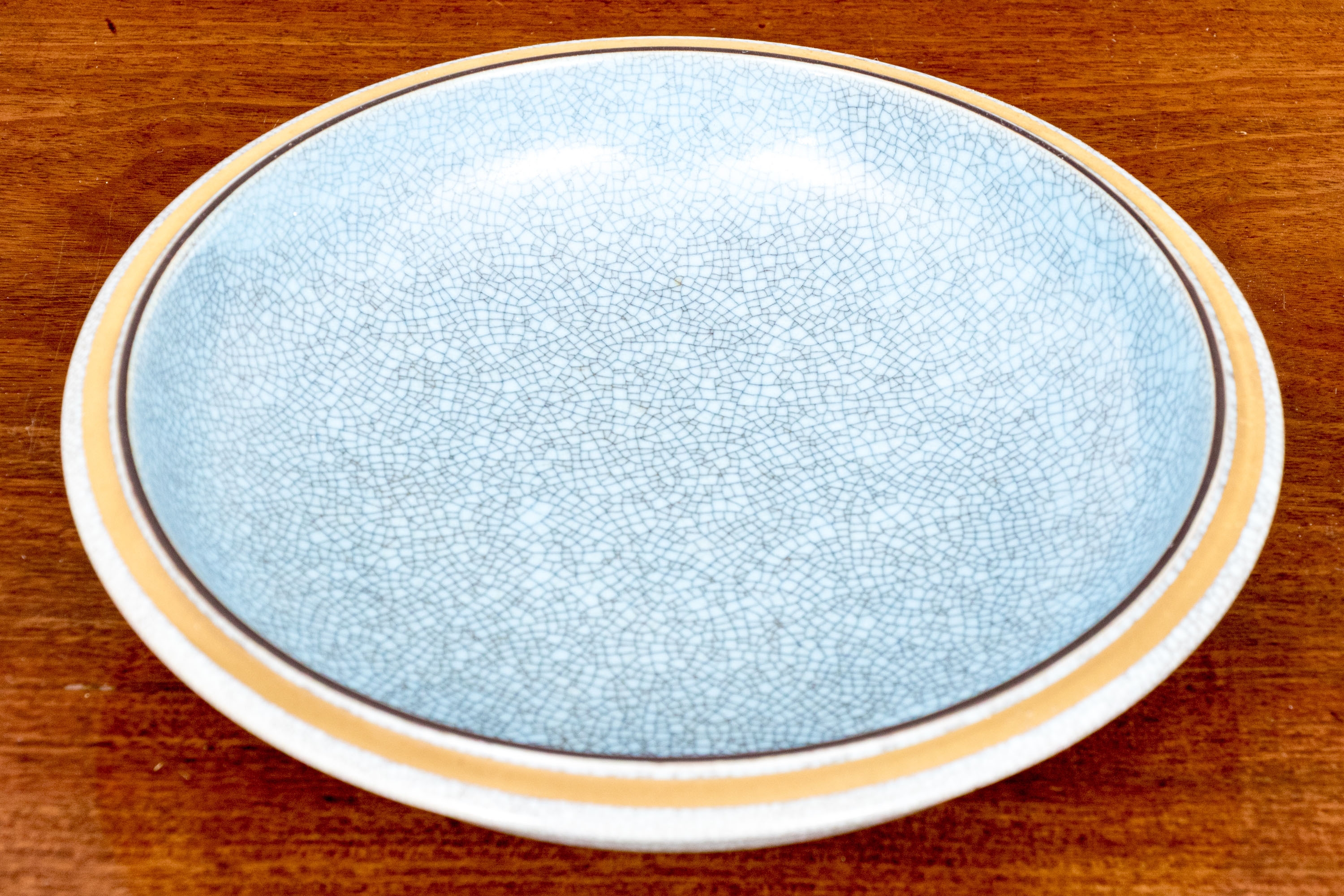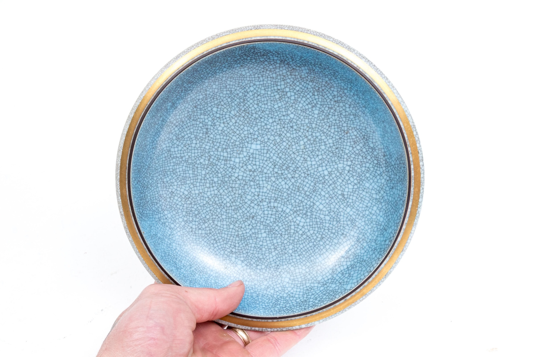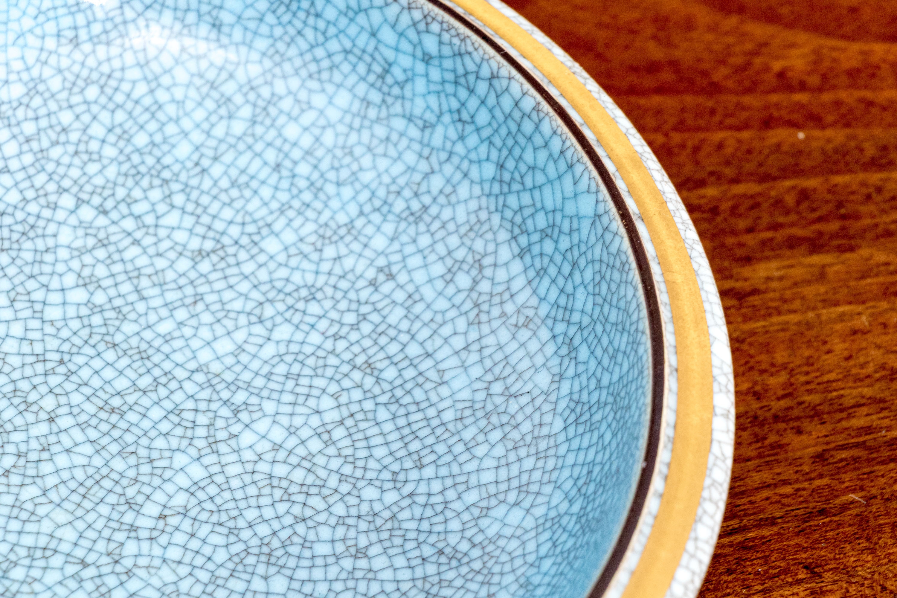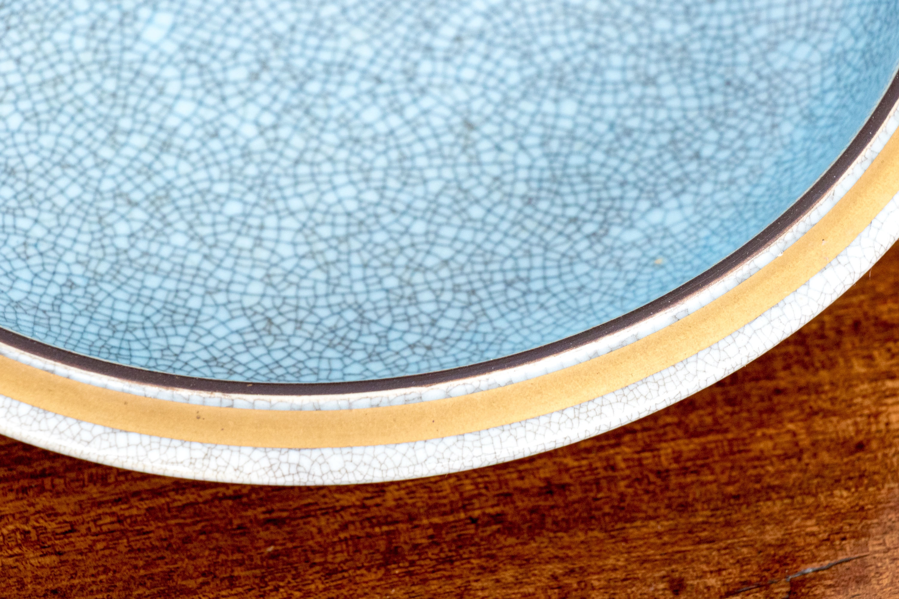 Marked underfoot. With blue crackle glazed center with gilt band around the rim.