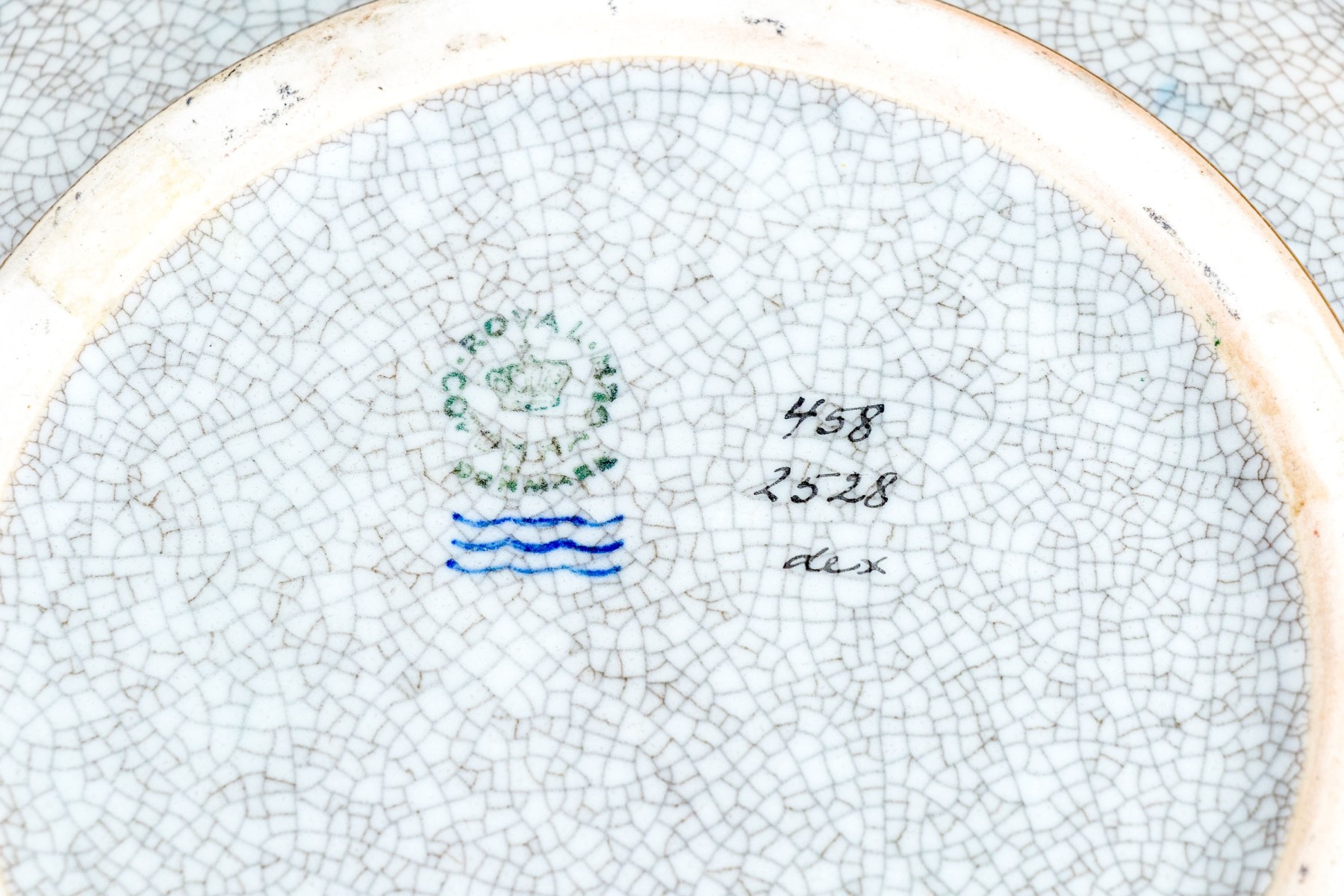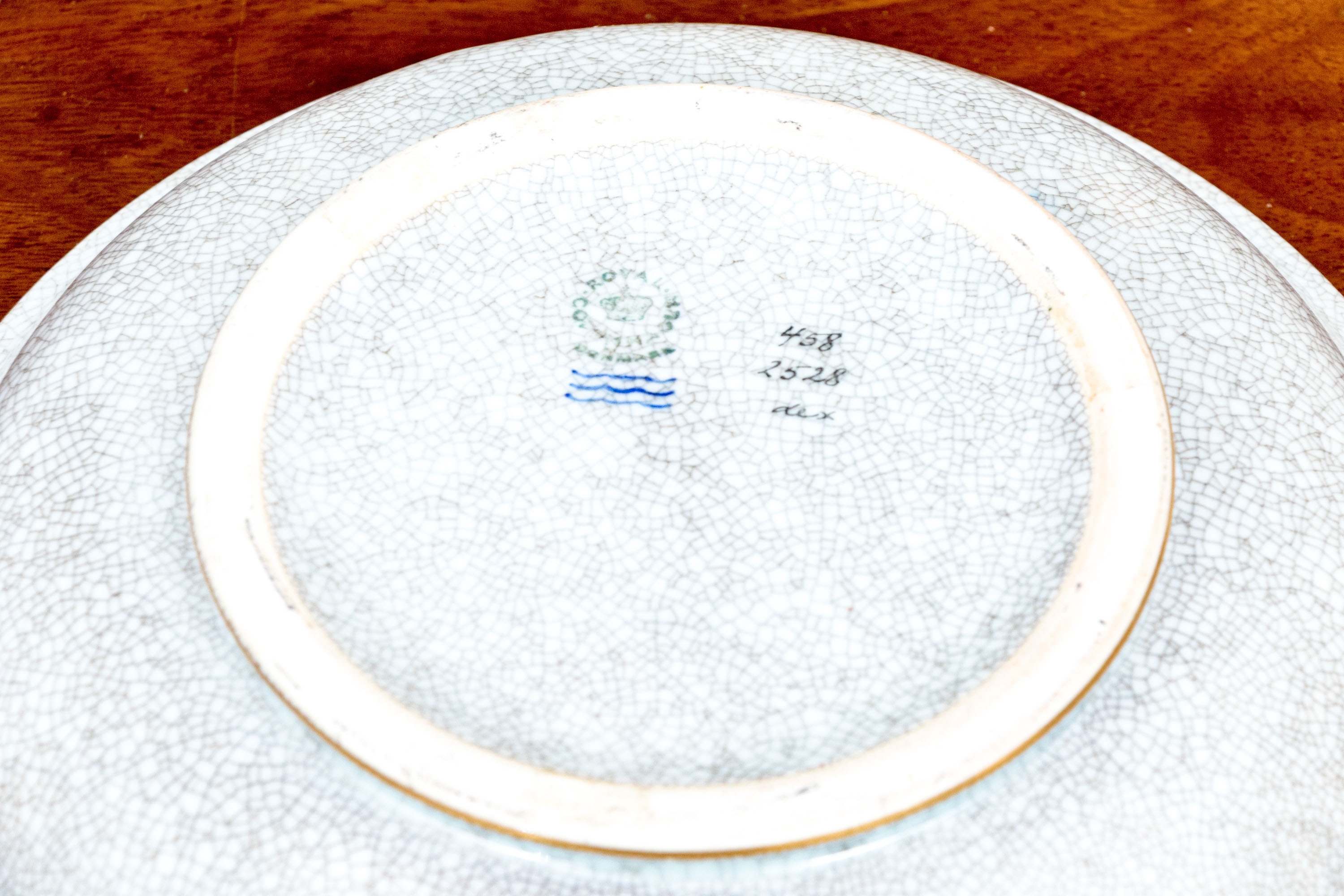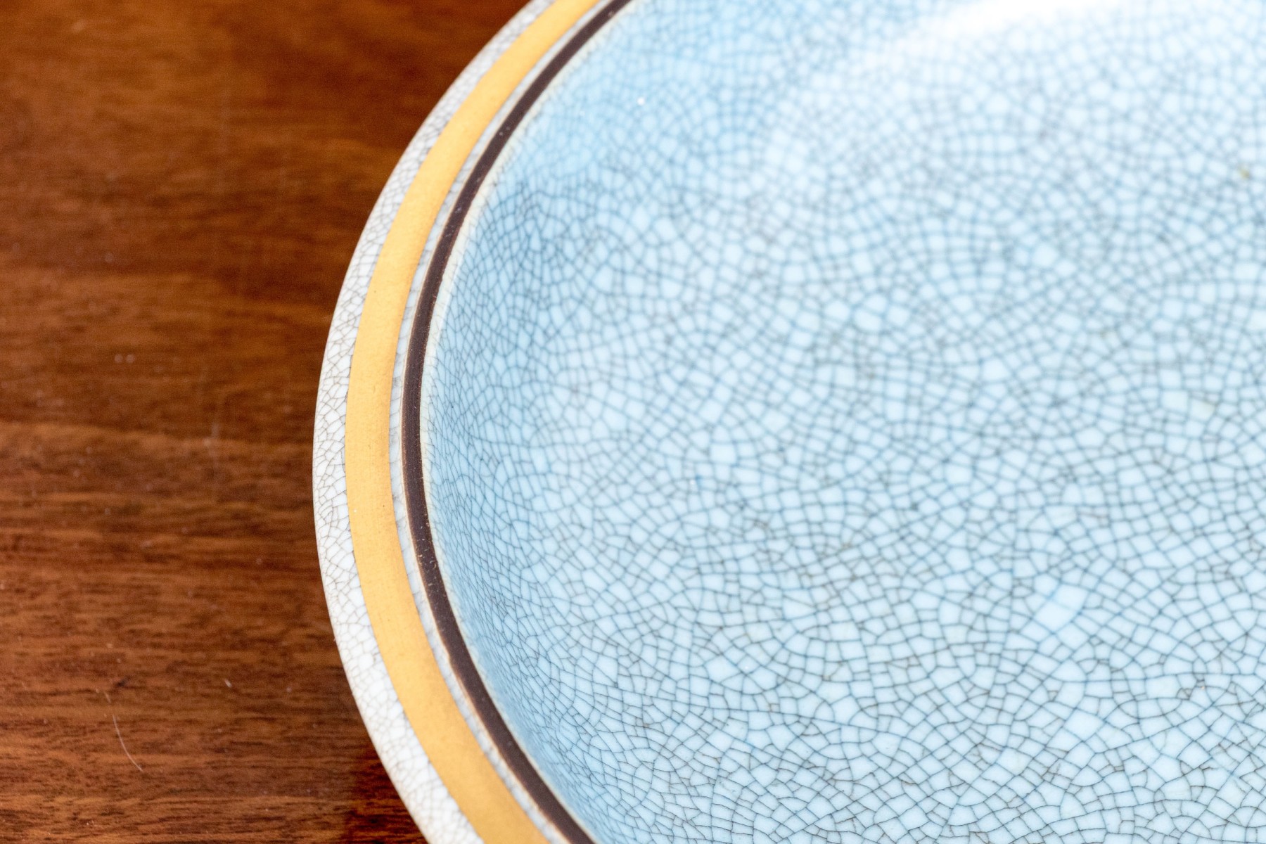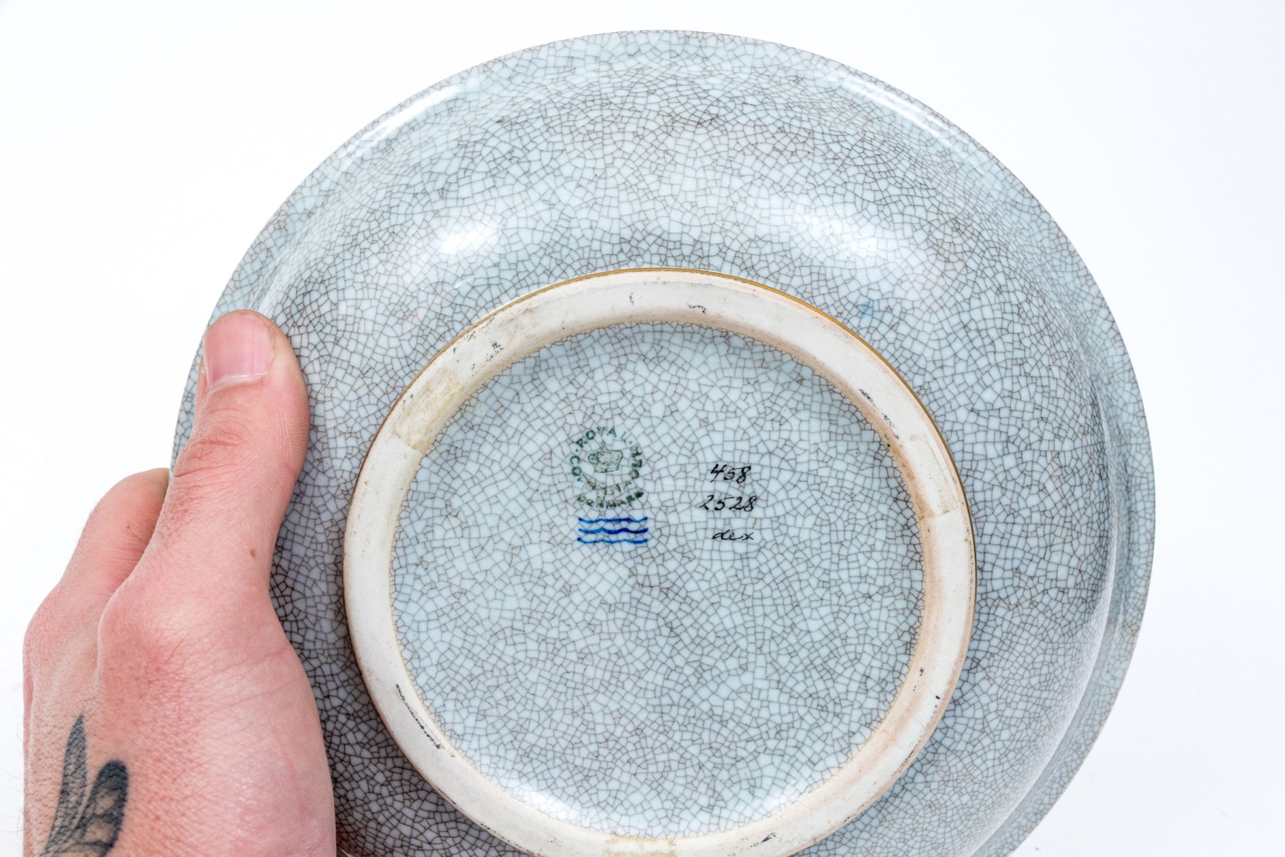 Marked underfoot. With blue crackle glazed center with gilt band around the rim.