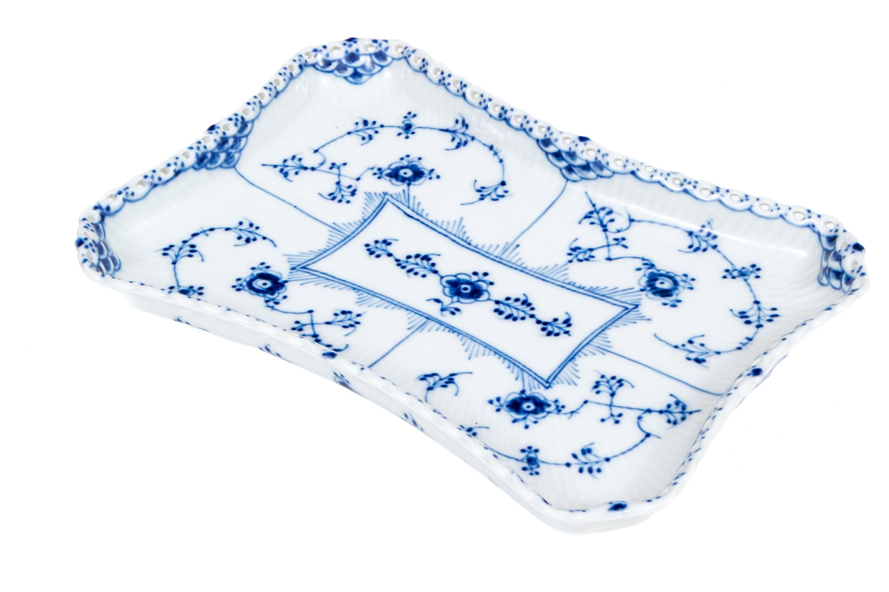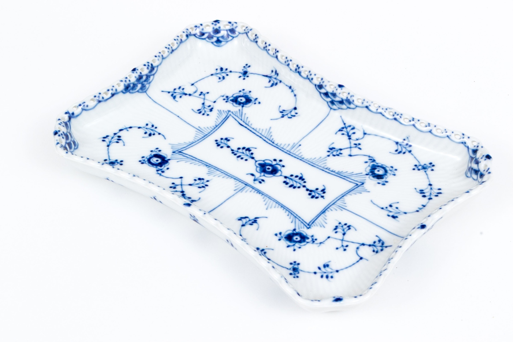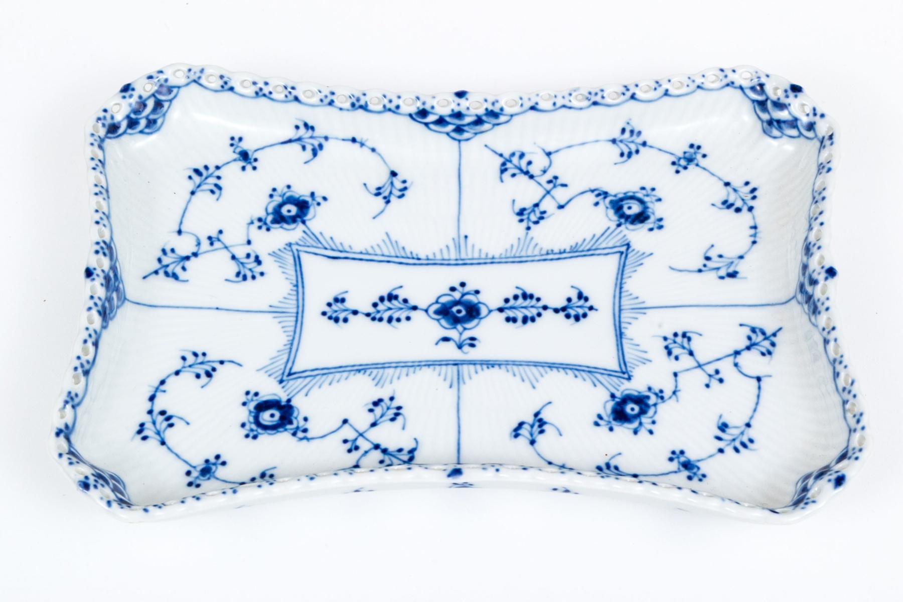 A gorgeous Royal Copenhagen "Blue Fluted Full Lace" ceramic serving tray first introduced in 1775 and is still in production today. The shaped tray is wonderfully decorated with monochromatic blue flowers and grids. Marked underfoot.