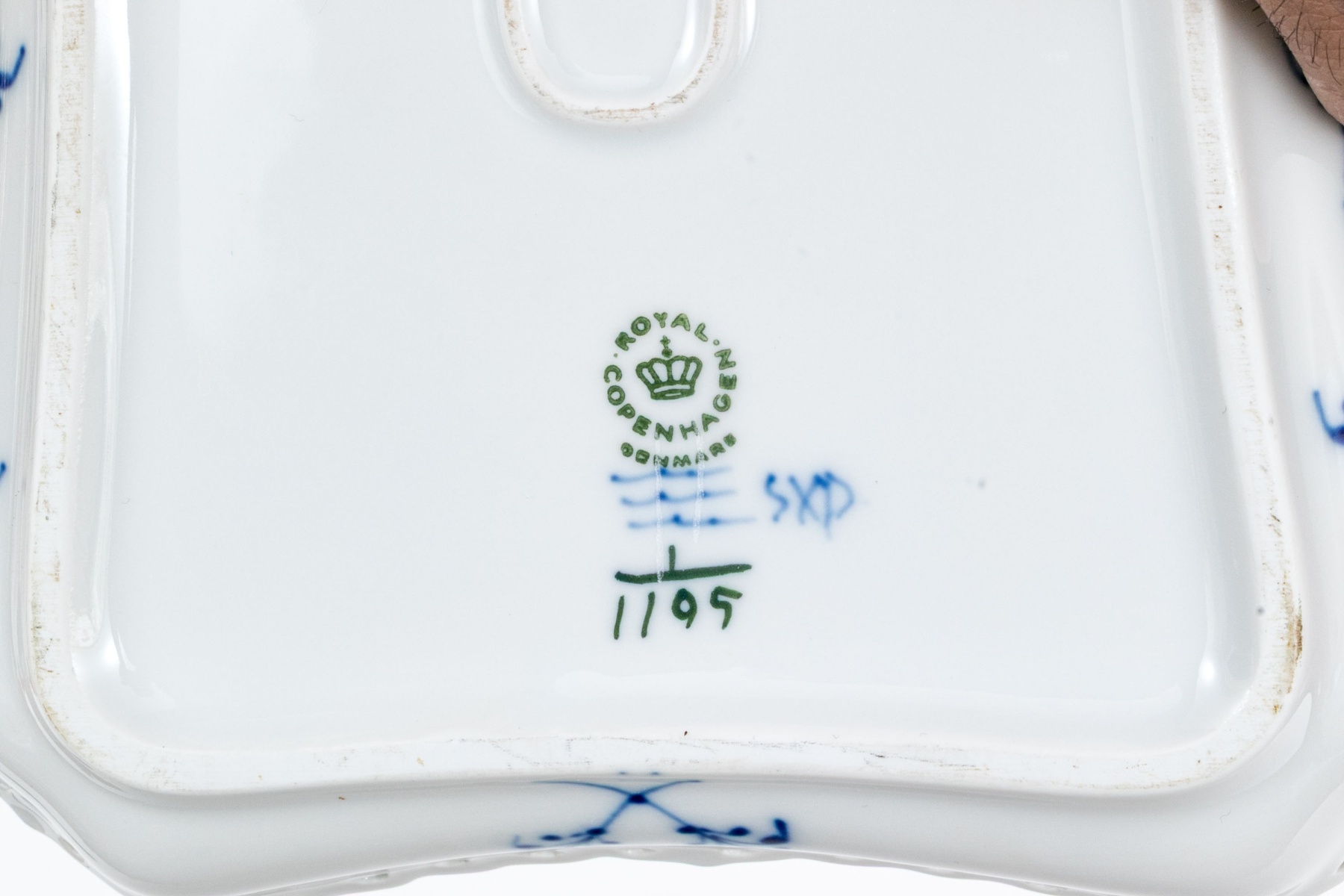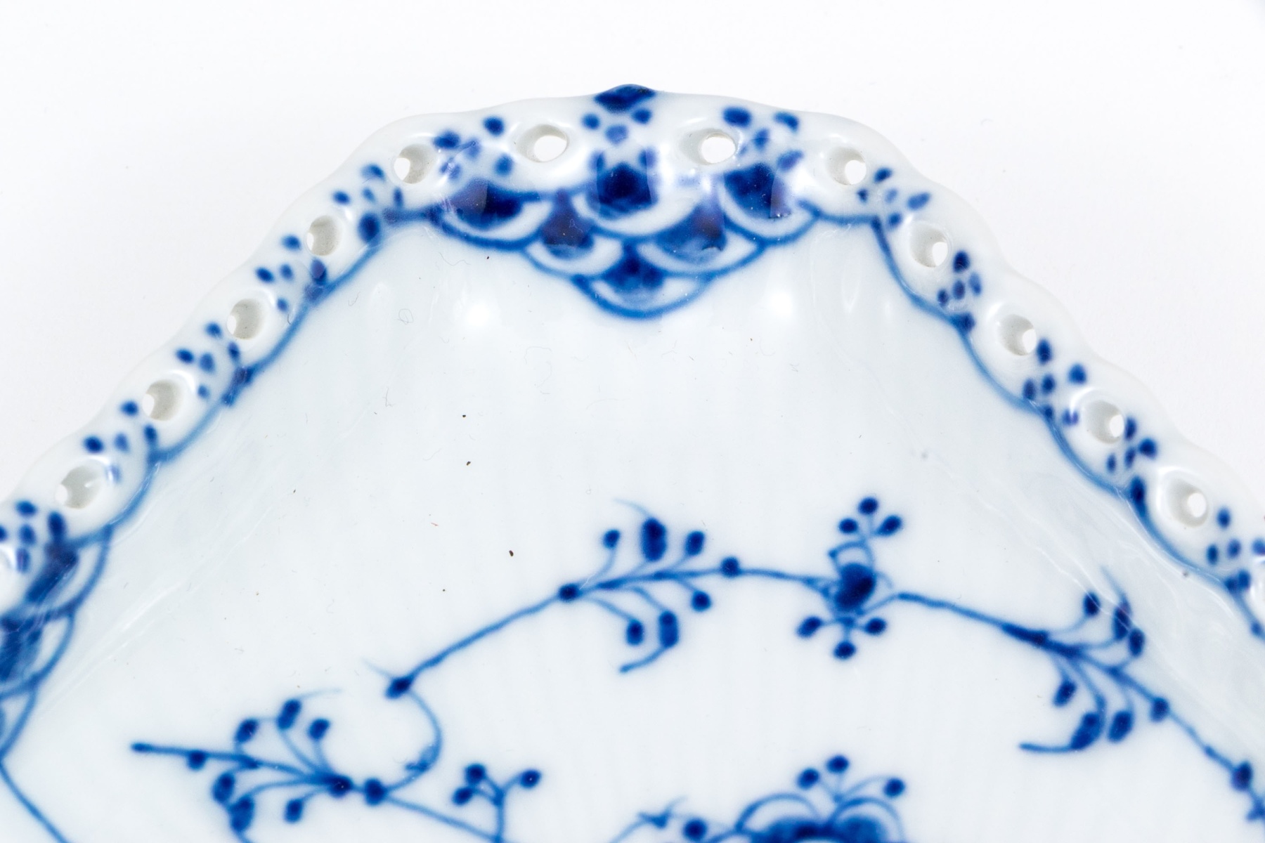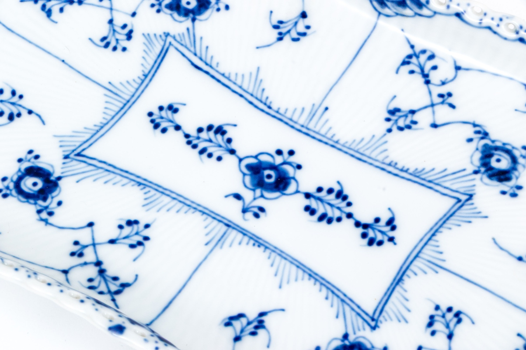 A gorgeous Royal Copenhagen "Blue Fluted Full Lace" ceramic serving tray first introduced in 1775 and is still in production today. The shaped tray is wonderfully decorated with monochromatic blue flowers and grids. Marked underfoot.