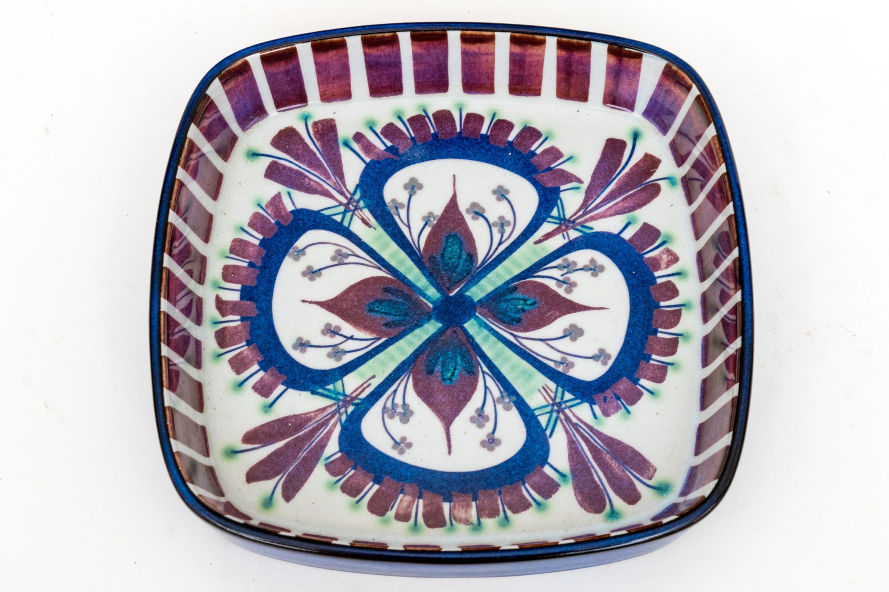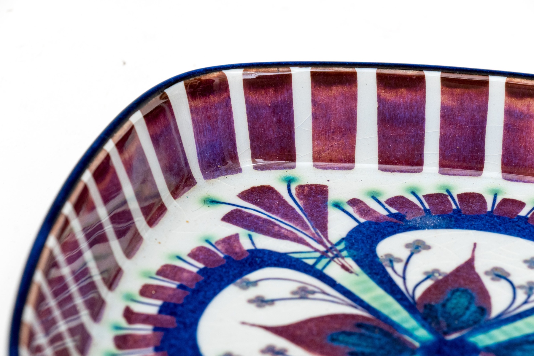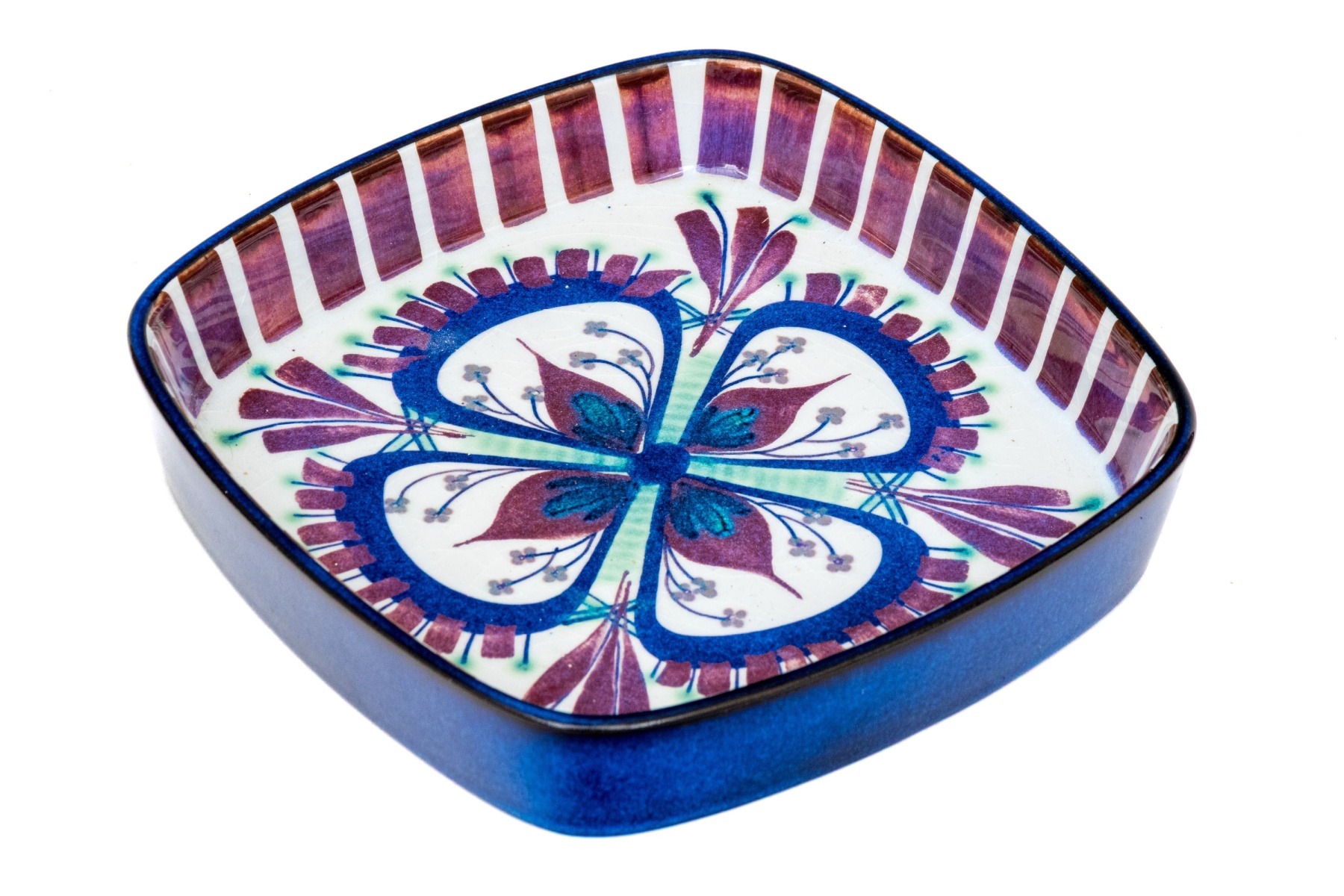 A gorgeous Royal Copenhagen ceramic bowl in gently rounded square form showcasing colorful plum purple vertical stripes down the gallery and a large quatrefoil floral motif at the center in plum, cobalt, and teal-green. Finished with a blue exterior and marked underfoot.
