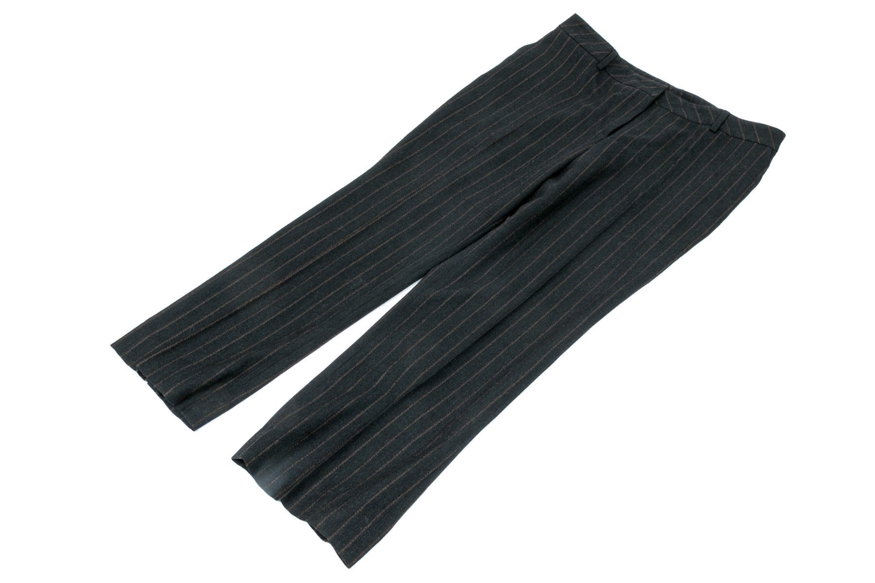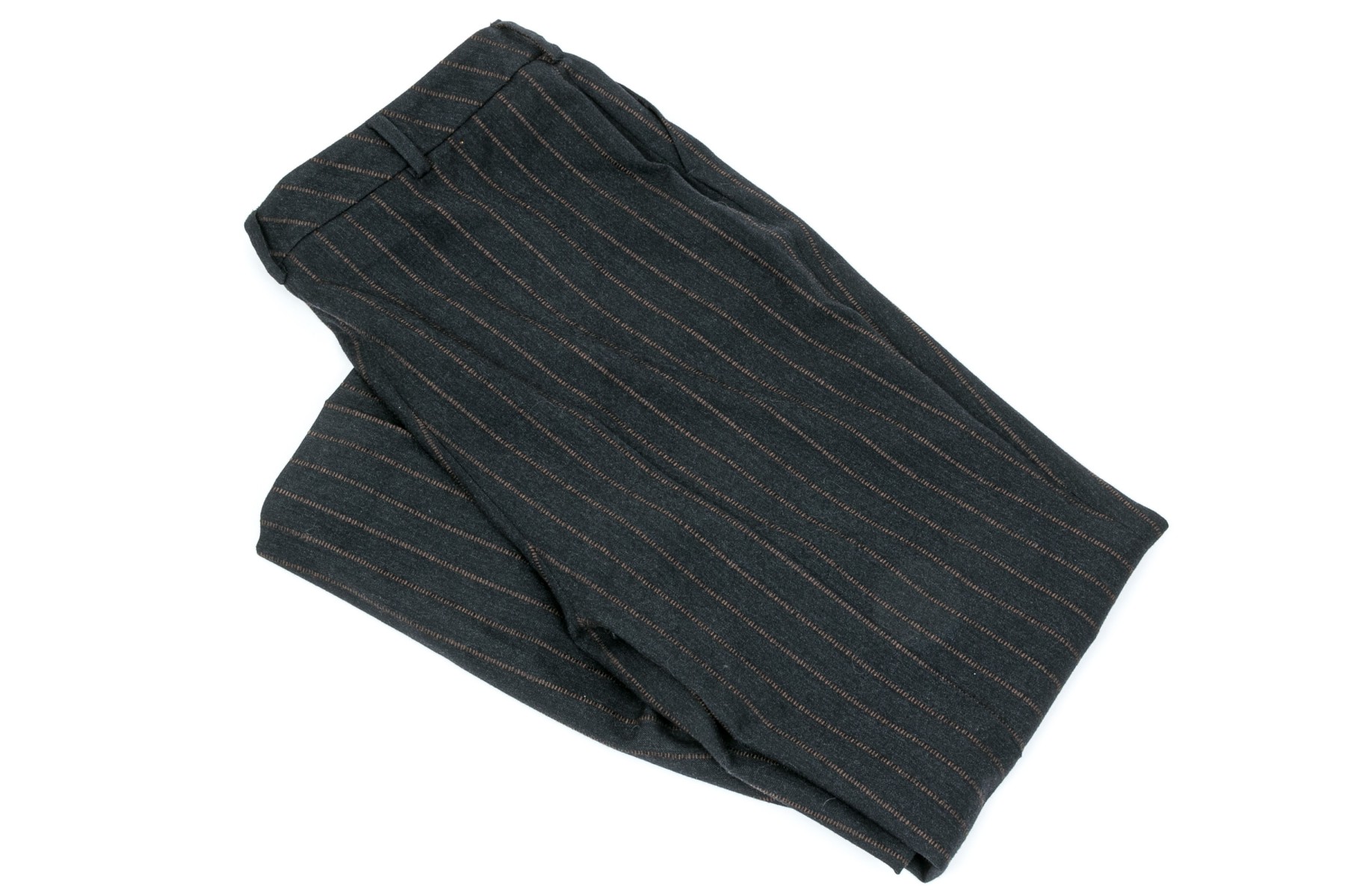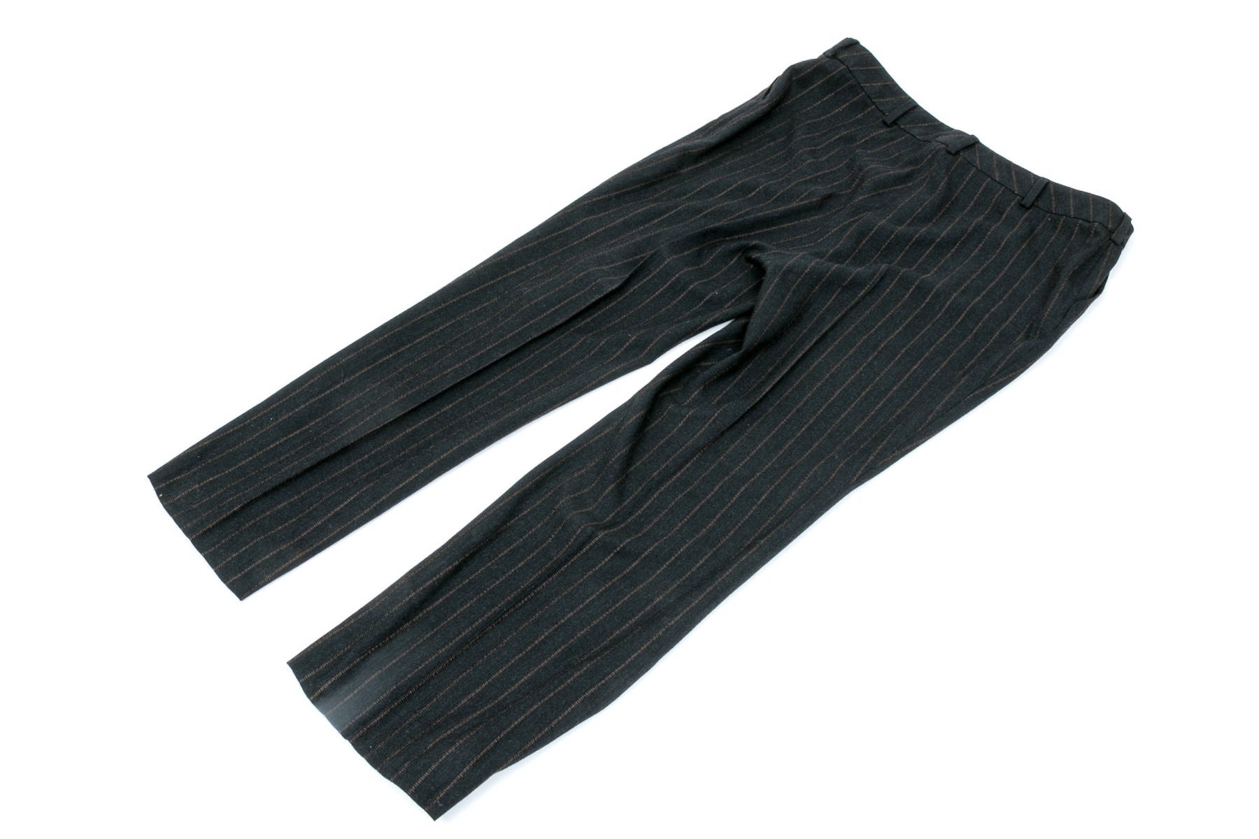 A pair of black to charcoal-grey pants with brown strips, 27" long inseam.