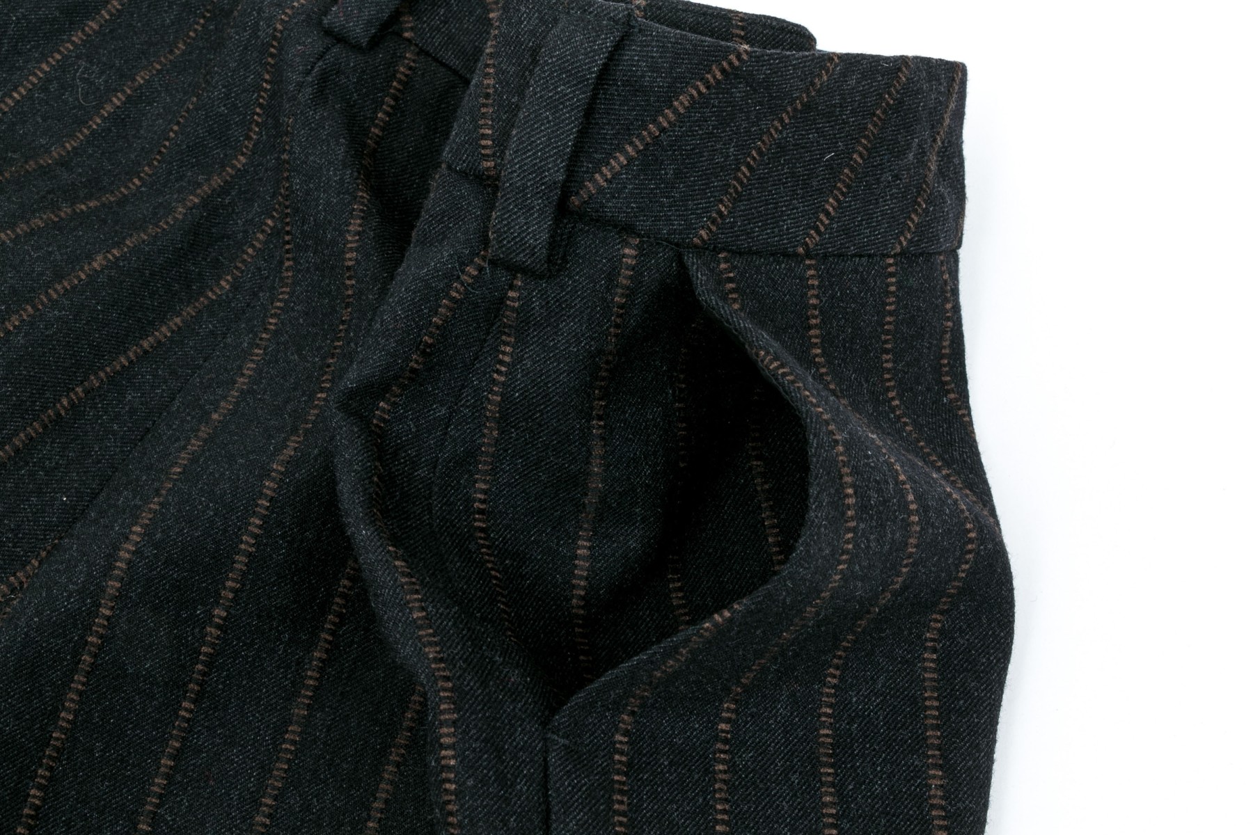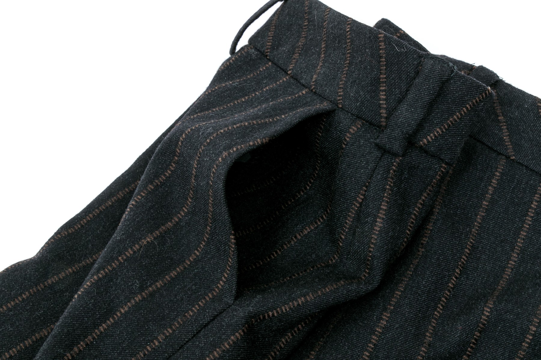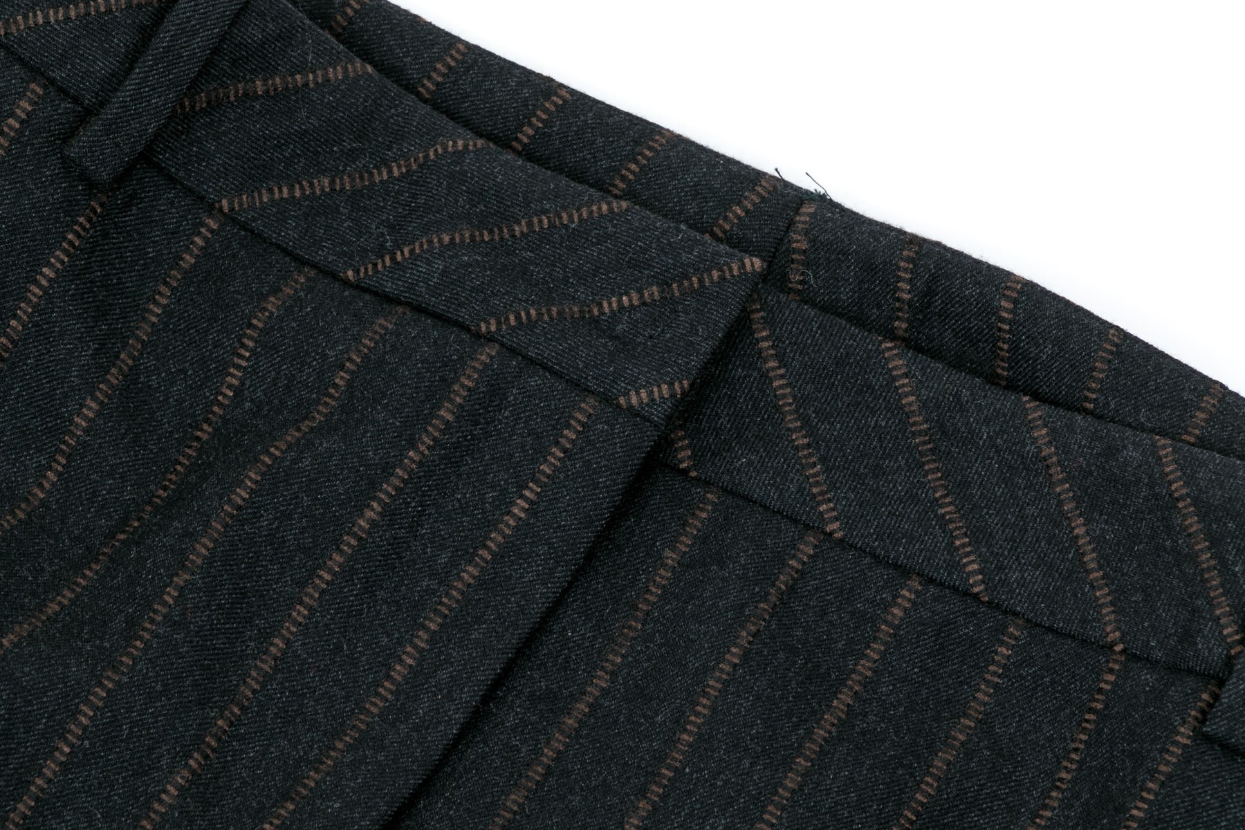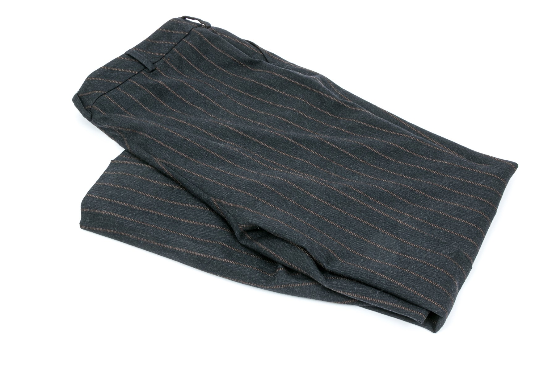 A pair of black to charcoal-grey pants with brown strips, 27" long inseam.