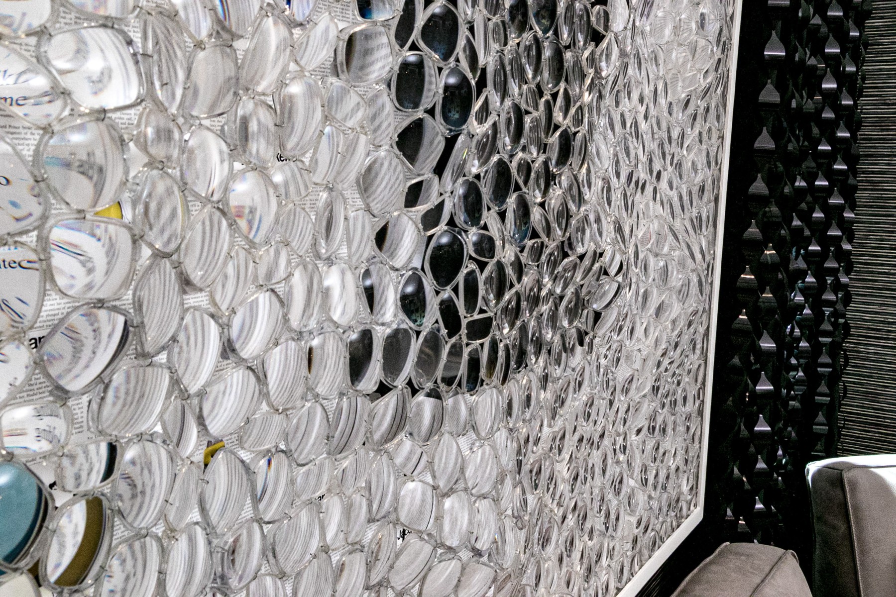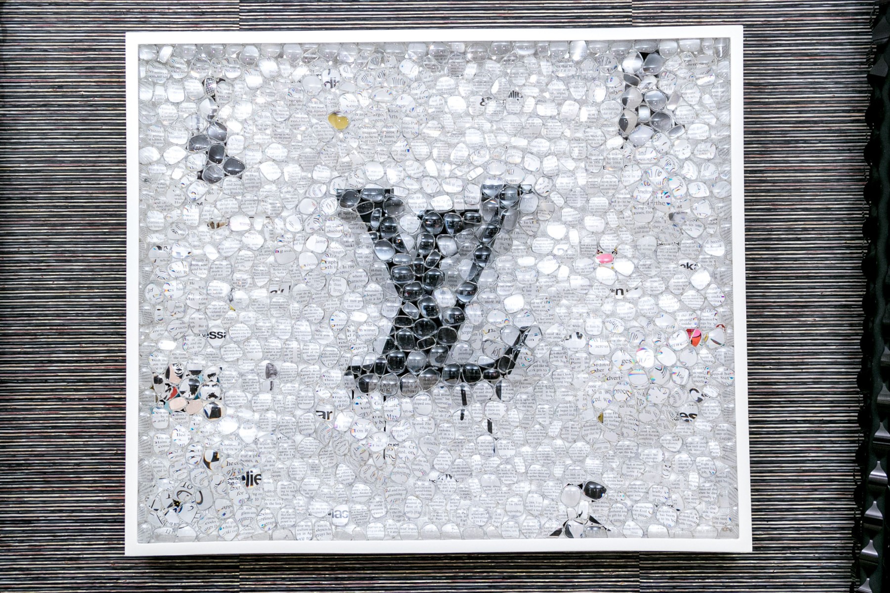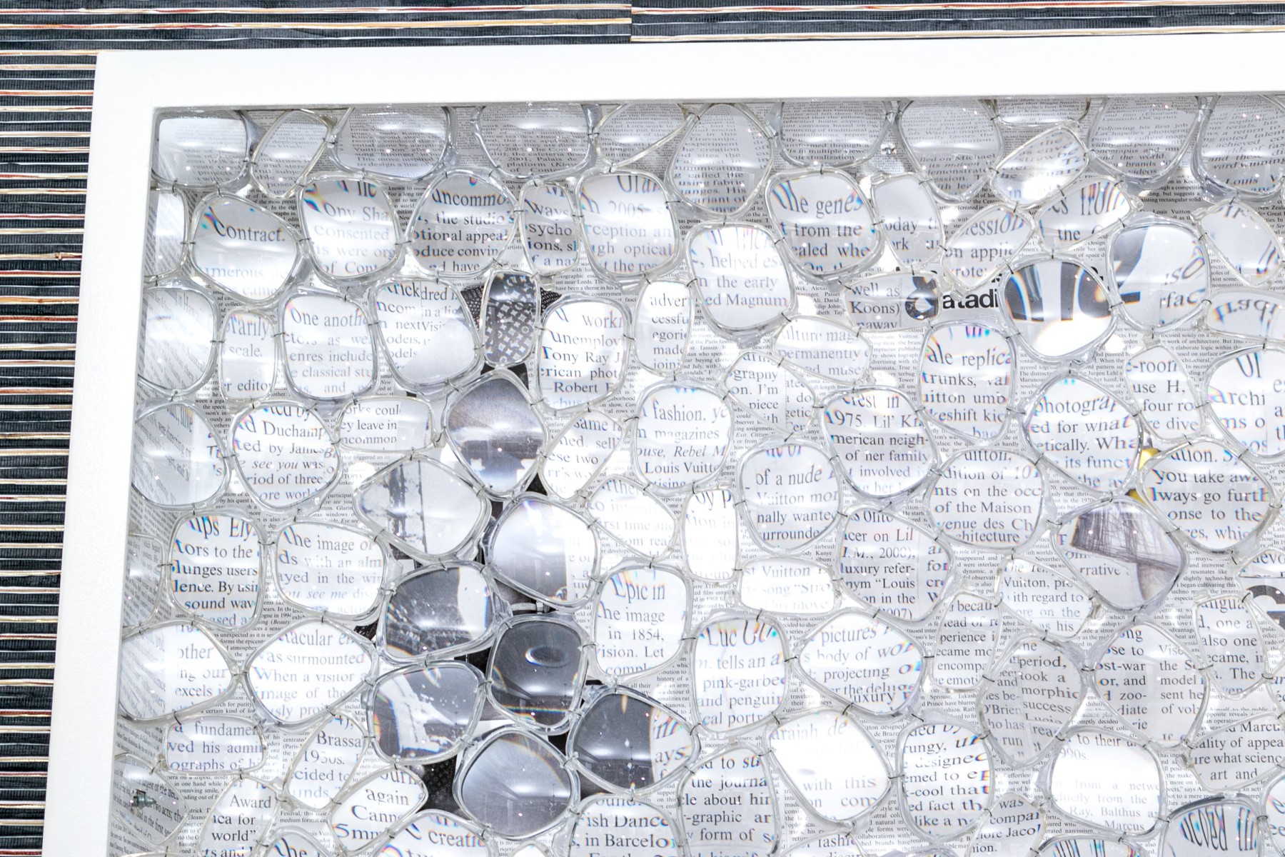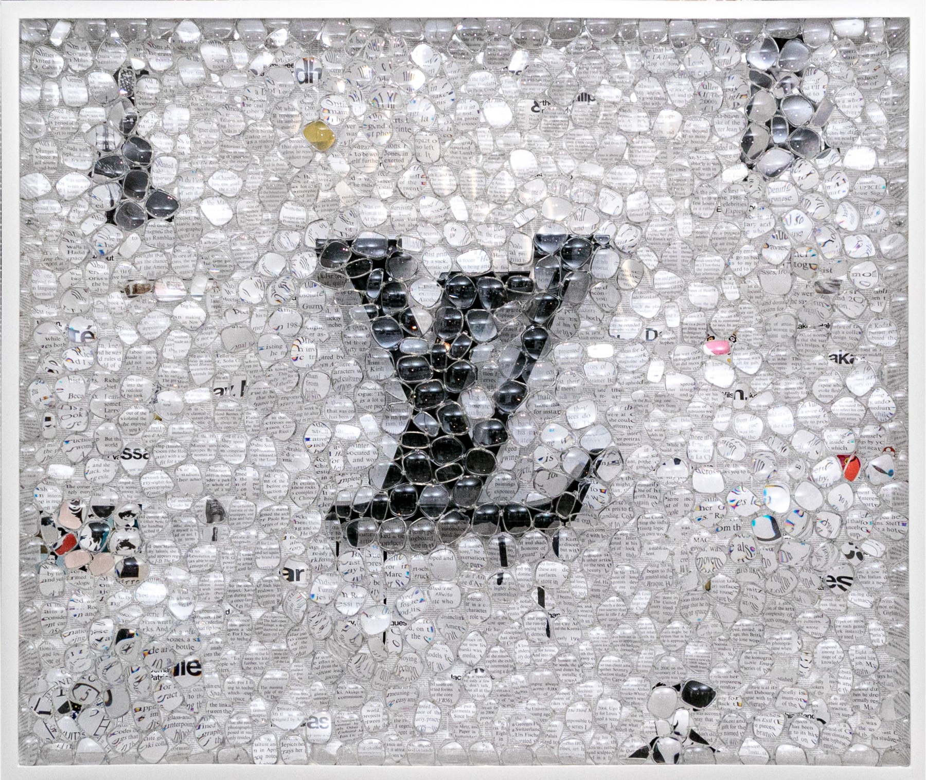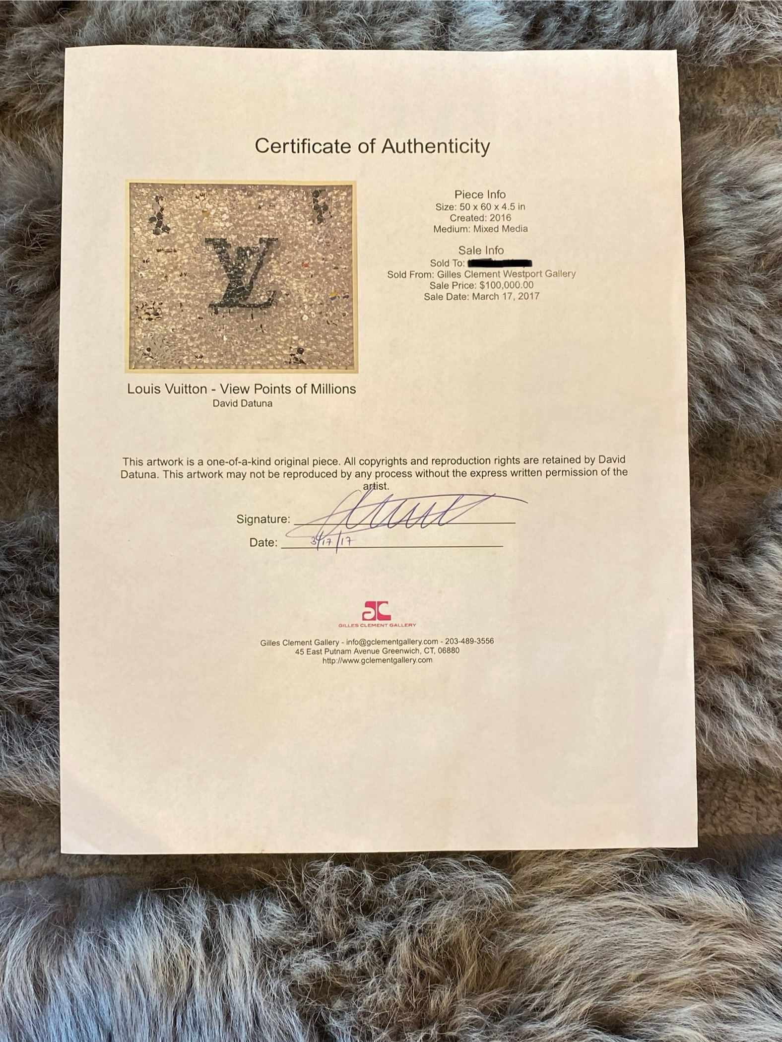 An extraordinary mixed media artwork featuring glasses lenses arranged in a mosaic over imagery that includes an LV motif at the center, surrounded by evocative wording. Presented within a sleek white lacquered finished frame, this piece is a testament to Datuna's innovative vision and artistic prowess. With provenance from Gilles Clement Westport Gallery in 2017, it represents a unique opportunity for collectors of contemporary art.