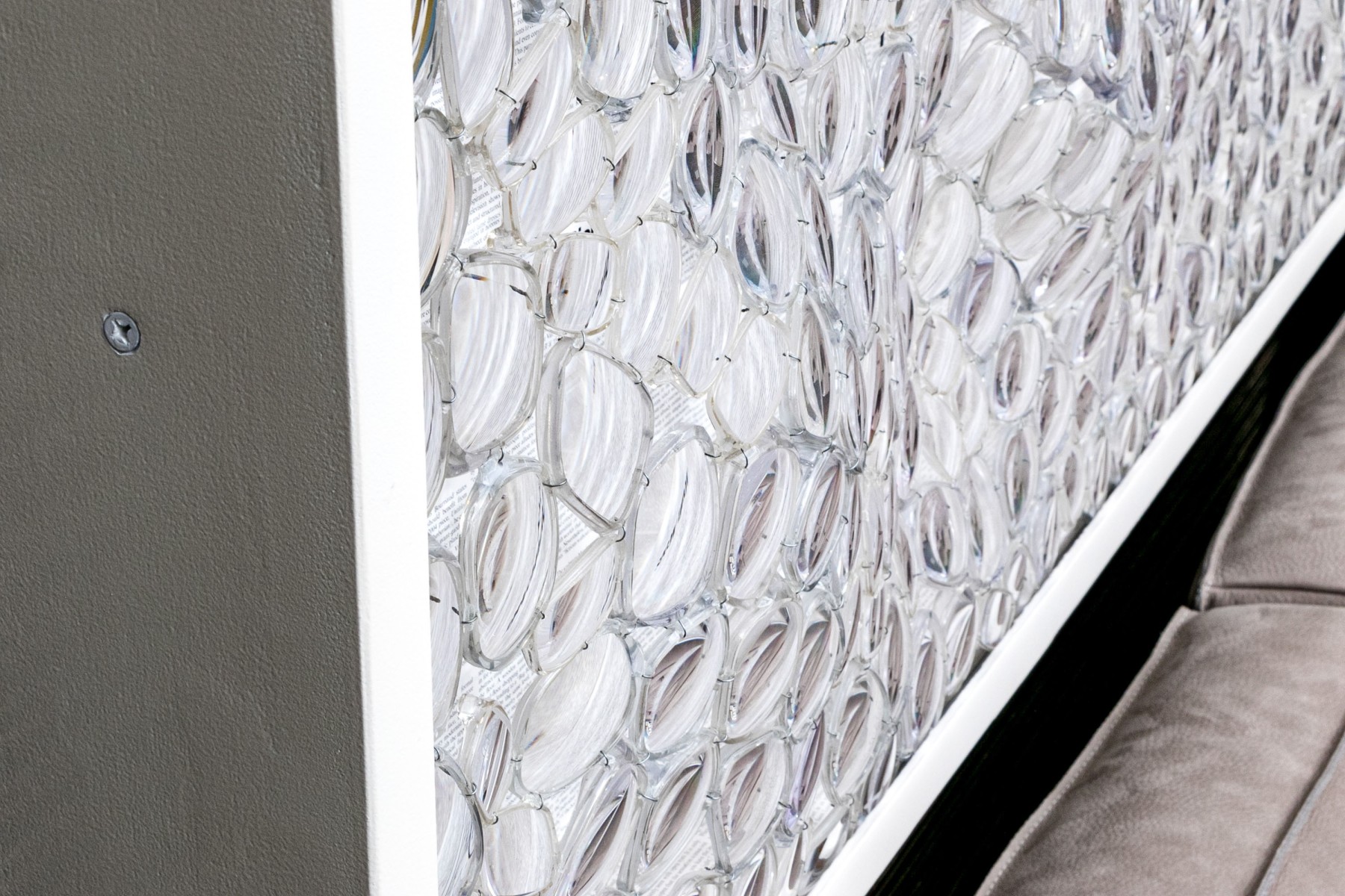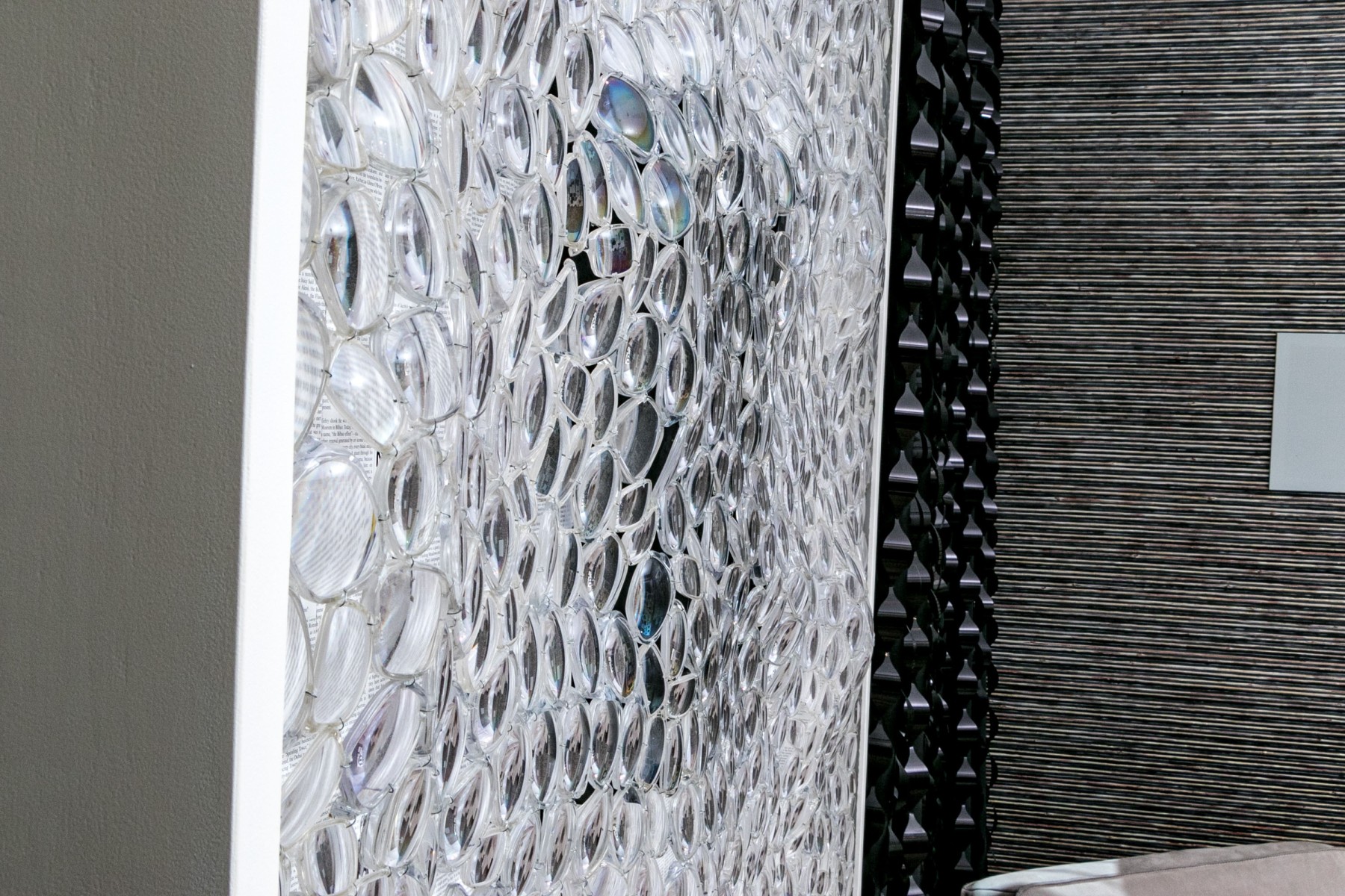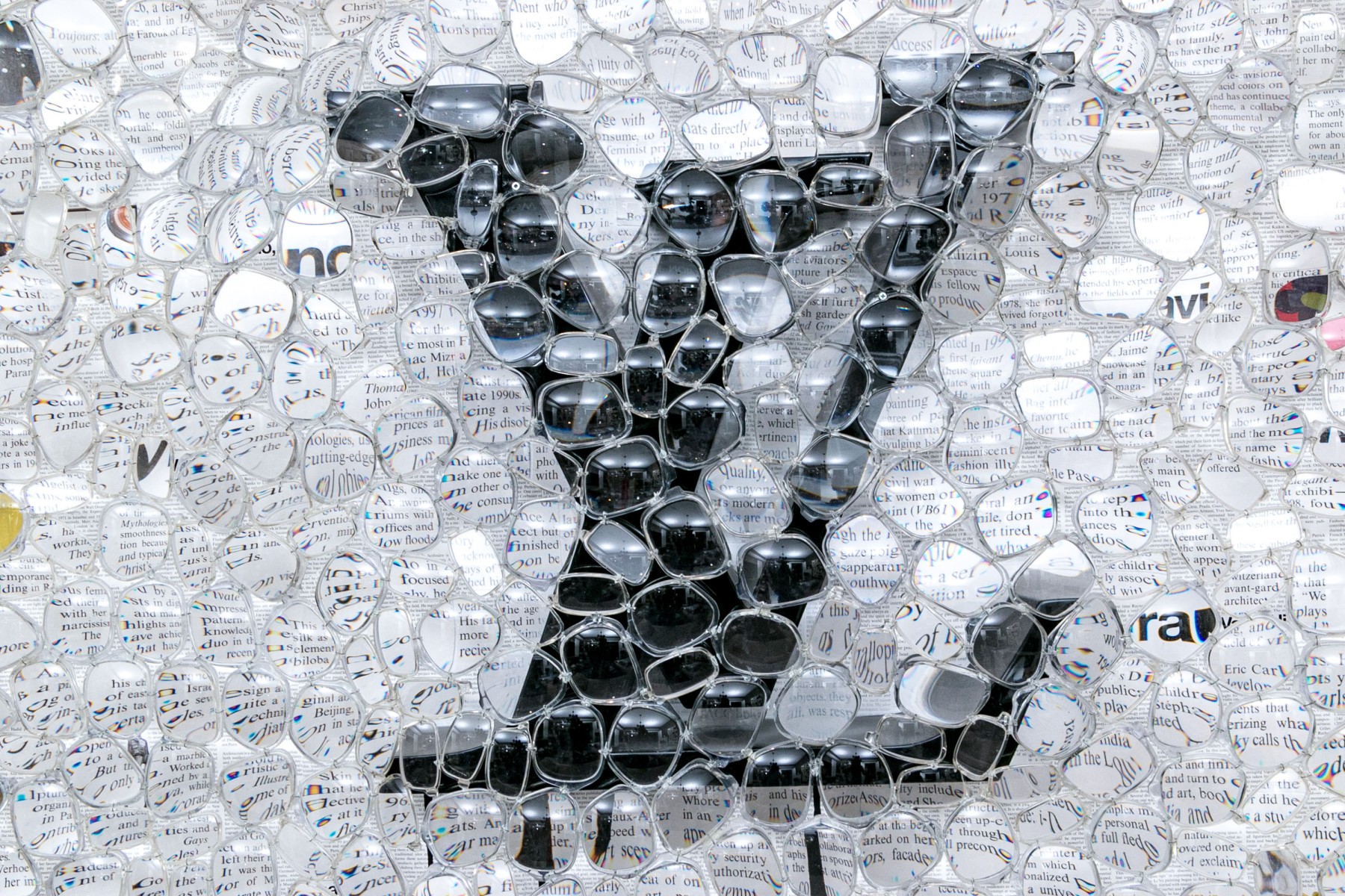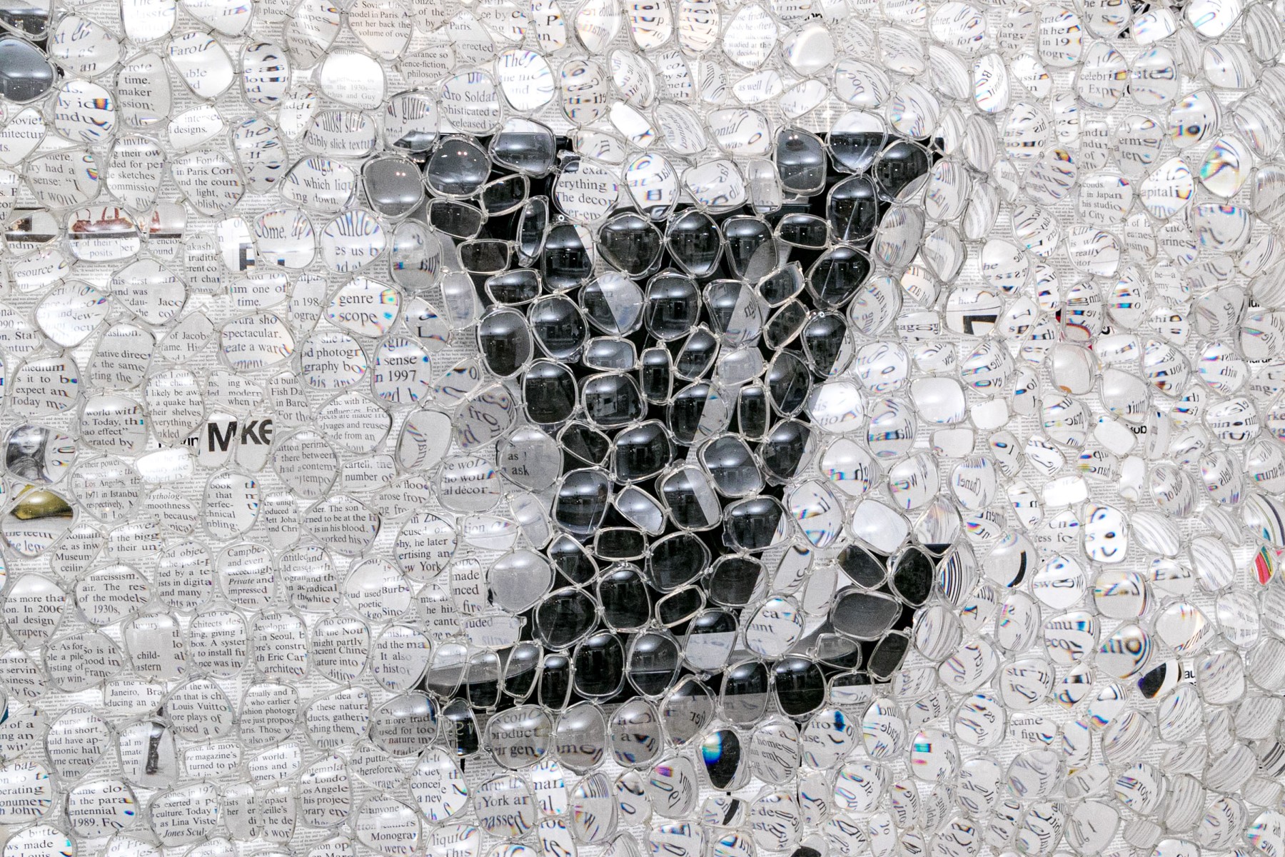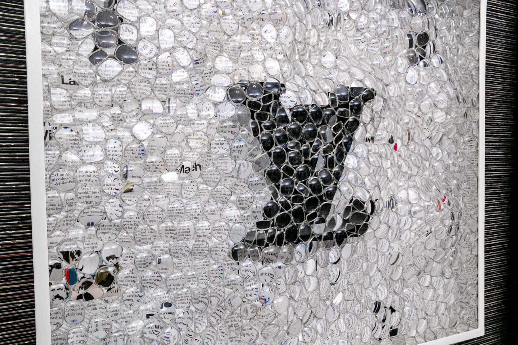 An extraordinary mixed media artwork featuring glasses lenses arranged in a mosaic over imagery that includes an LV motif at the center, surrounded by evocative wording. Presented within a sleek white lacquered finished frame, this piece is a testament to Datuna's innovative vision and artistic prowess. With provenance from Gilles Clement Westport Gallery in 2017, it represents a unique opportunity for collectors of contemporary art.