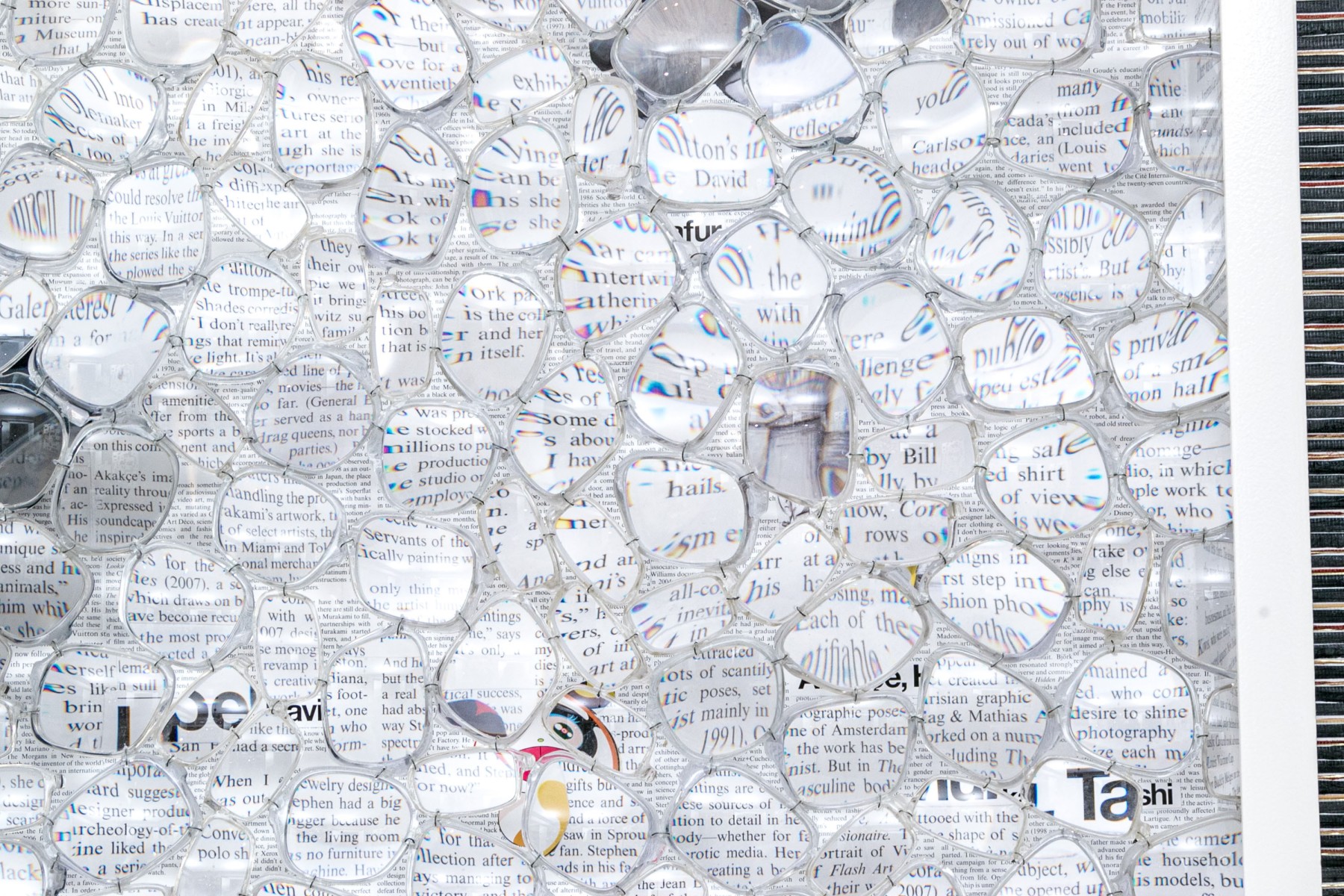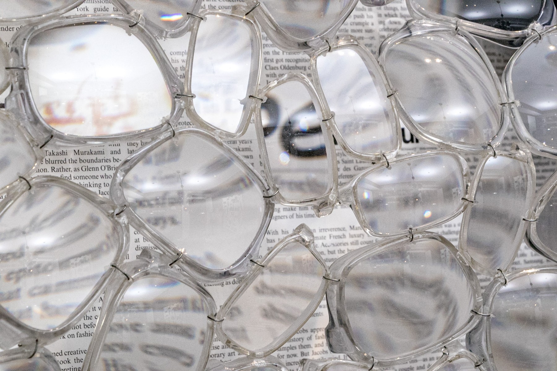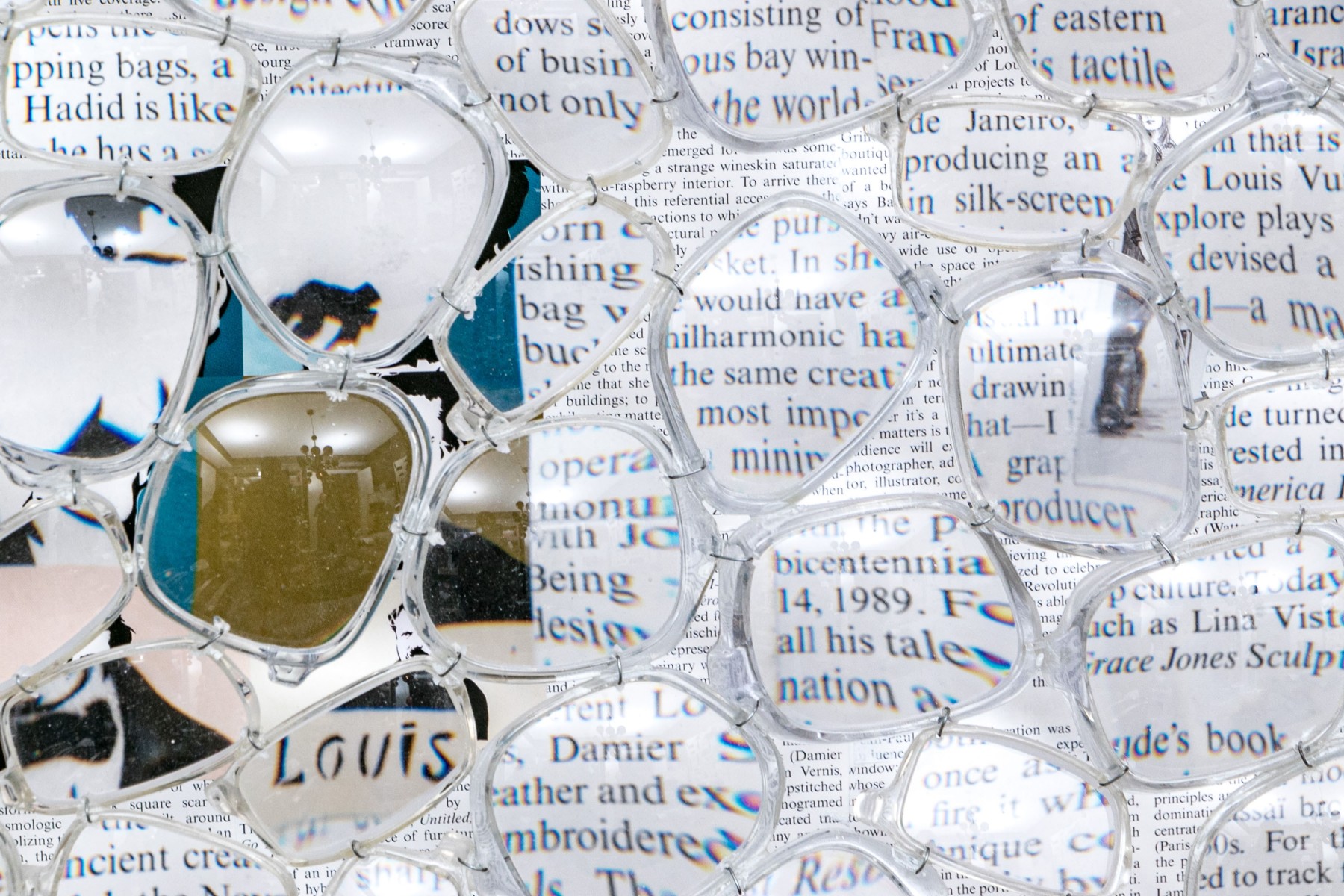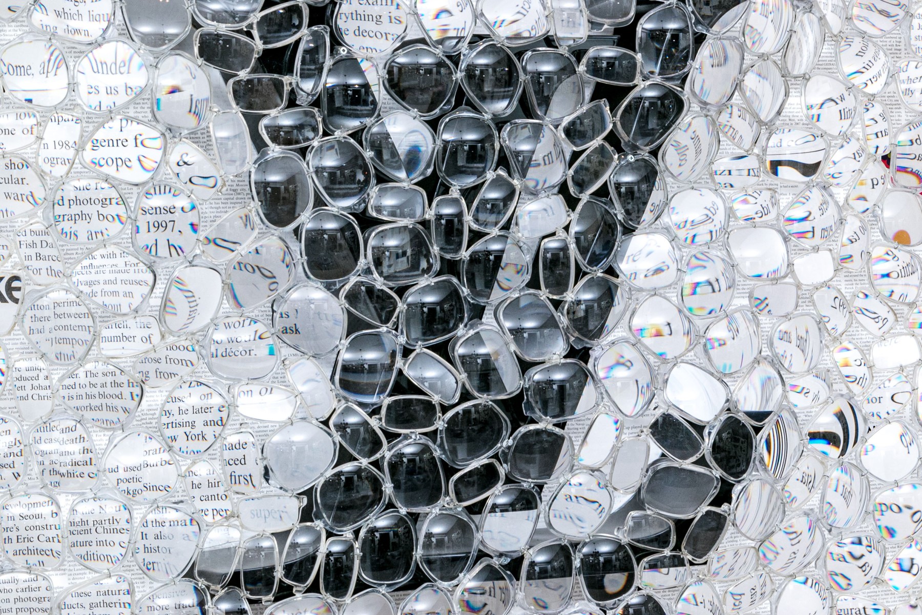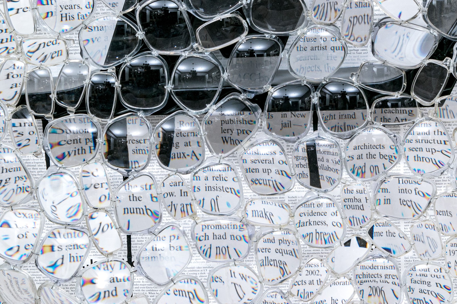 An extraordinary mixed media artwork featuring glasses lenses arranged in a mosaic over imagery that includes an LV motif at the center, surrounded by evocative wording. Presented within a sleek white lacquered finished frame, this piece is a testament to Datuna's innovative vision and artistic prowess. With provenance from Gilles Clement Westport Gallery in 2017, it represents a unique opportunity for collectors of contemporary art.
