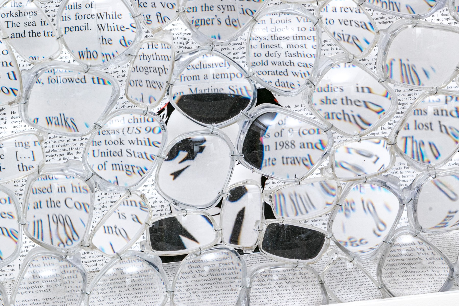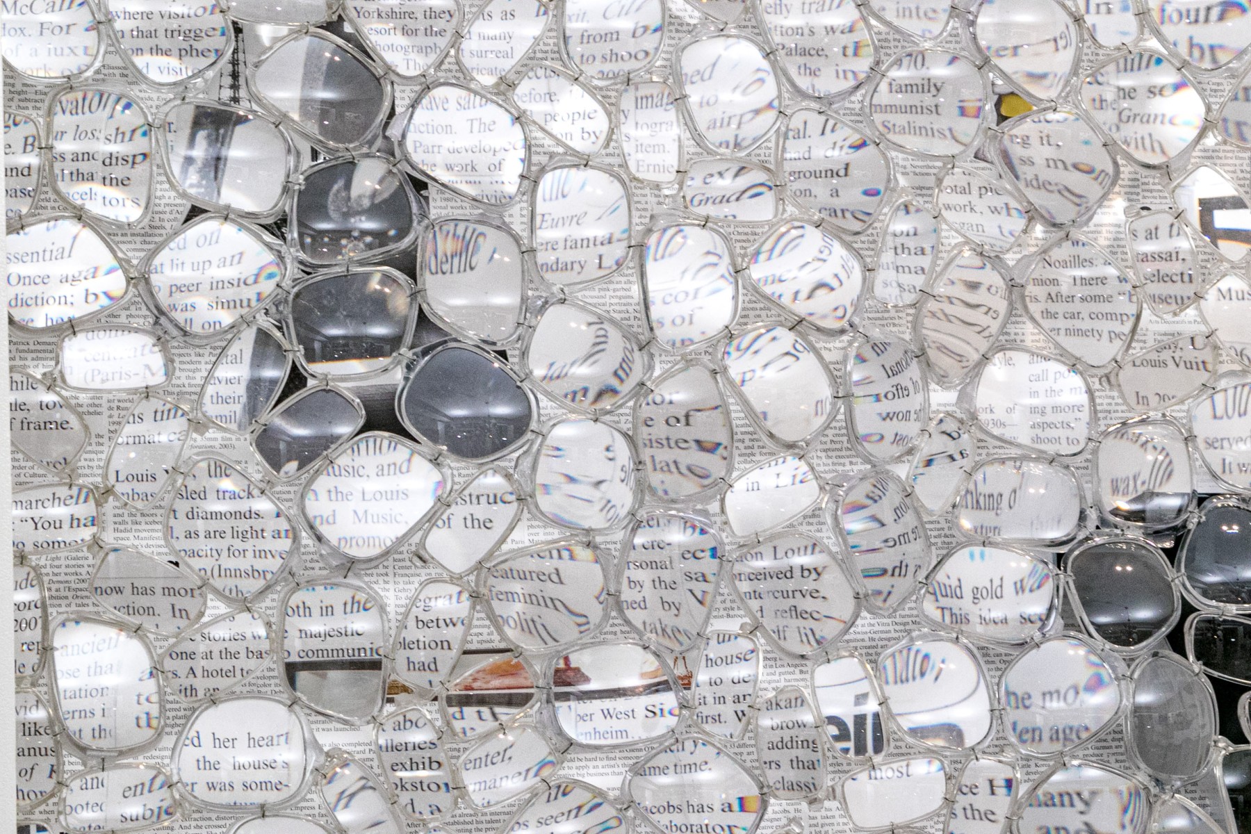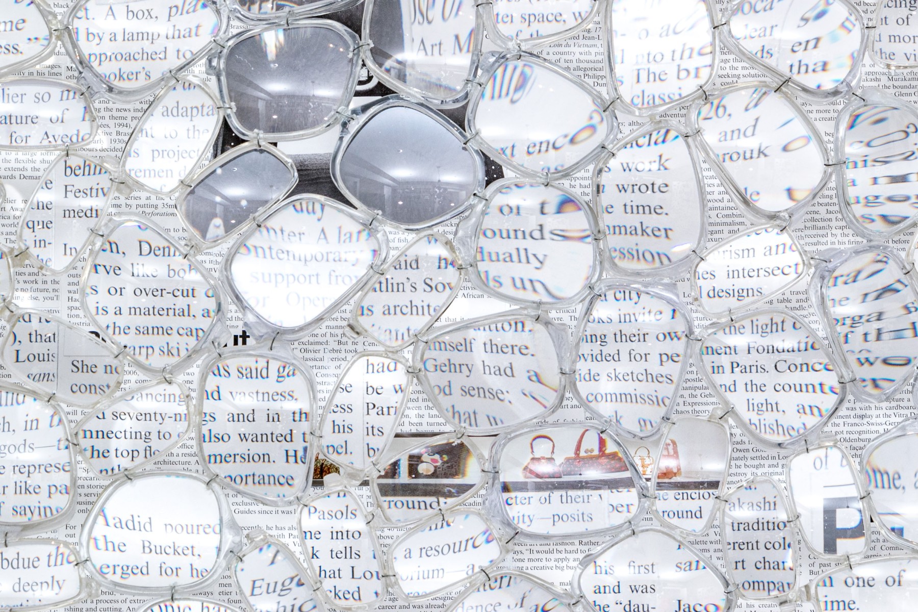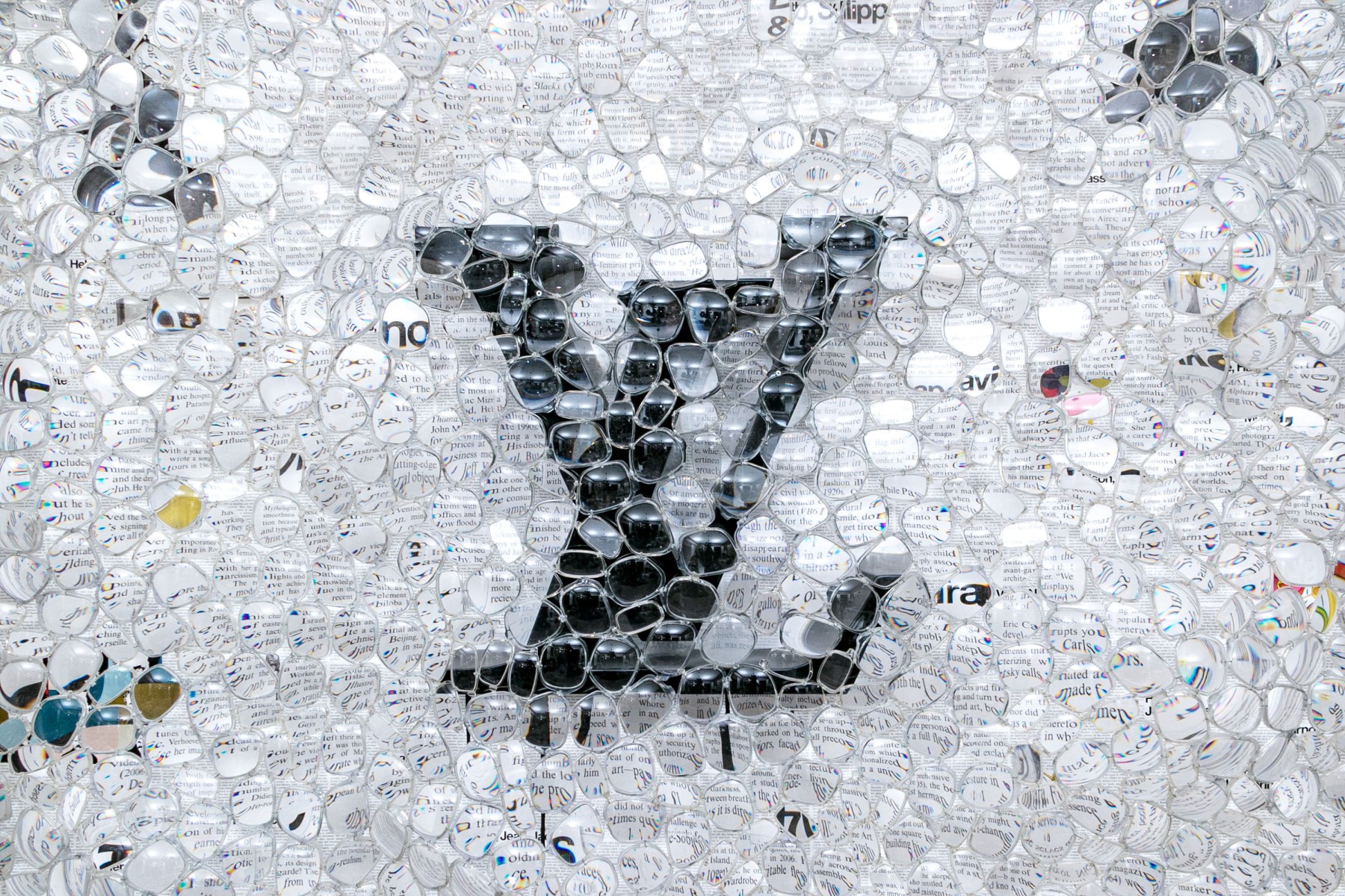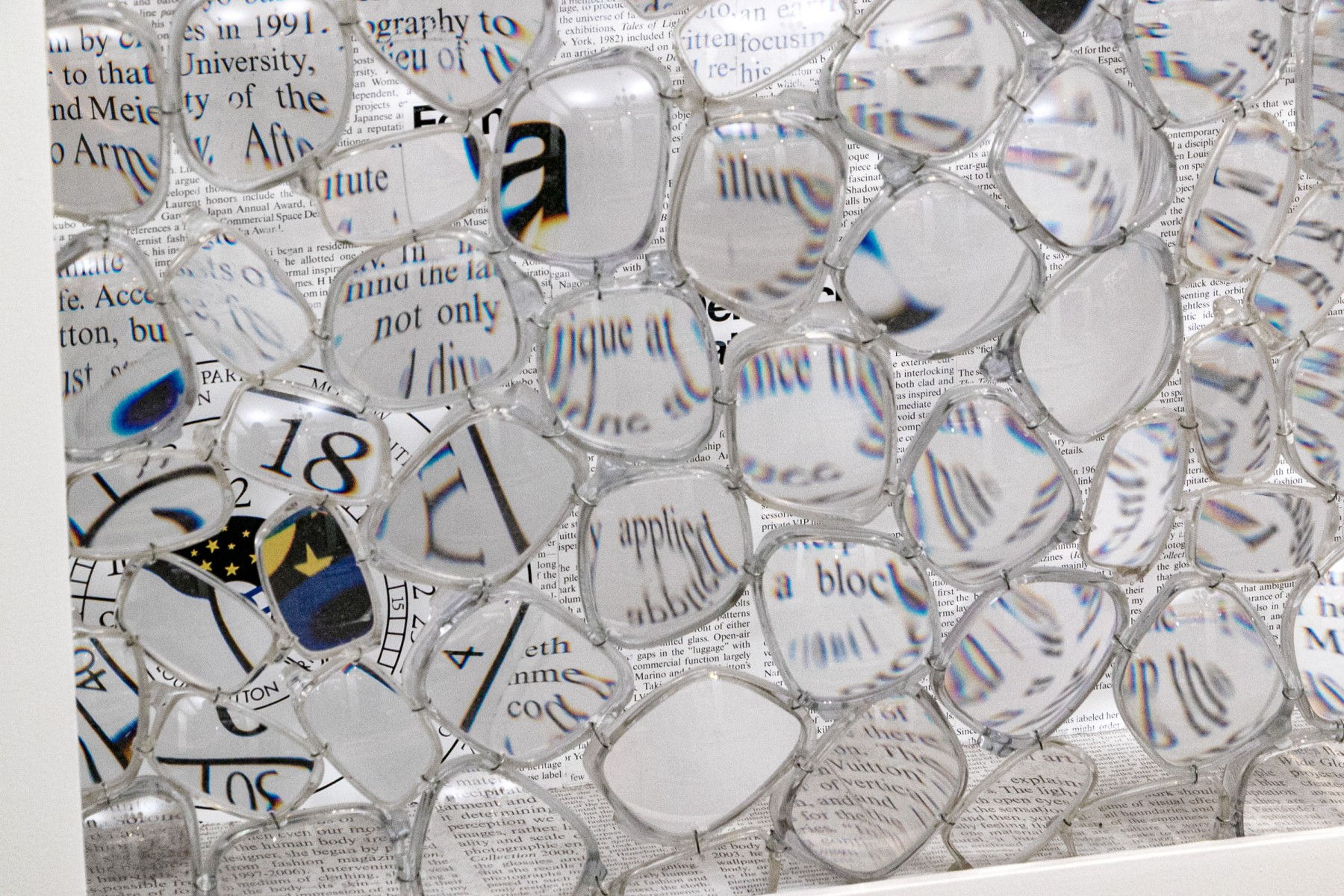 An extraordinary mixed media artwork featuring glasses lenses arranged in a mosaic over imagery that includes an LV motif at the center, surrounded by evocative wording. Presented within a sleek white lacquered finished frame, this piece is a testament to Datuna's innovative vision and artistic prowess. With provenance from Gilles Clement Westport Gallery in 2017, it represents a unique opportunity for collectors of contemporary art.