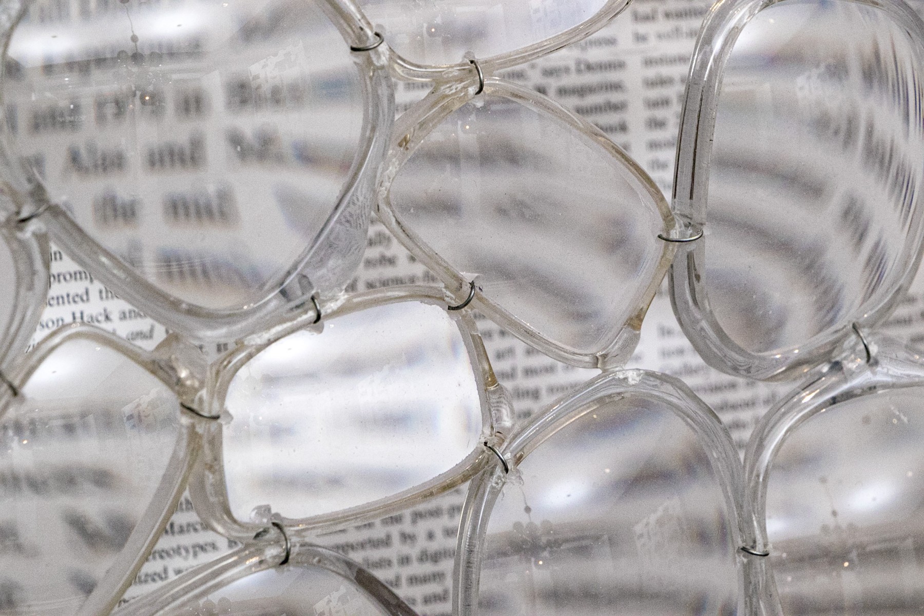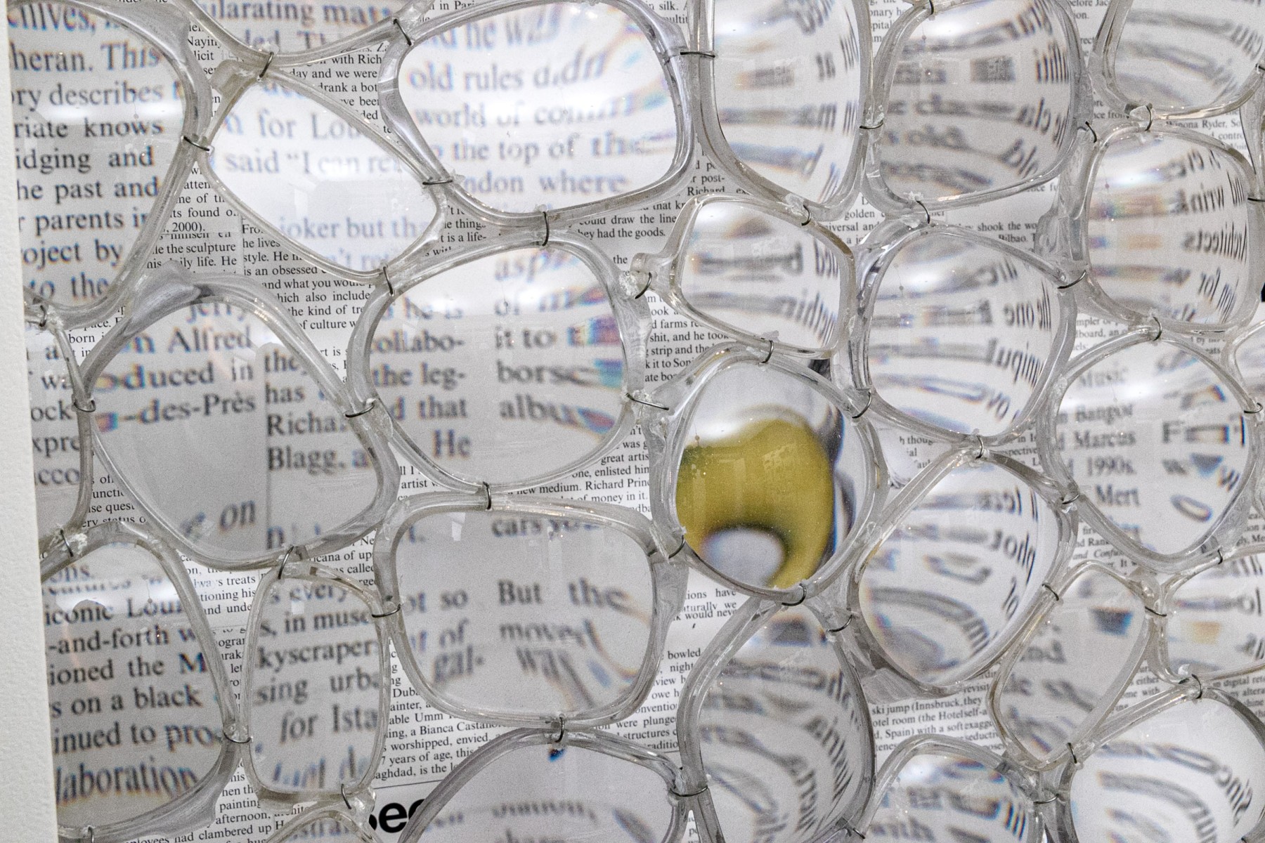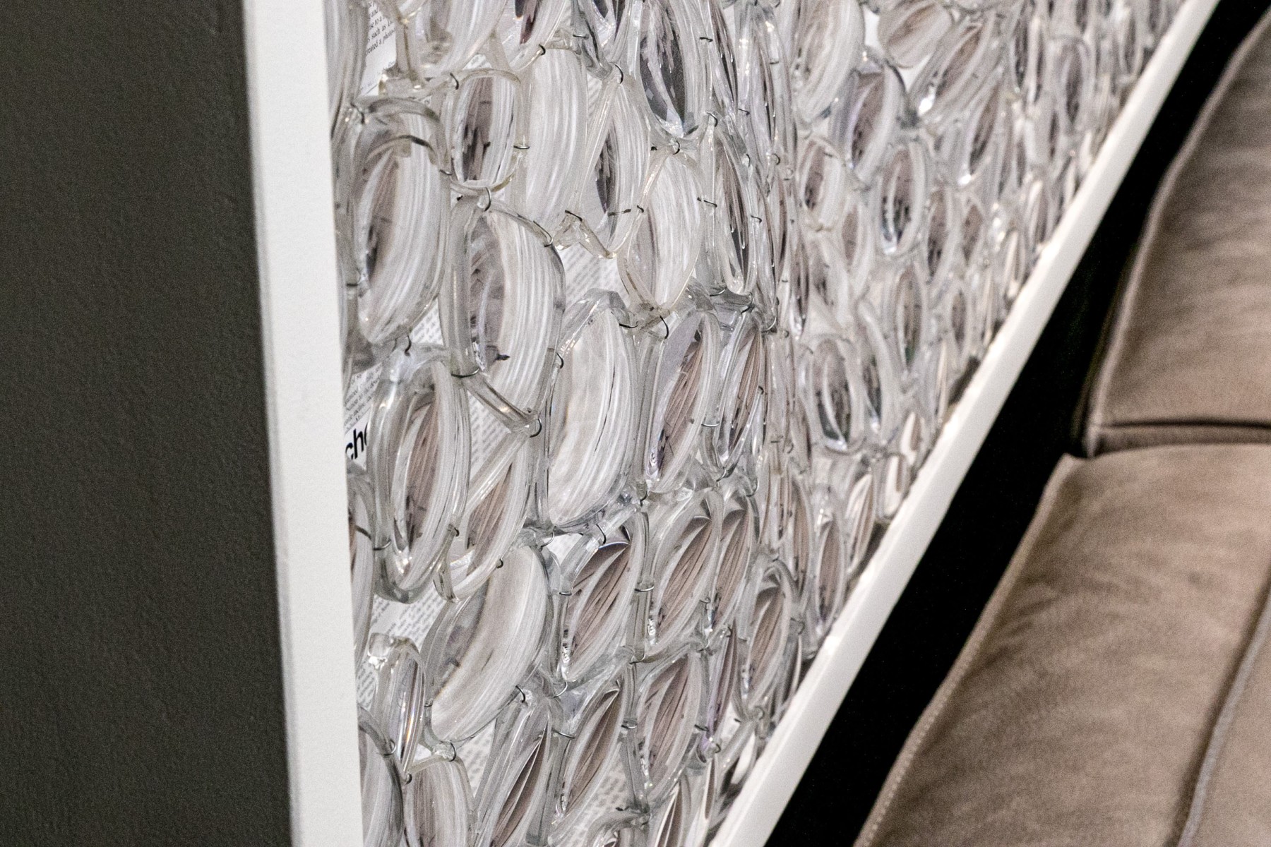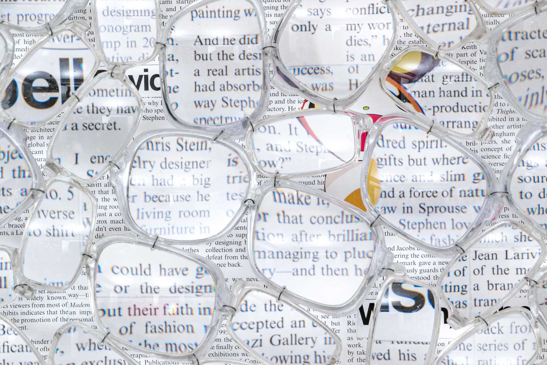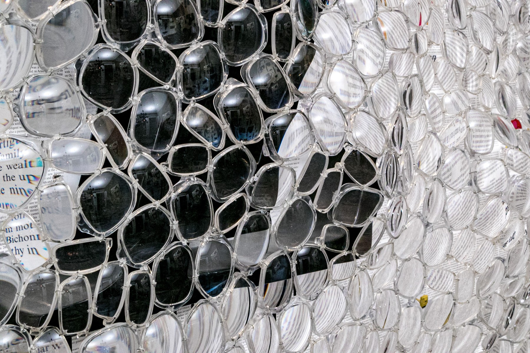 An extraordinary mixed media artwork featuring glasses lenses arranged in a mosaic over imagery that includes an LV motif at the center, surrounded by evocative wording. Presented within a sleek white lacquered finished frame, this piece is a testament to Datuna's innovative vision and artistic prowess. With provenance from Gilles Clement Westport Gallery in 2017, it represents a unique opportunity for collectors of contemporary art.