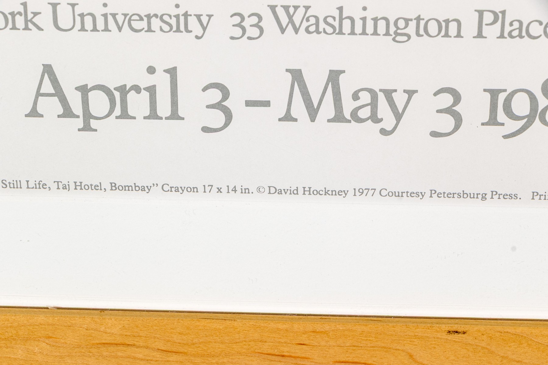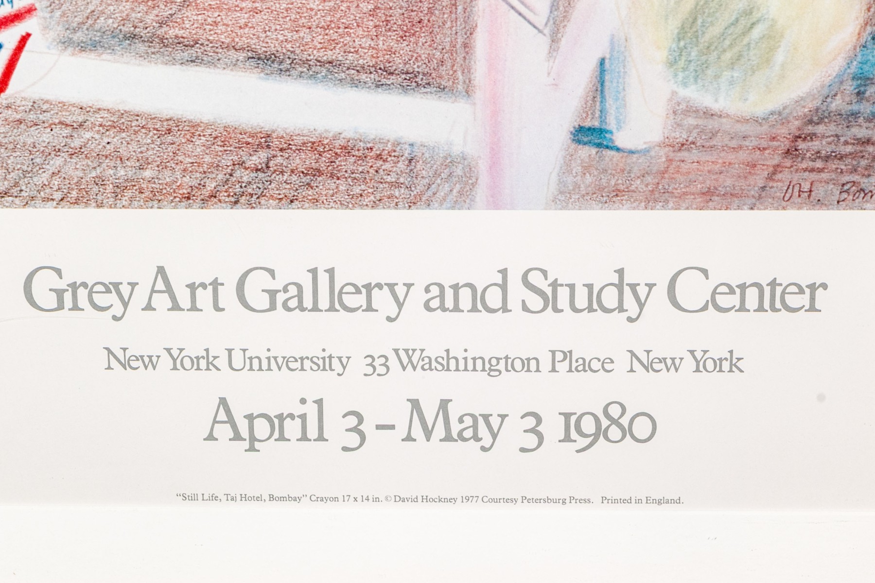 The fabulous poster print was made for Grey Art Gallery and Study Center at New York University between April and May of 1980. The poster depicts a work which is noted at the lower center of the poster print, "Still Life, Taj Hotel, Bombay" Crayon. The work was printed in England by David Hockney 1977 Courtesy Petersburg Press.