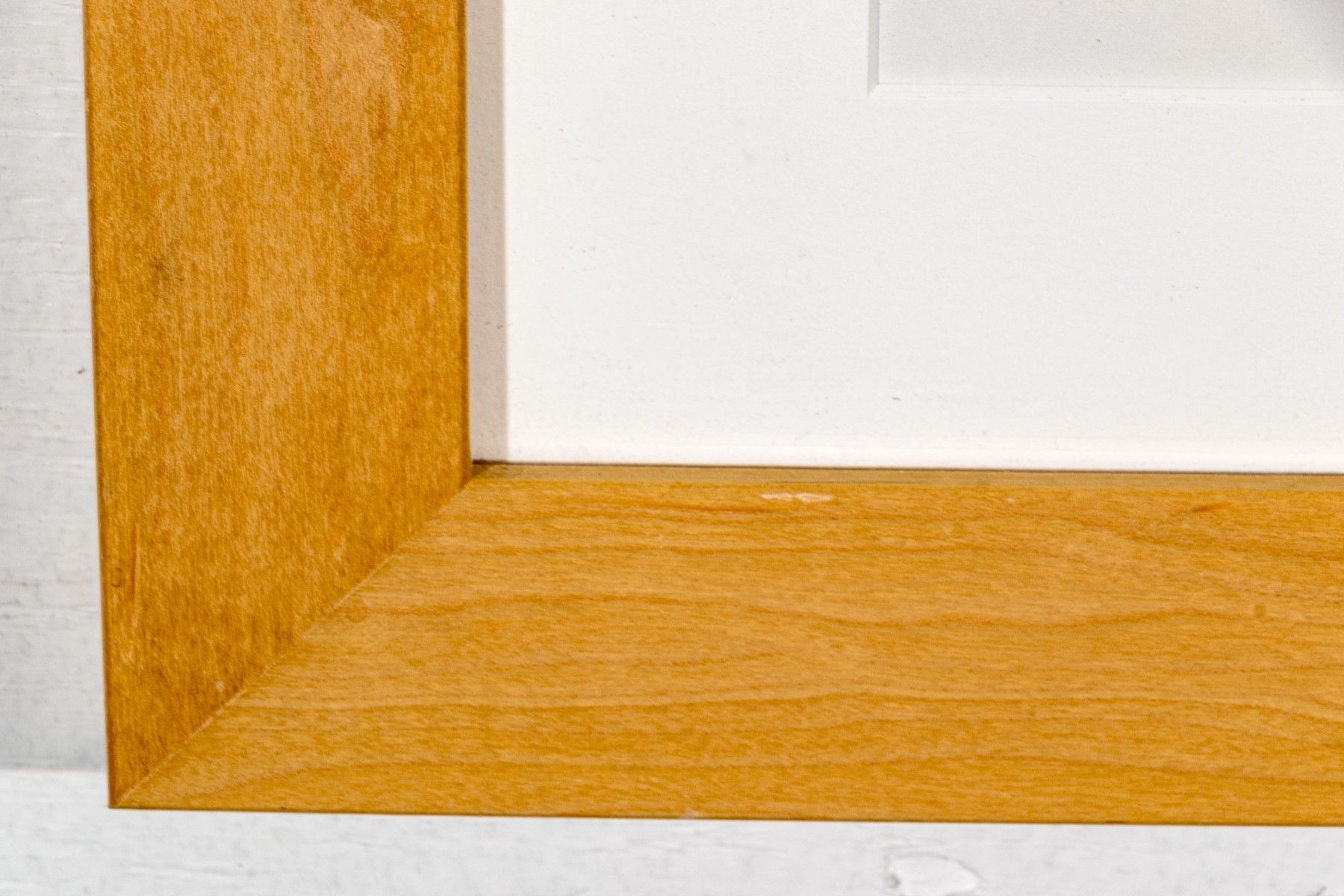 Custom framed and matted with a lightly stained wood frame and glazed.