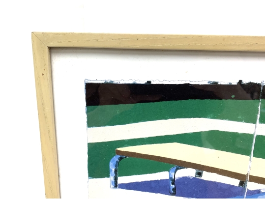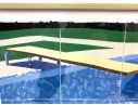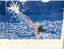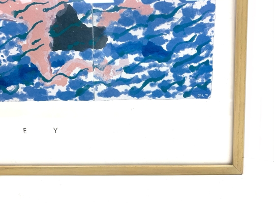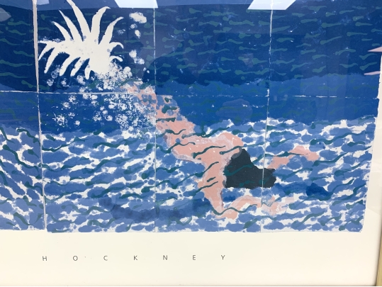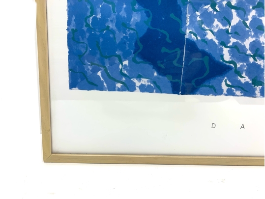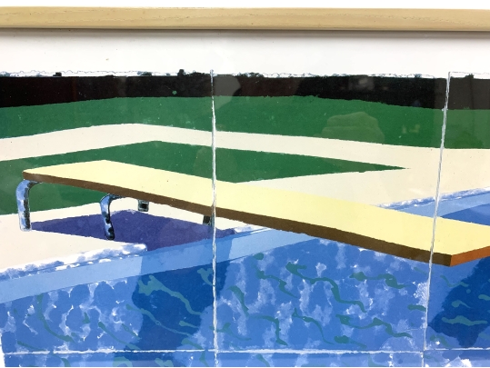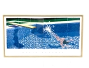 David Hockney print depicting a figure in a swimming pool with a diving board to the left.