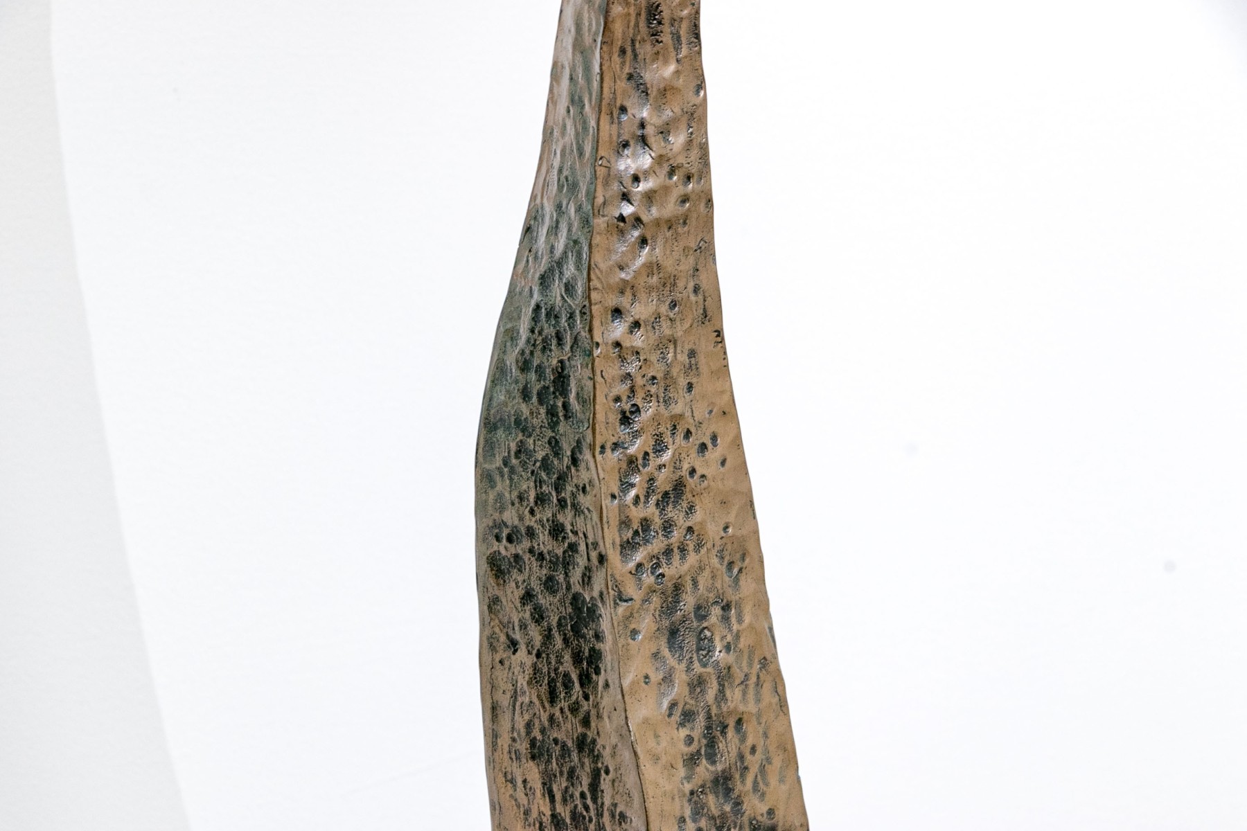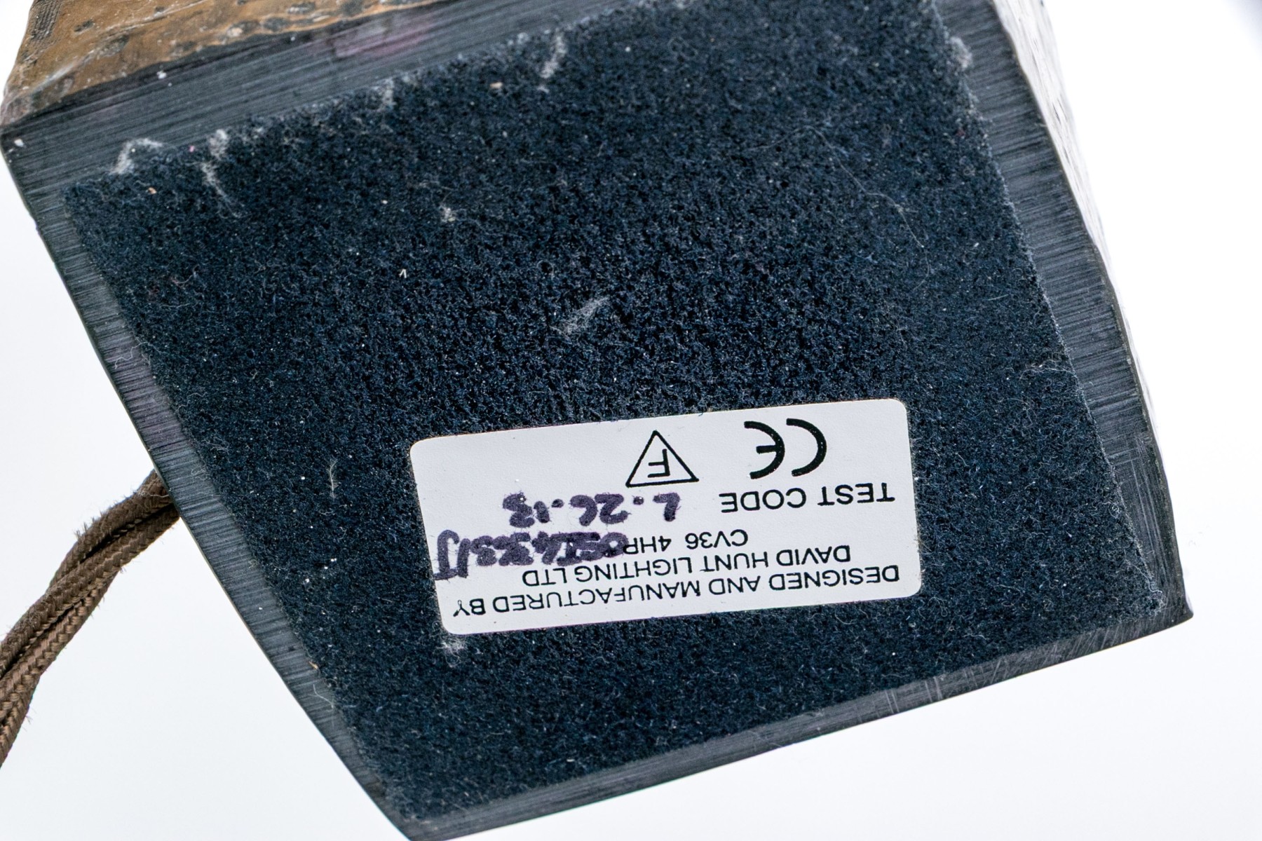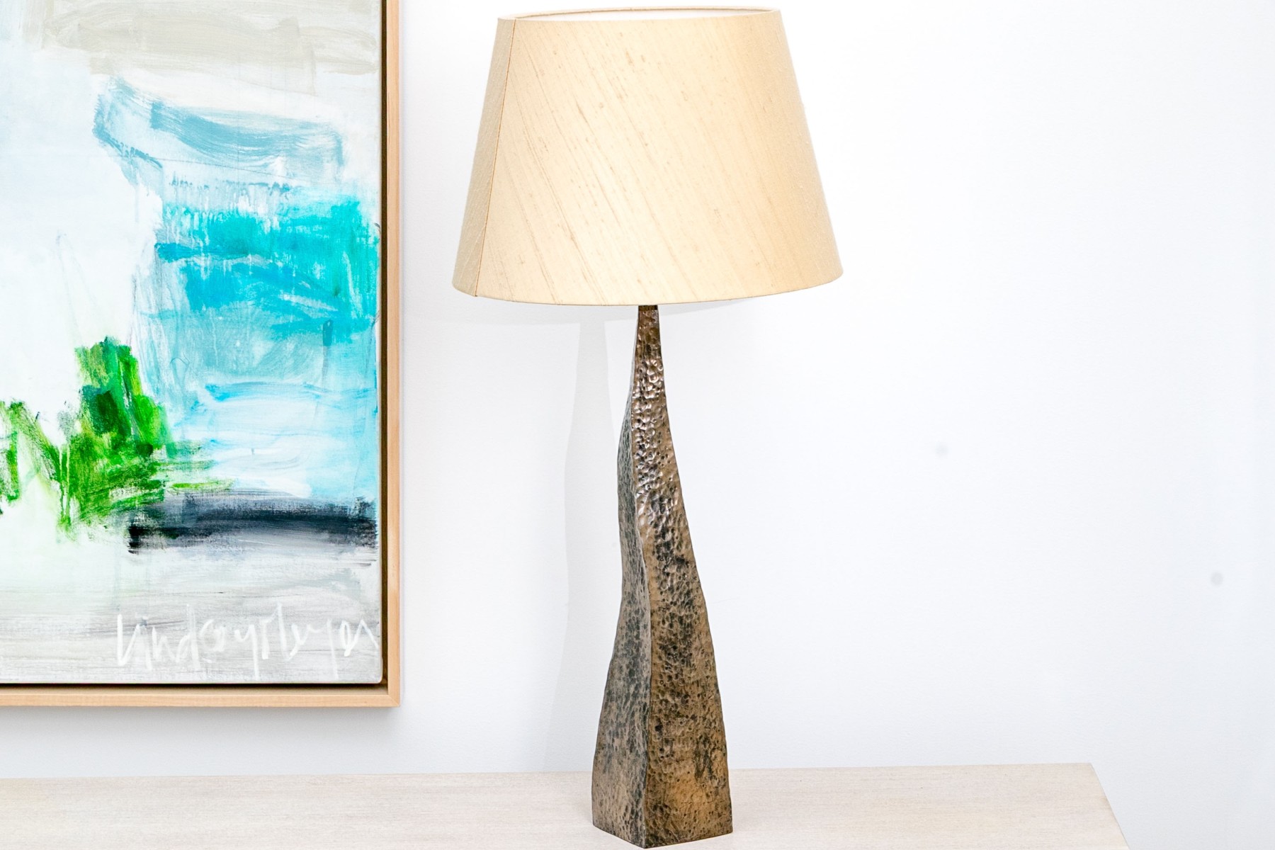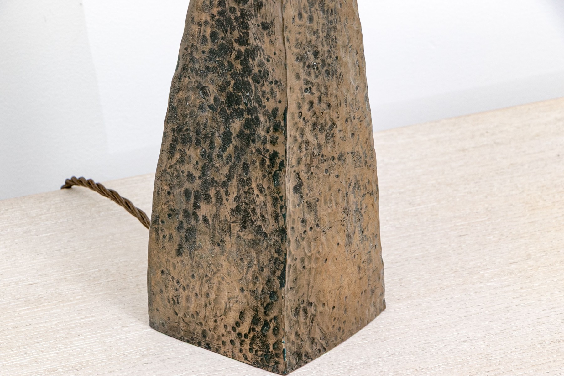 A stunning David Hunt Lighting Aztec style table lamp beautifully blending modern style with traditional flair. The lamp feature an organically waving square pyramidal form with gorgeous hammered texture in black and brown finished copper. Surmounted with a gently streaked cream hued empire shade.