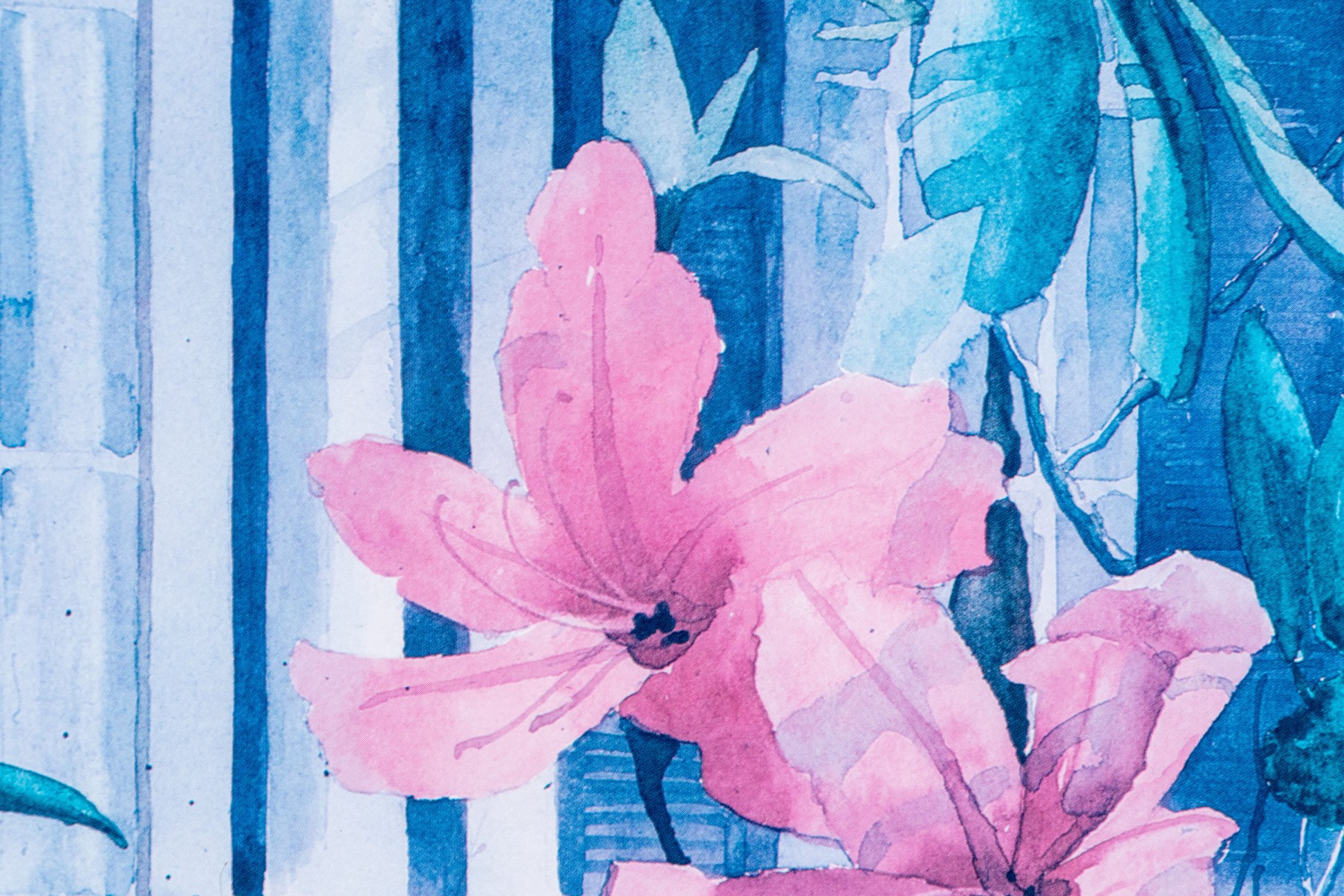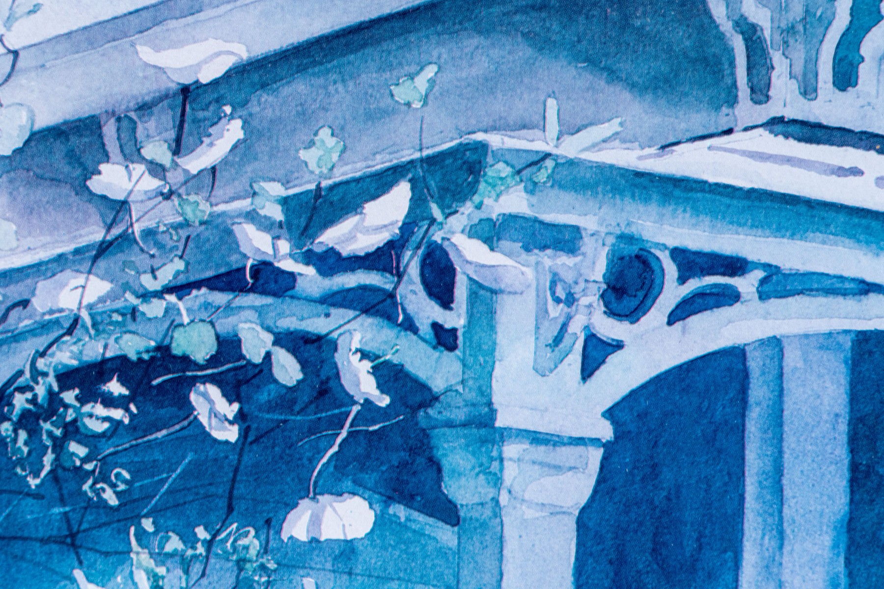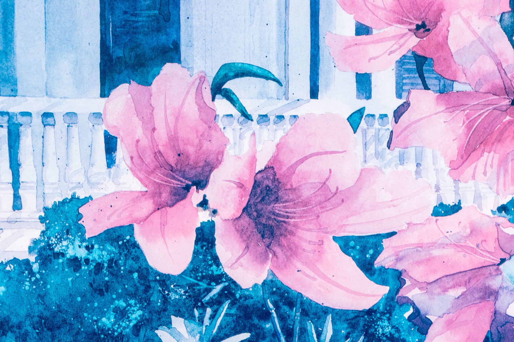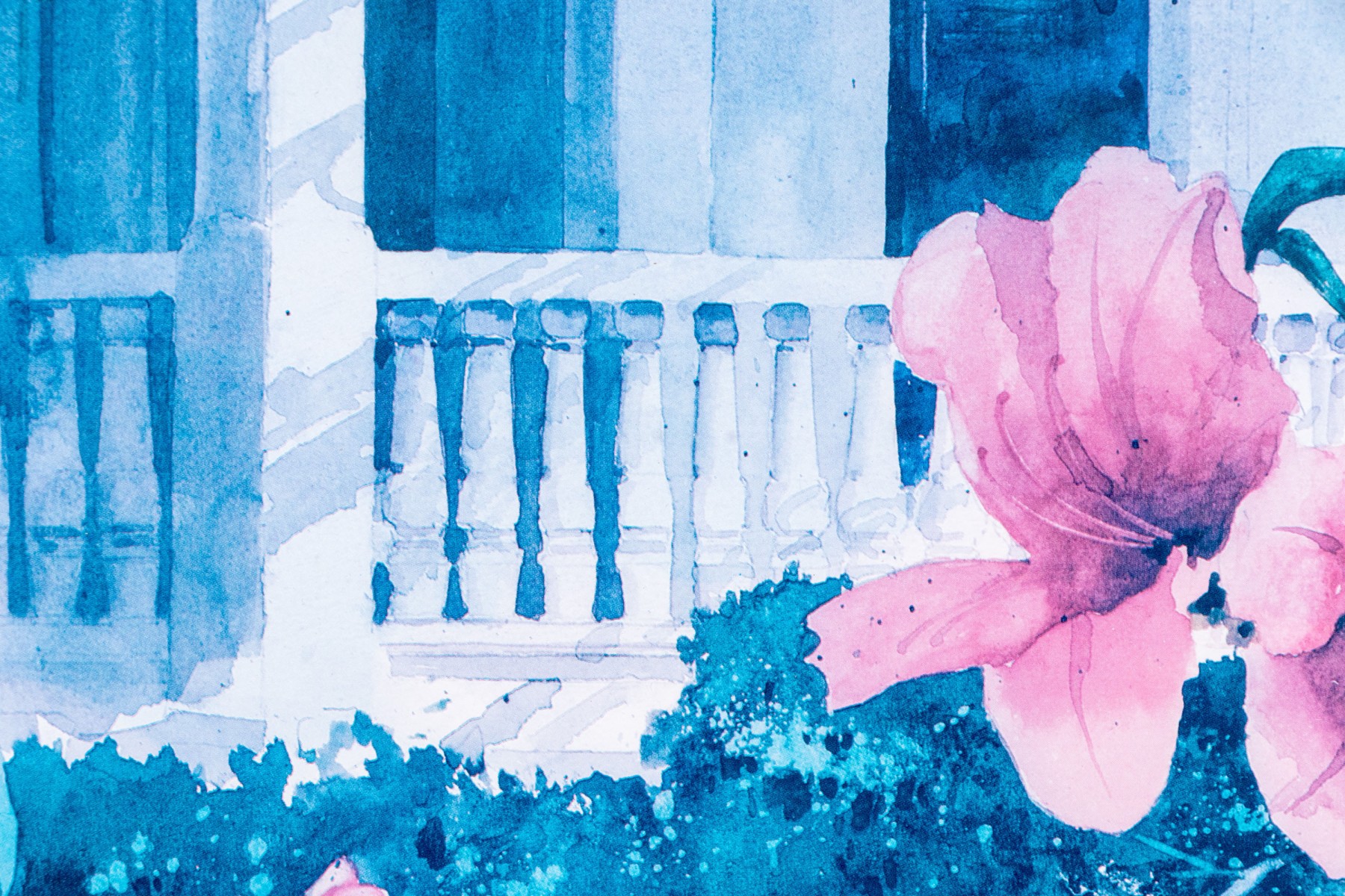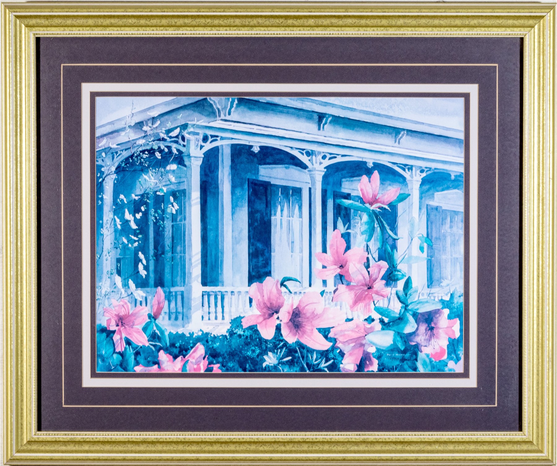 Signed and numbered 137/950 lower right. A fine white painted terrace with gingerbread trim framed by the garden with tall pink lilies. Presented in a gilt frame with glass.