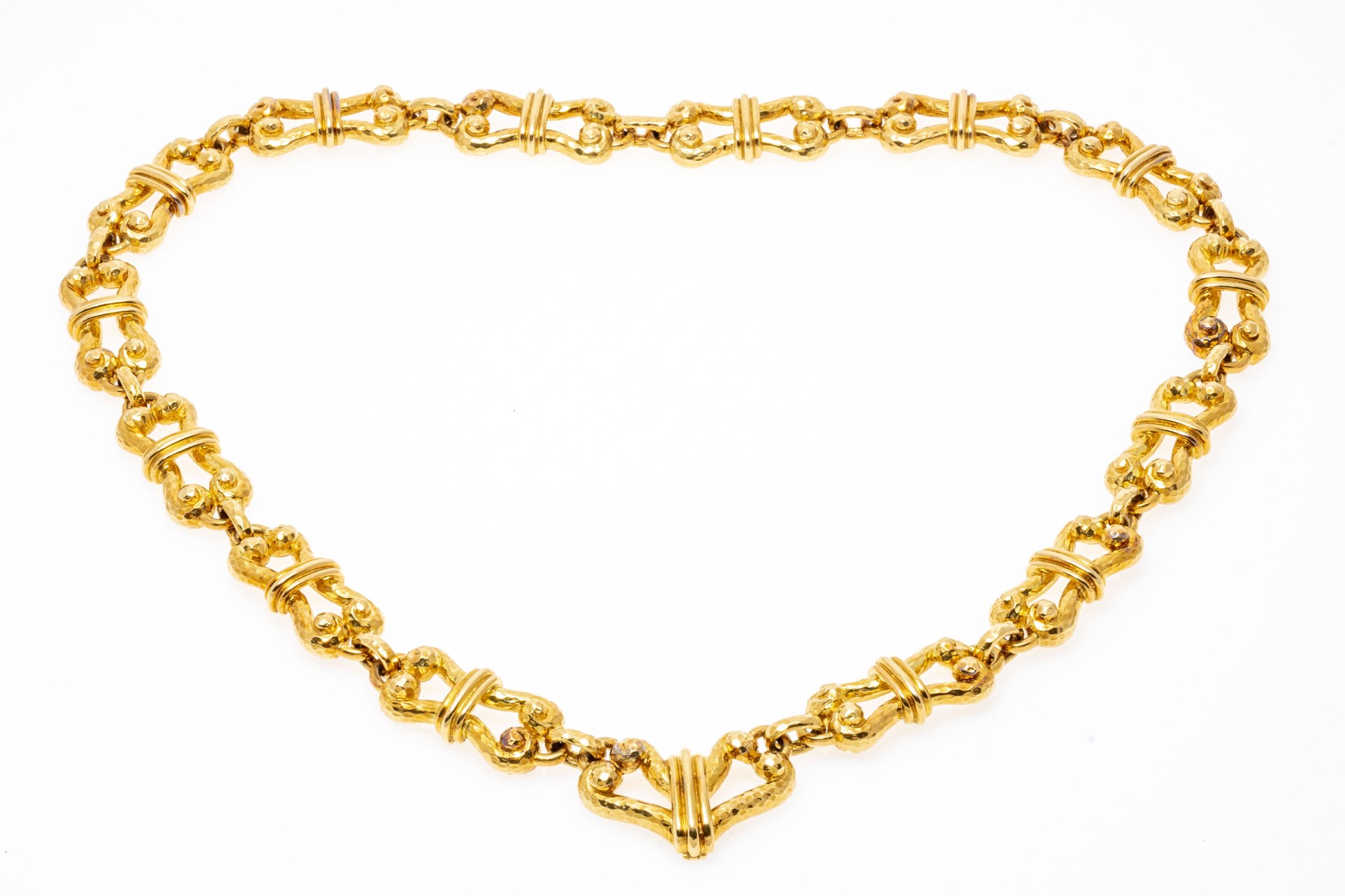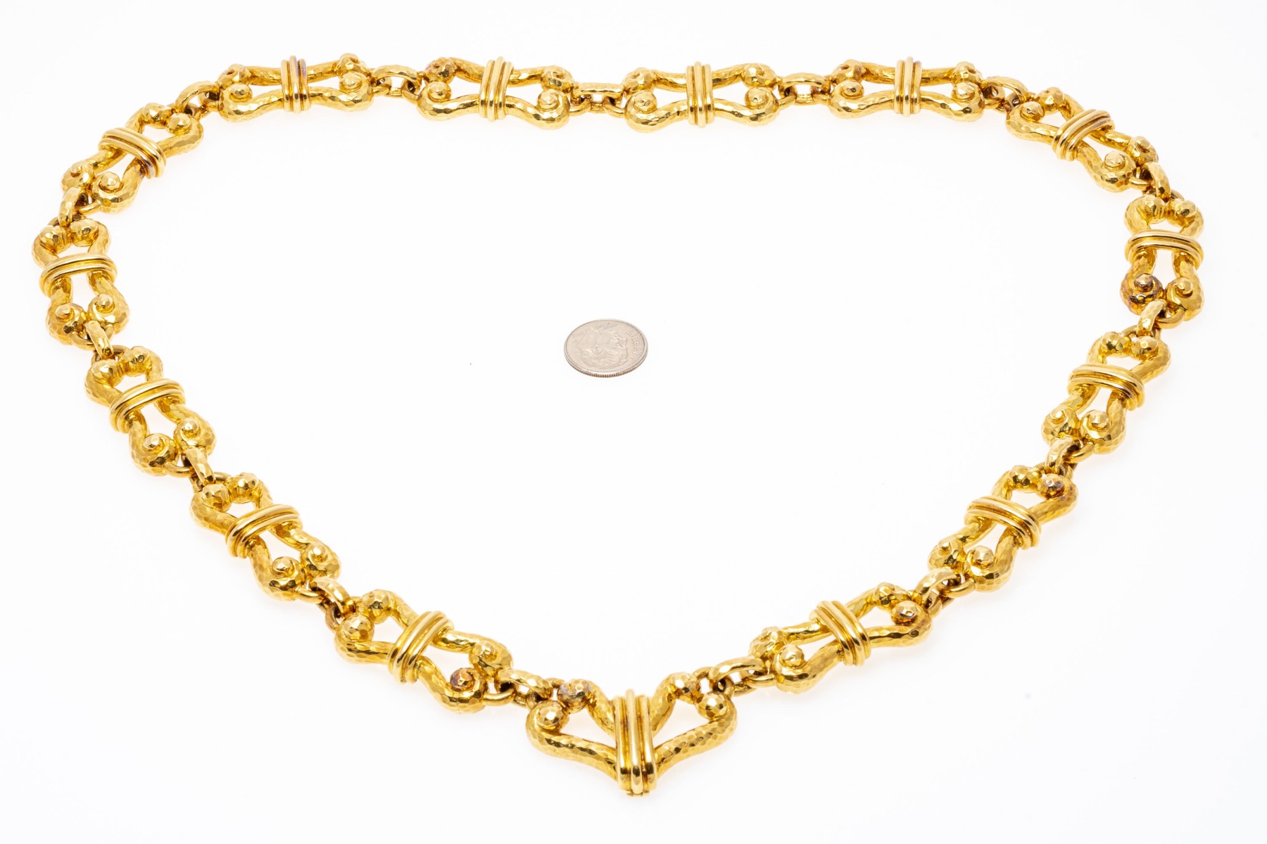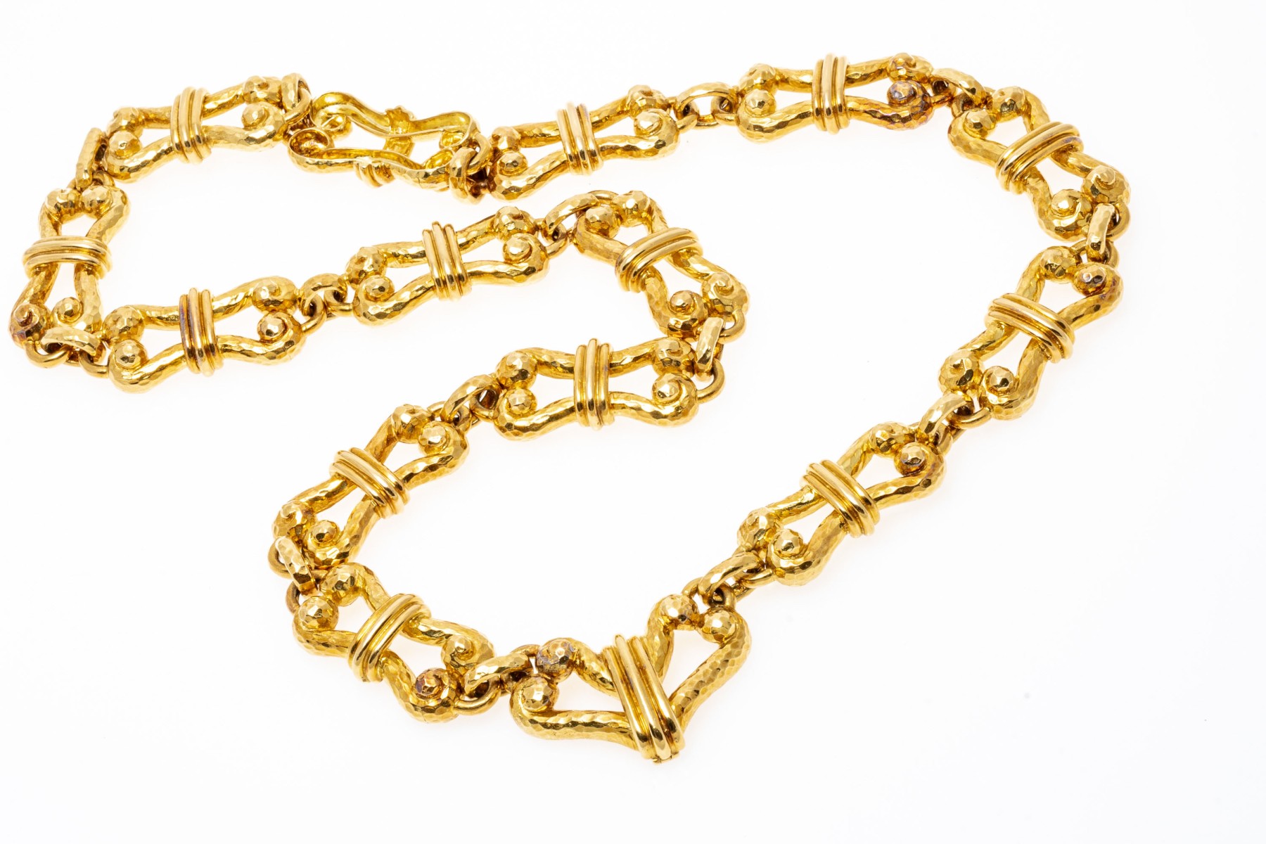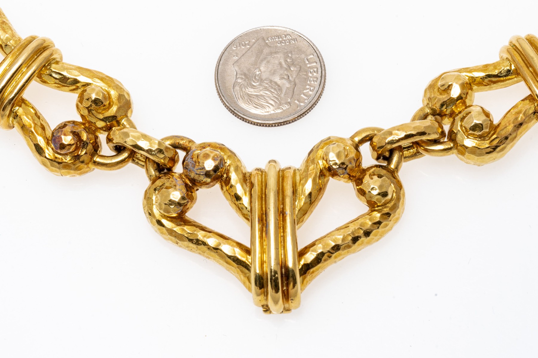 David Webb spectacular heavy vintage 18k yellow gold hammered link necklace, matinee length. This fabulous necklace is made up of hammered, scrolled links, gathered with a ribbed center, and finished with a half scrolled "v" style center, with a hinged center bale that can accommodate a pendant or brooch (not included). The necklace is finished by an integral style foldover clasp. With box