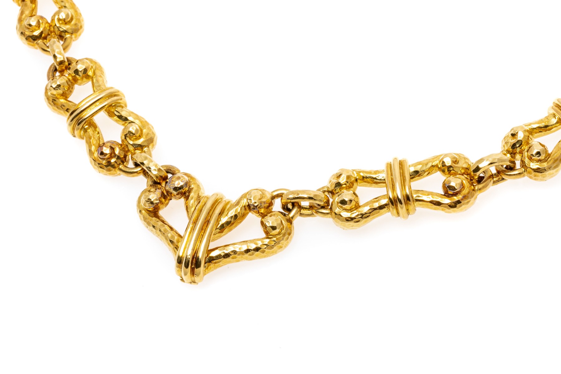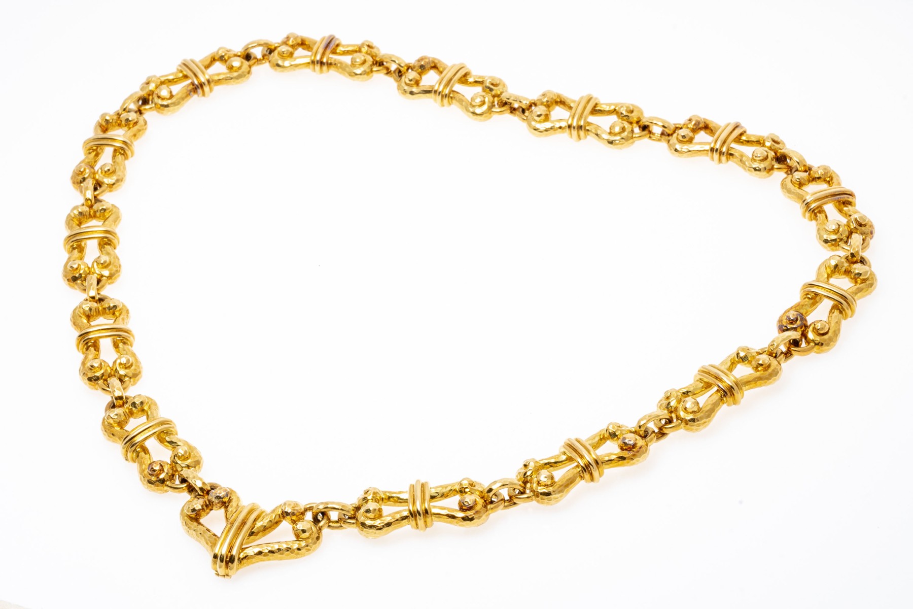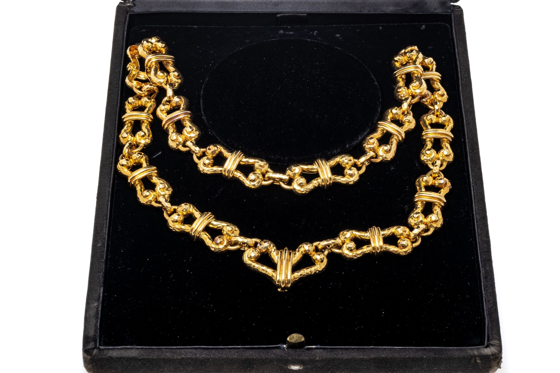 David Webb spectacular heavy vintage 18k yellow gold hammered link necklace, matinee length. This fabulous necklace is made up of hammered, scrolled links, gathered with a ribbed center, and finished with a half scrolled "v" style center, with a hinged center bale that can accommodate a pendant or brooch (not included). The necklace is finished by an integral style foldover clasp. With box