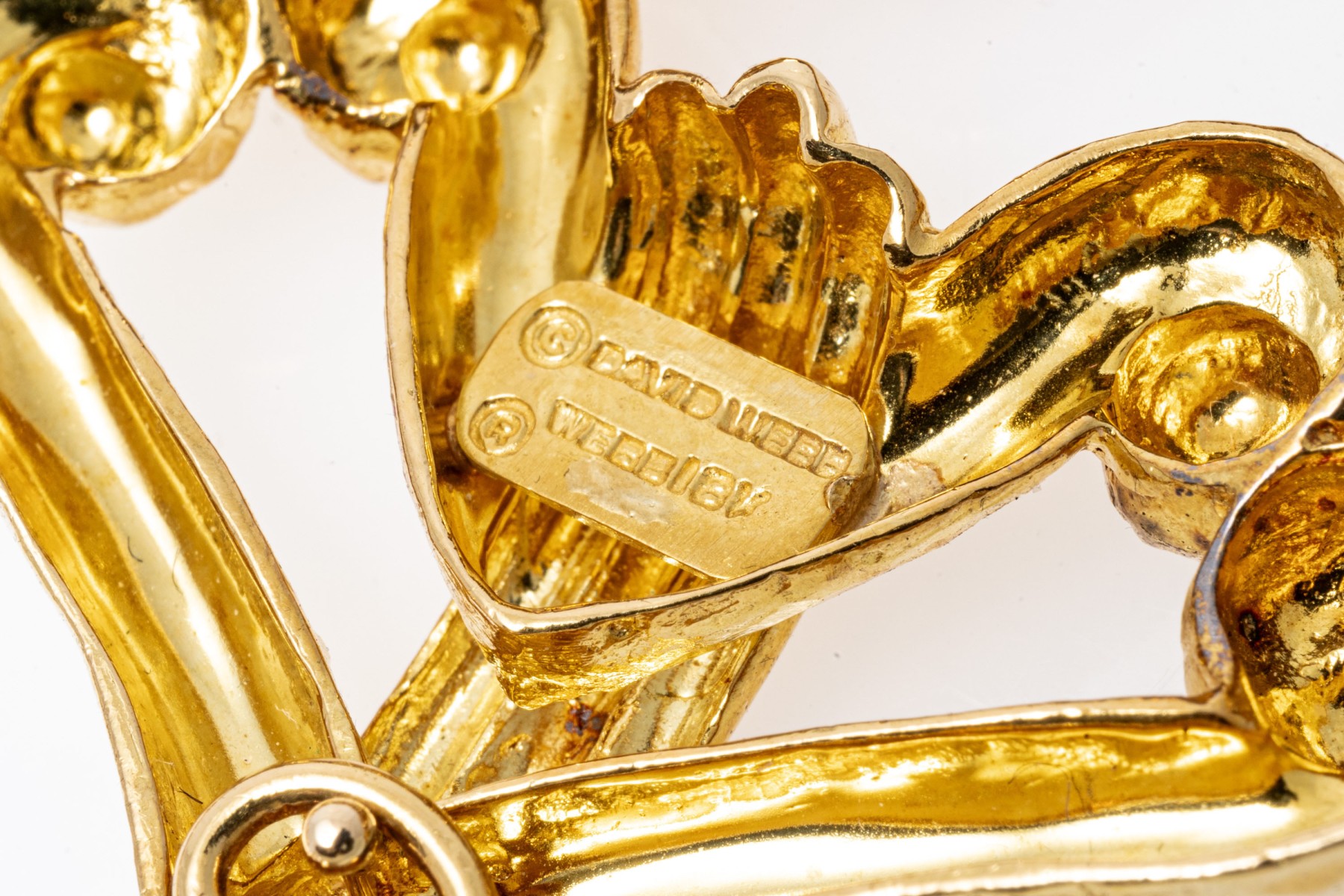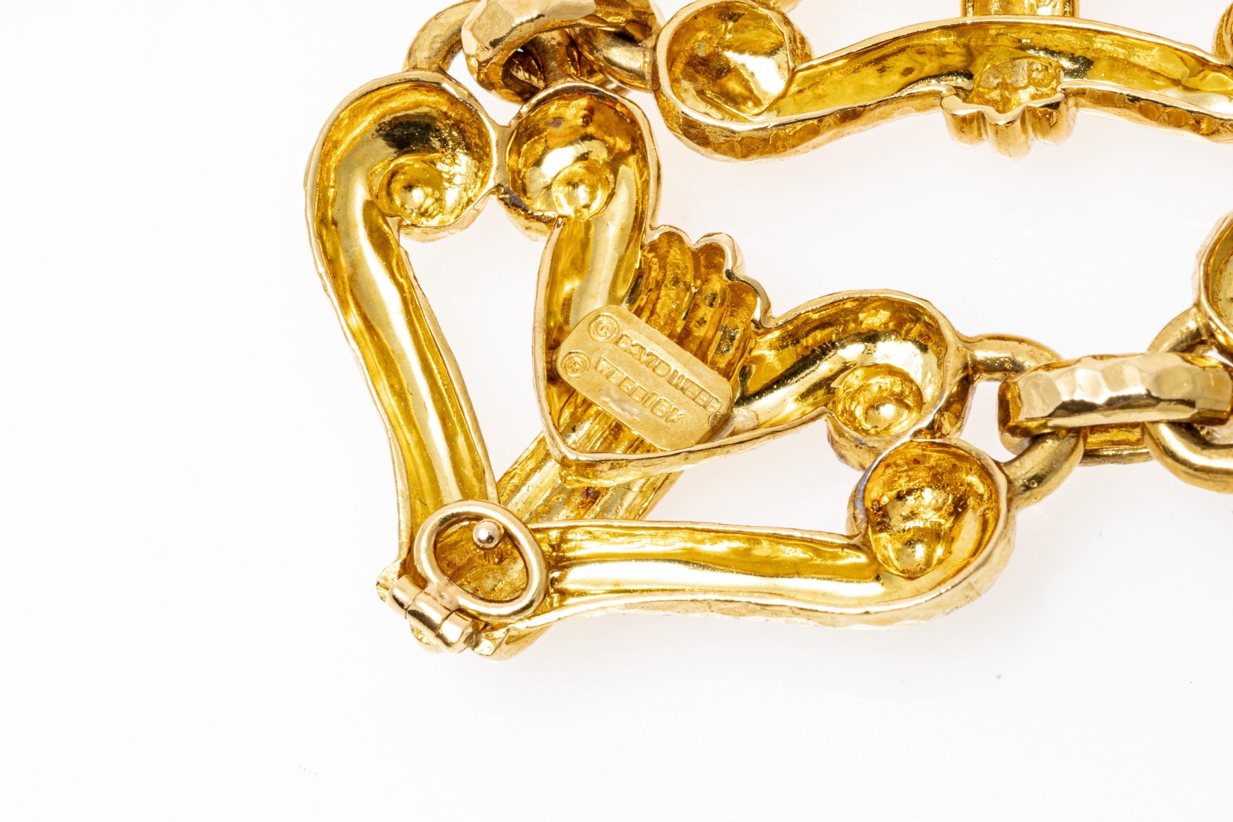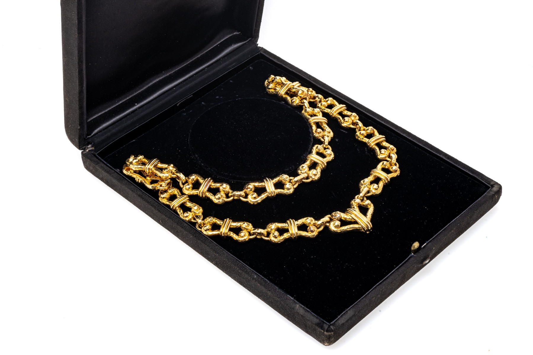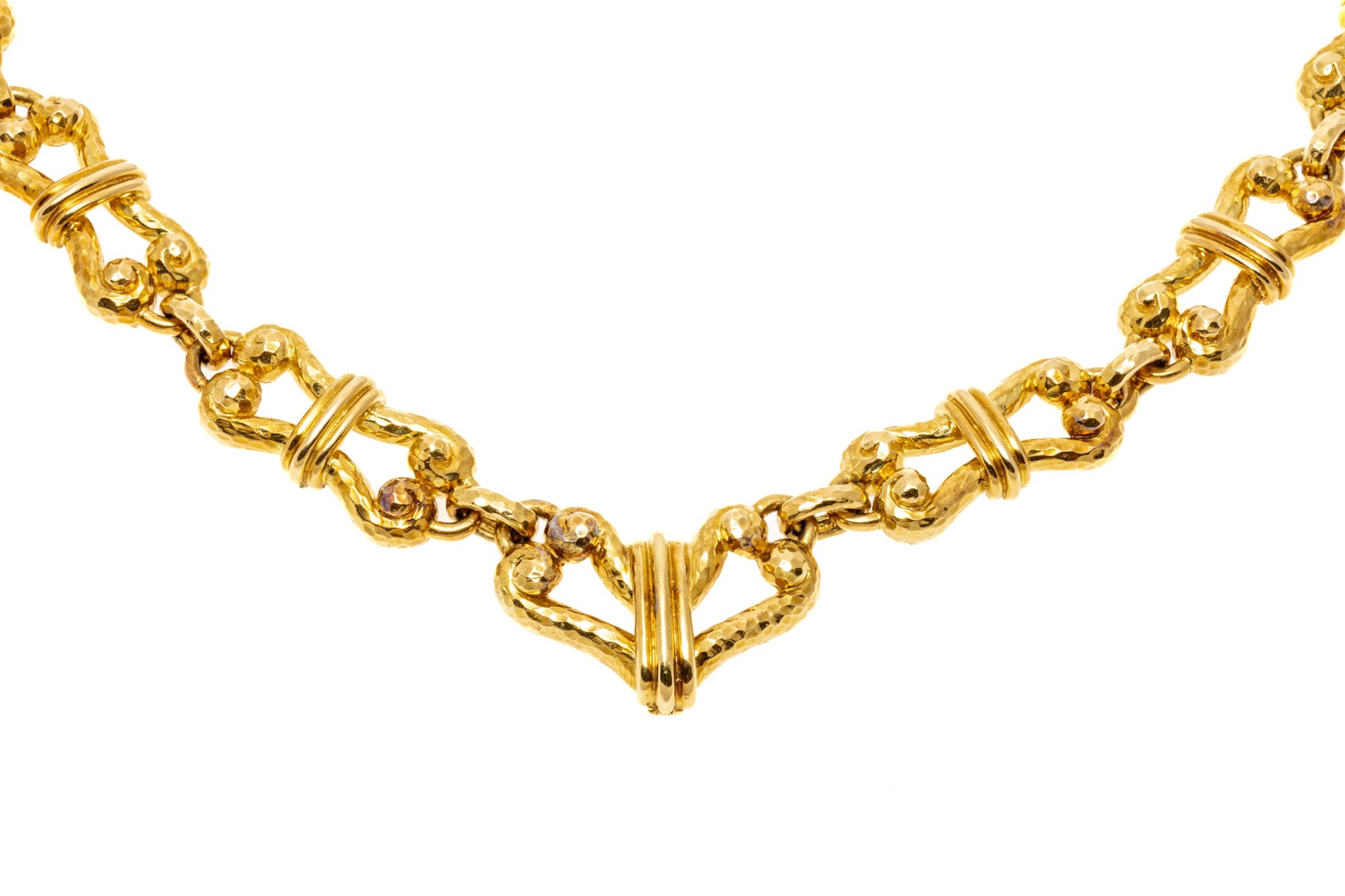 David Webb spectacular heavy vintage 18k yellow gold hammered link necklace, matinee length. This fabulous necklace is made up of hammered, scrolled links, gathered with a ribbed center, and finished with a half scrolled "v" style center, with a hinged center bale that can accommodate a pendant or brooch (not included). The necklace is finished by an integral style foldover clasp. With box