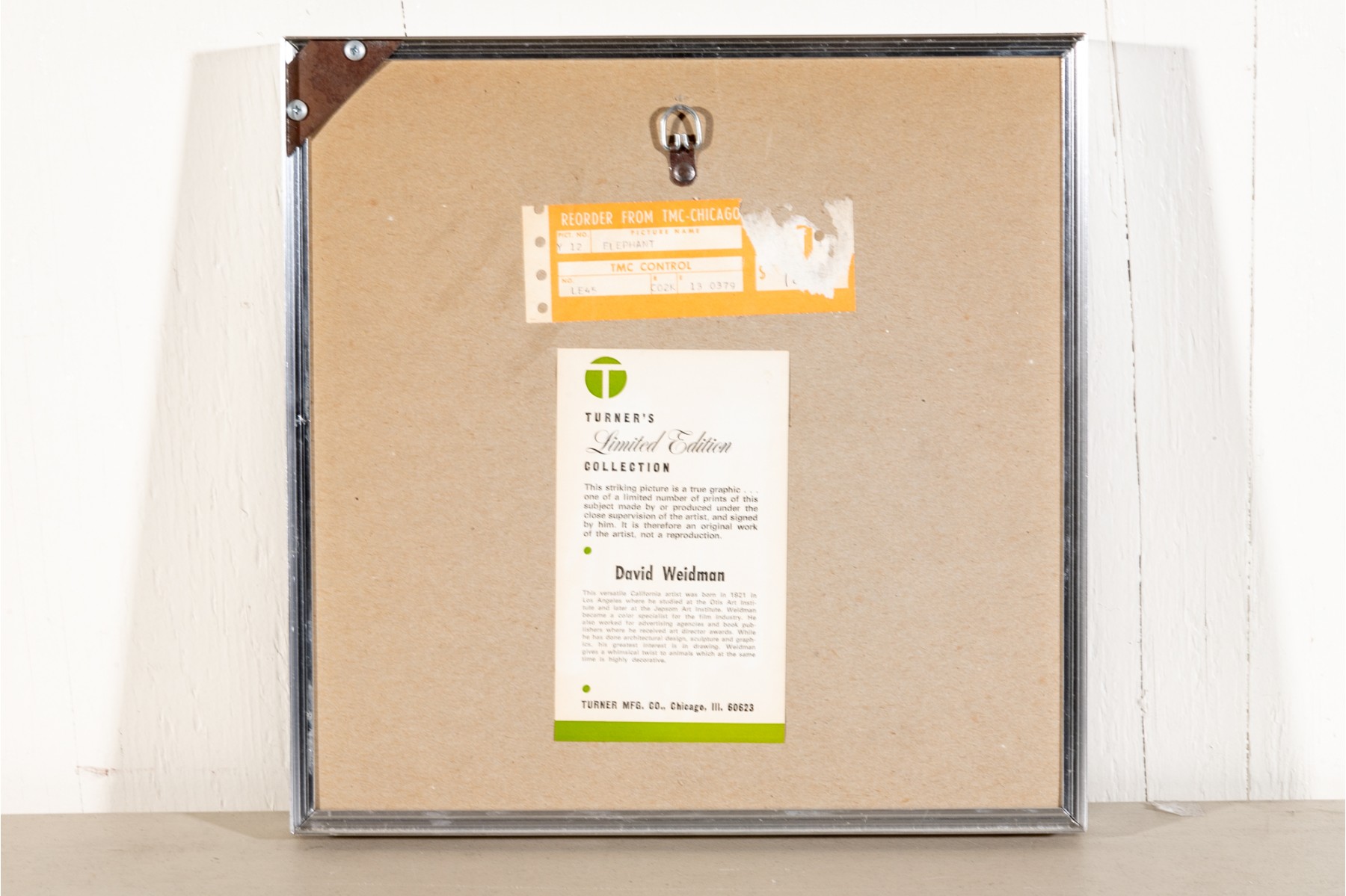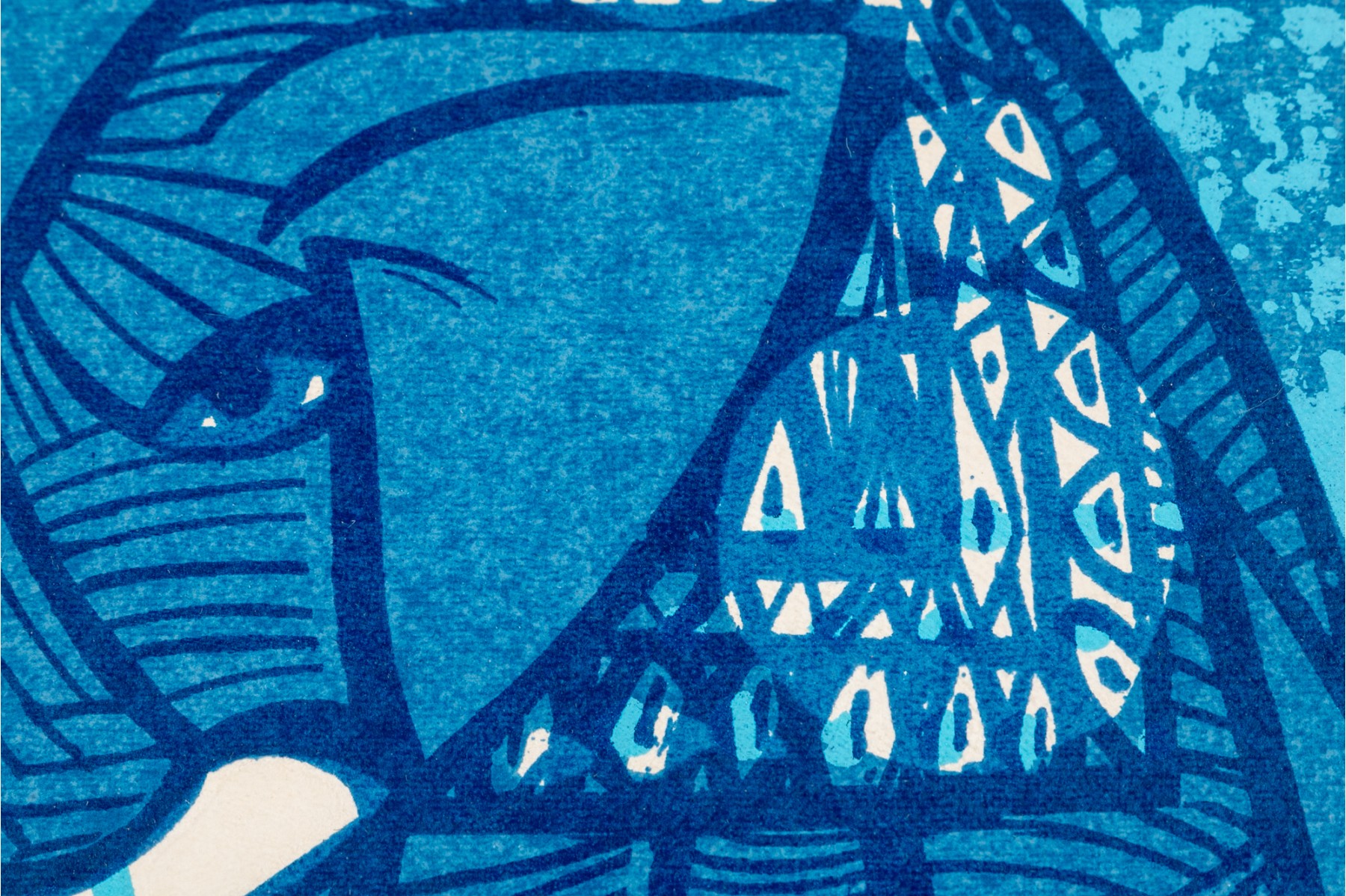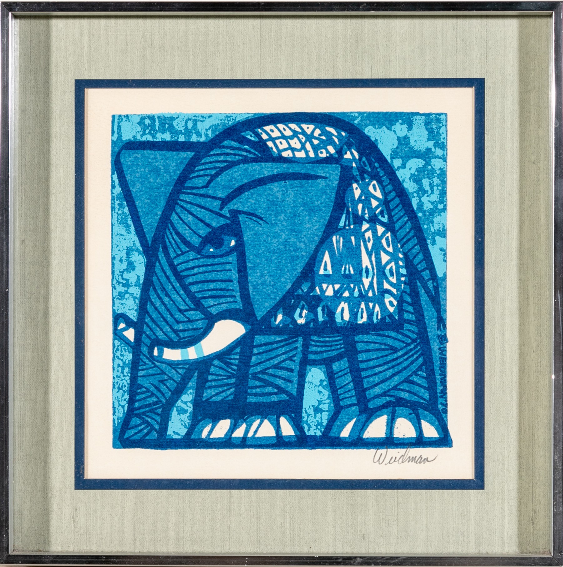 A print depicting a blue tonal elephant set against a blue background. Turner Limited edition Collection label on verso.