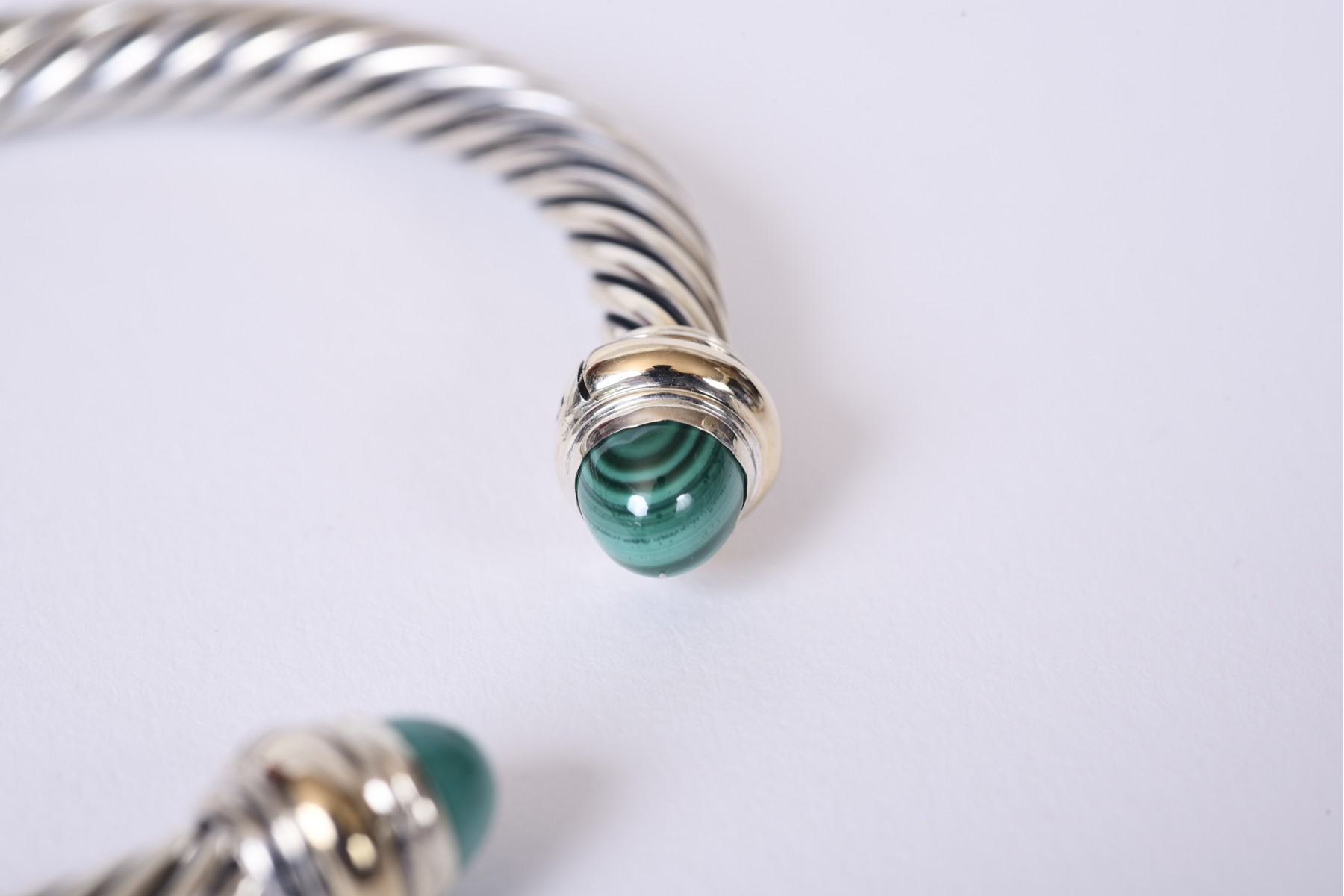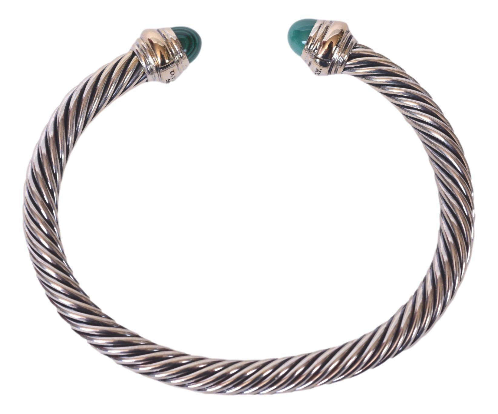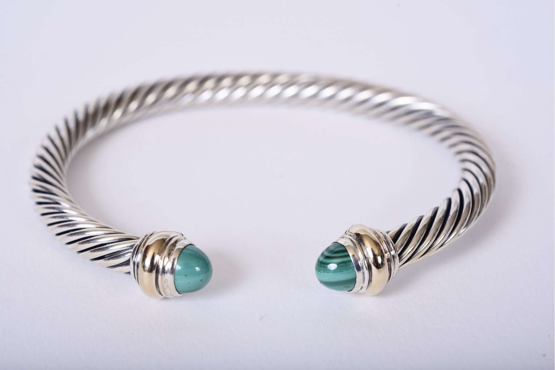 The David Yurman Cable Classic Sterling 14 Karat Gold Cuff Bracelet is a stunning piece of jewelry that combines elegance and sophistication. This cuff bracelet features the iconic cable design that David Yurman is known for, crafted in sterling silver and enhanced with malachite. The addition of 14 karat gold accents adds a touch of luxury and warmth to the overall look. Includes the David Yurman storage pouch.