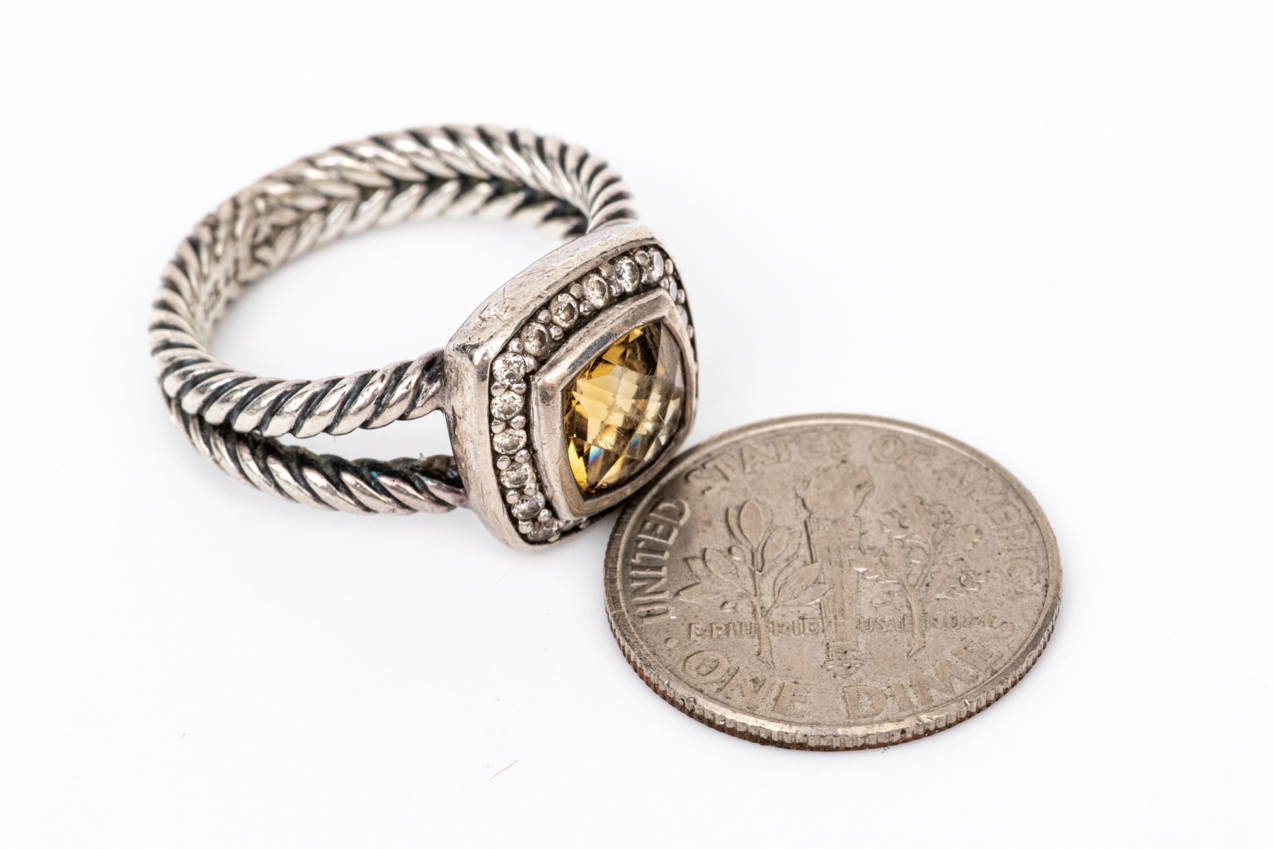 David Yurman sterling silver "Petite Albion" ring, set with a center checkerboard cushion cut citrine, 1.45 CTS, surrounded by a halo of round faceted diamonds, 0.16 TCW, and finished with a split cable shank.