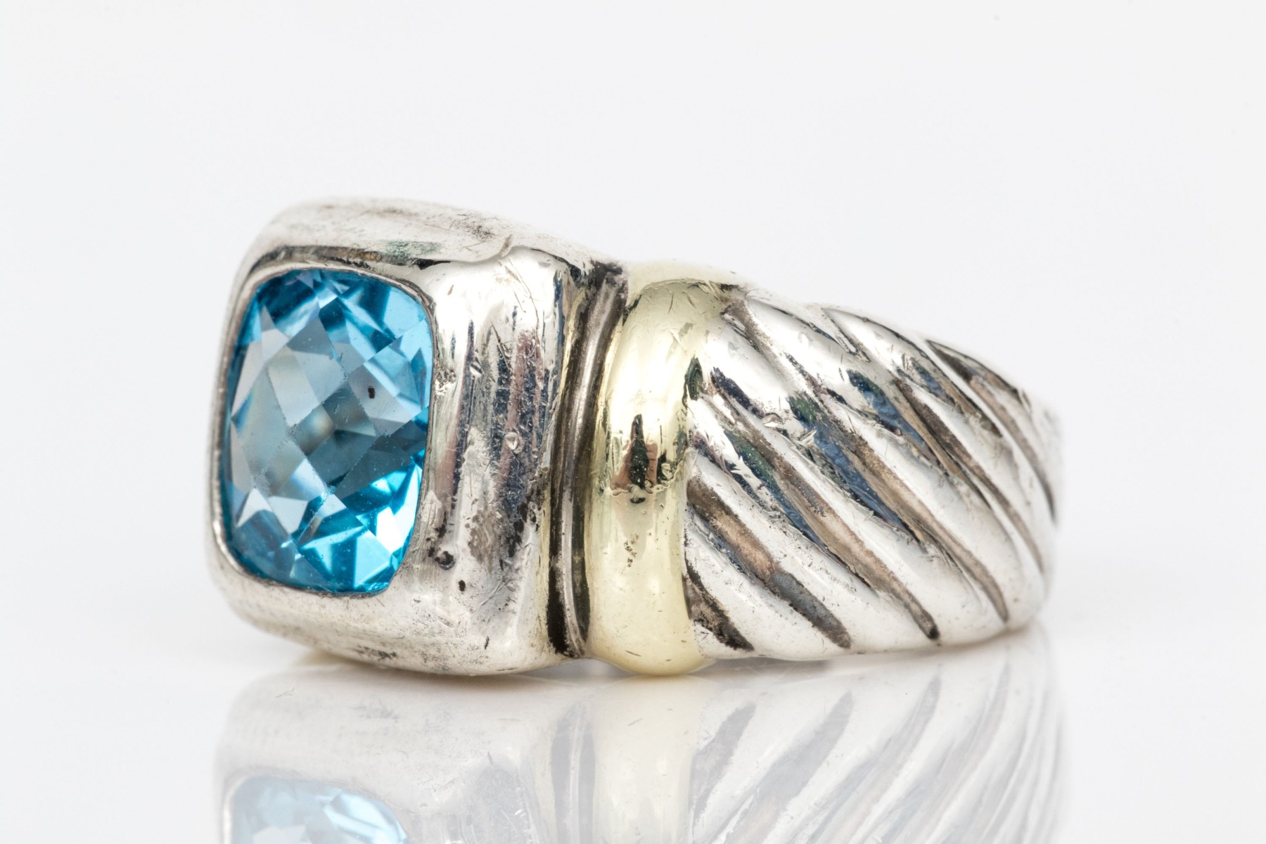 David Yurman sterling silver and 14k beautiful checkerboard blue topaz cable ring, size 4.5