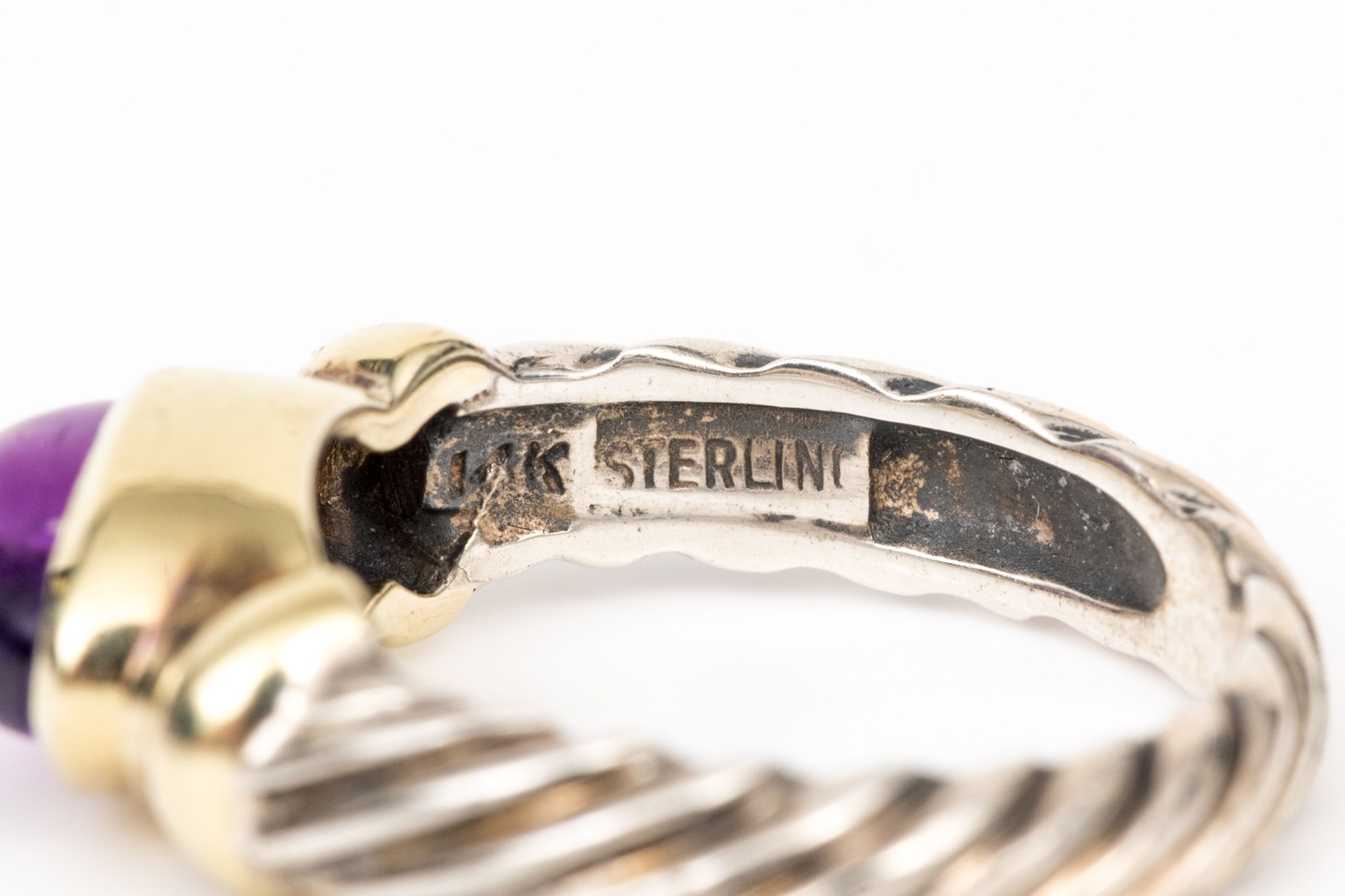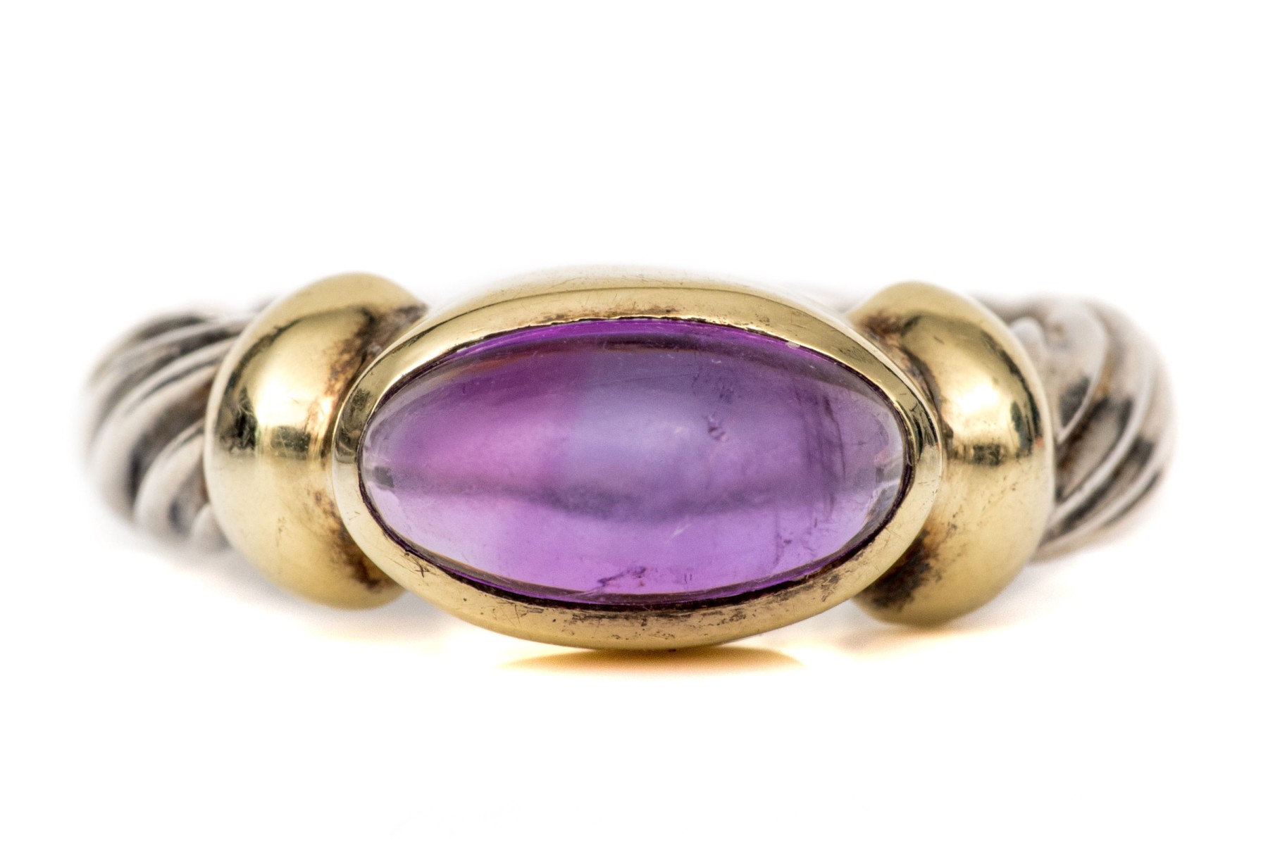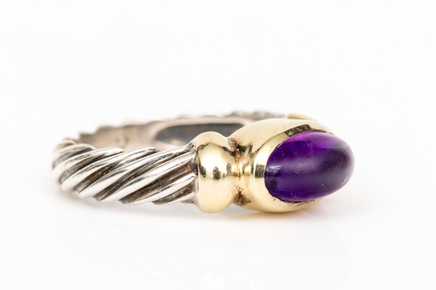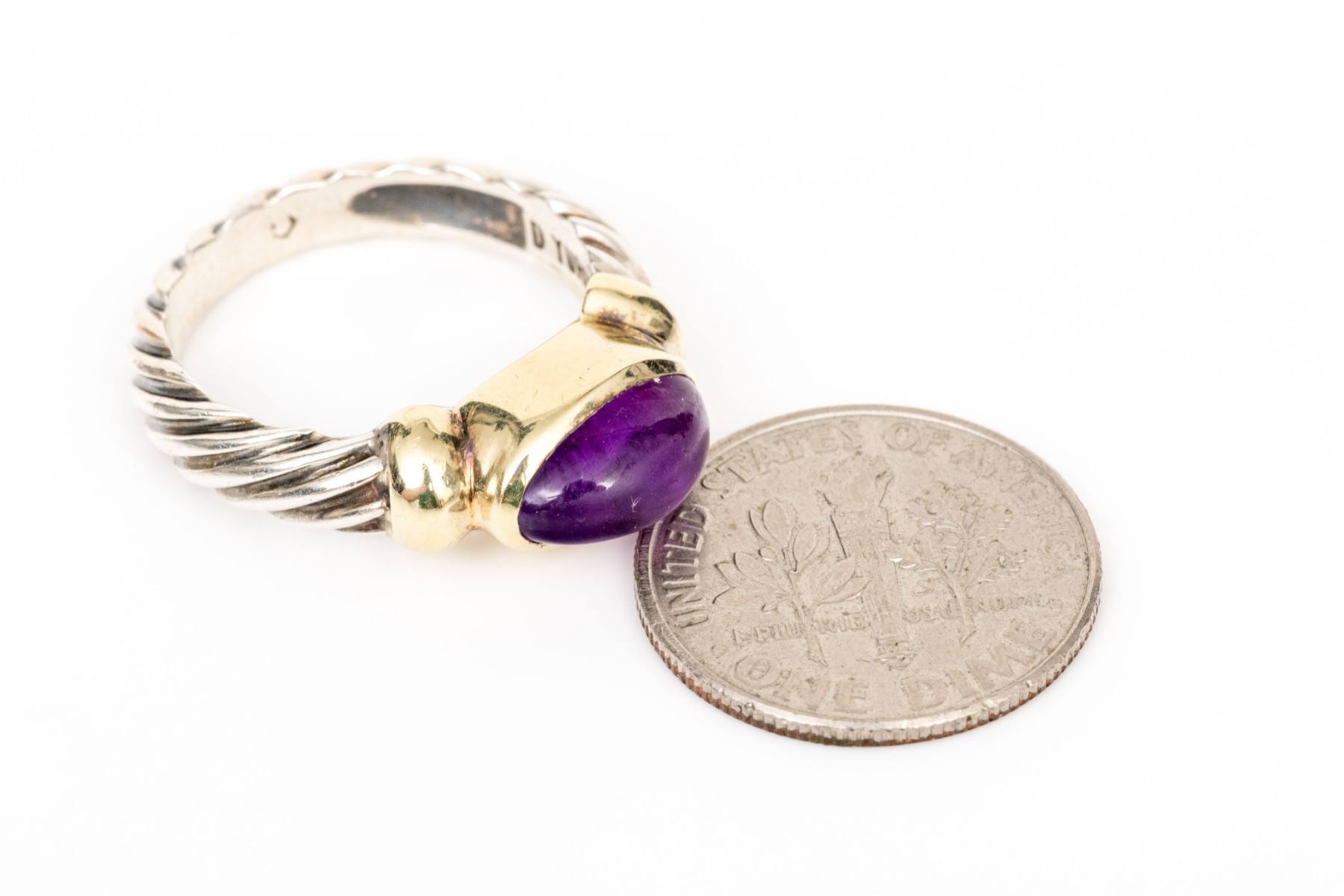 David Yurman sterling silver and 14k yellow gold amethyst cabachon cable ring, size 5.75