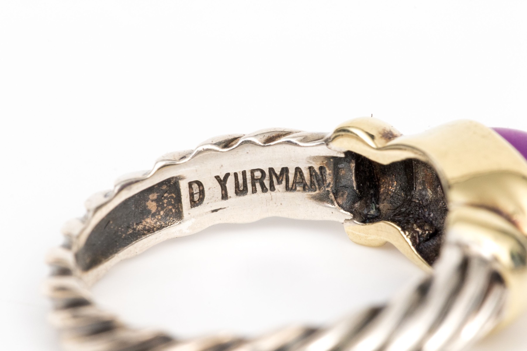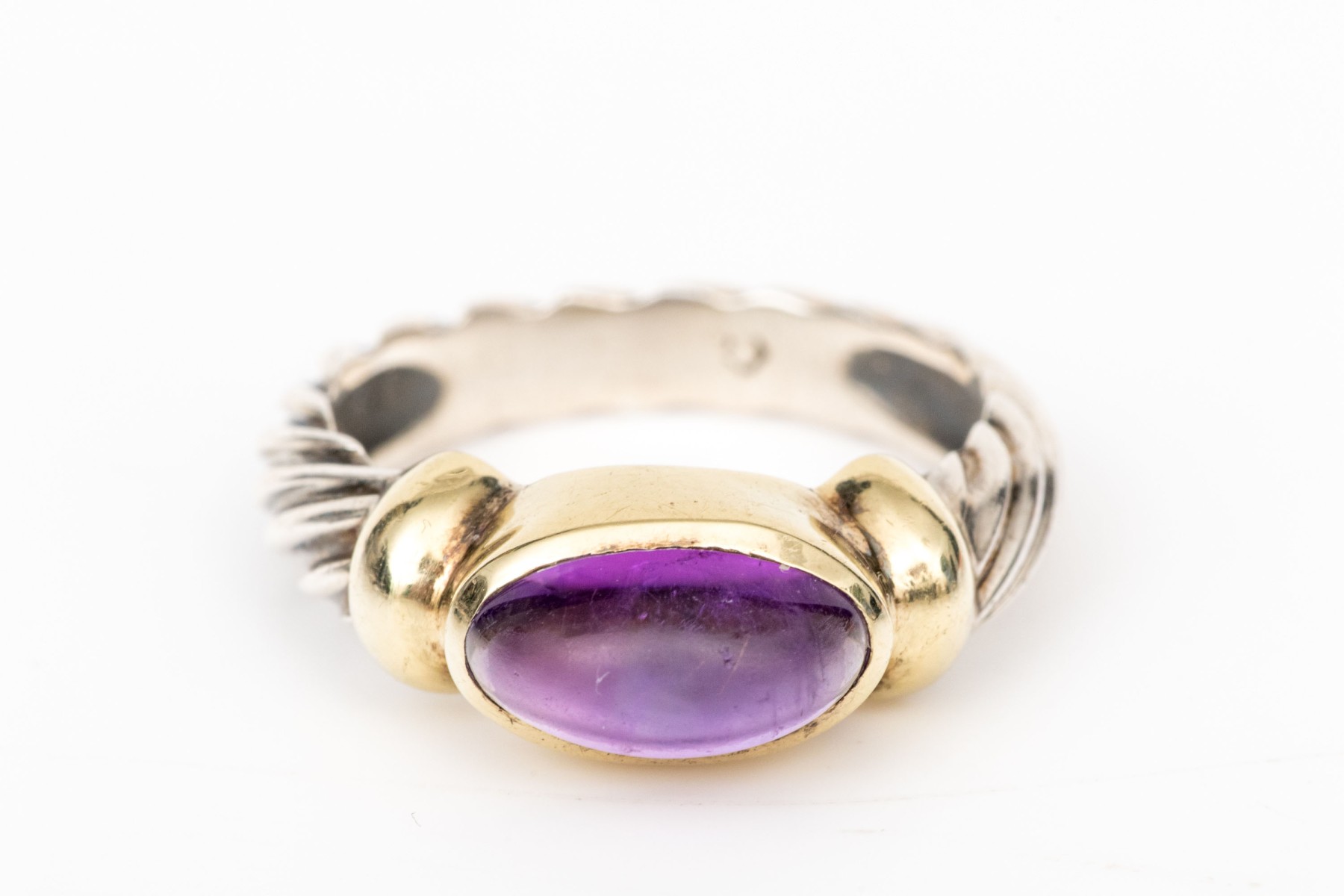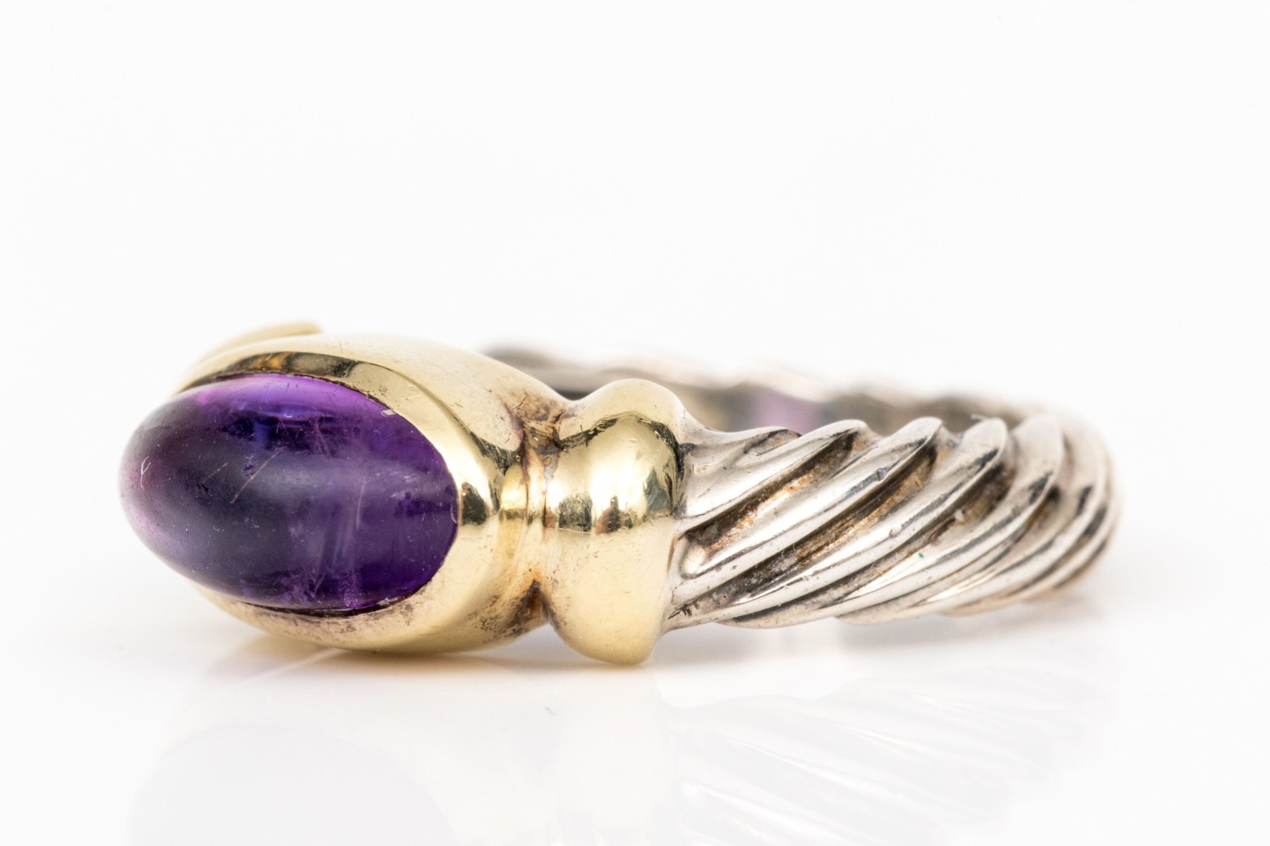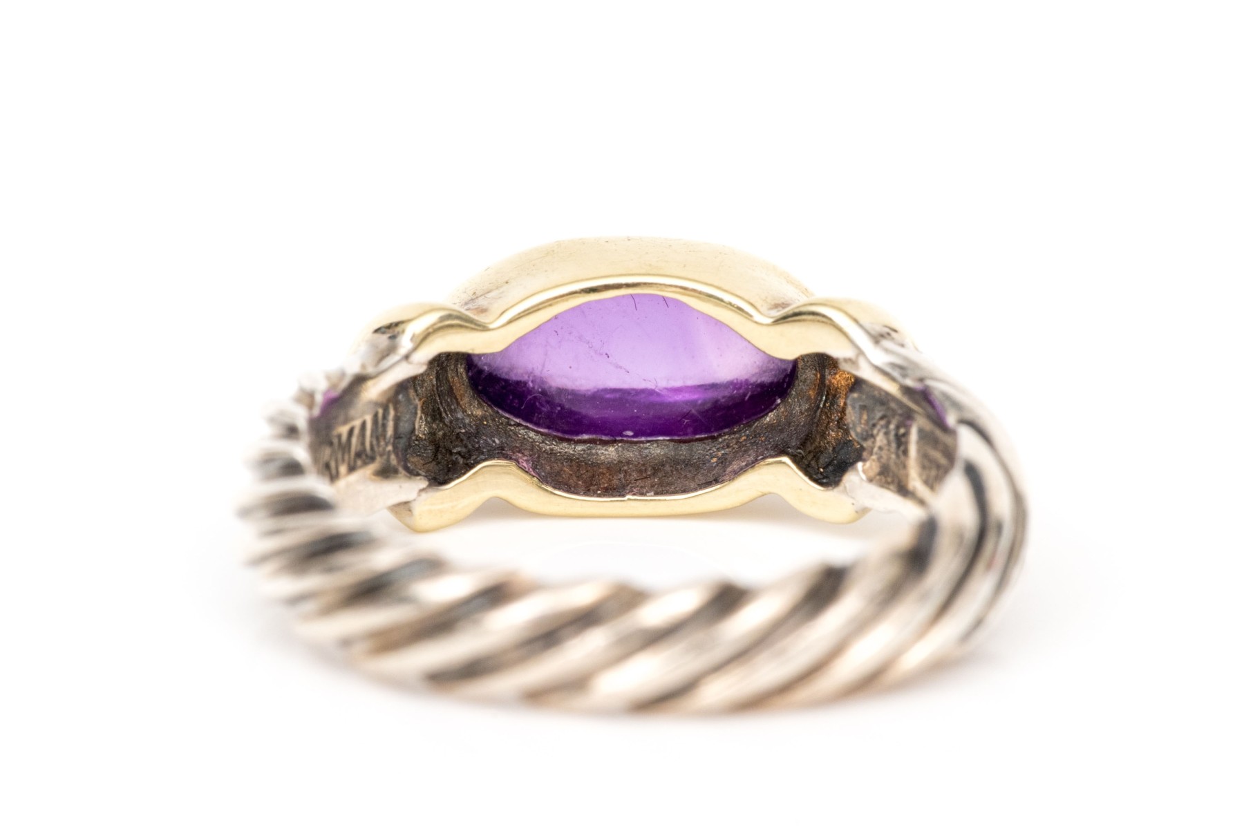 David Yurman sterling silver and 14k yellow gold amethyst cabachon cable ring, size 5.75