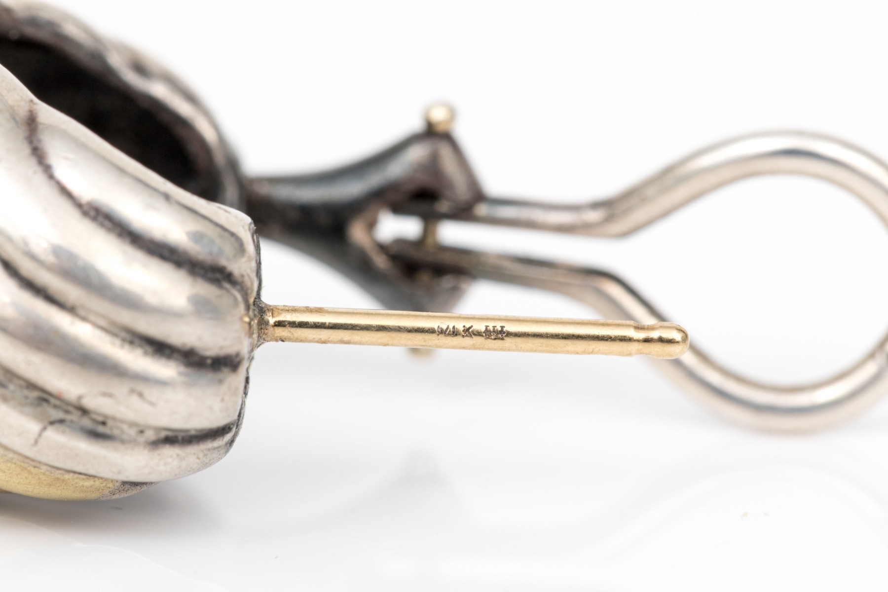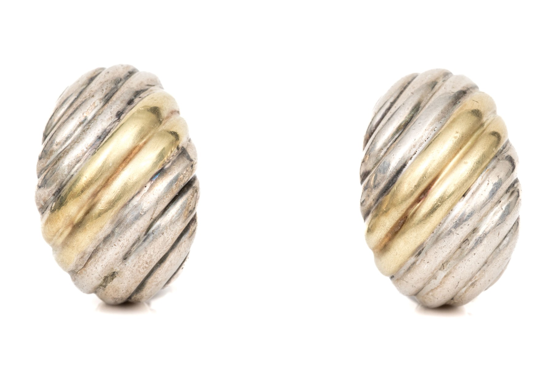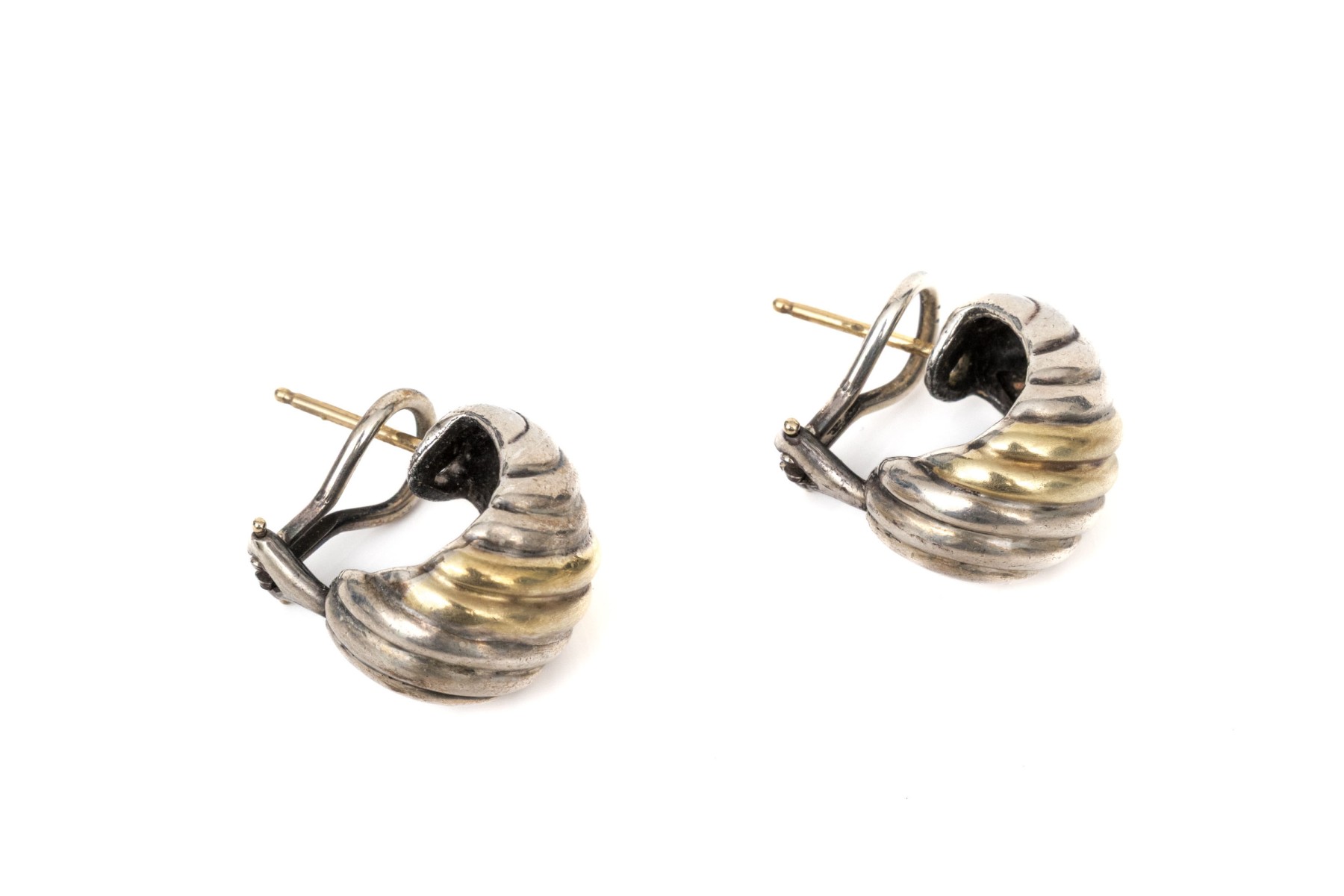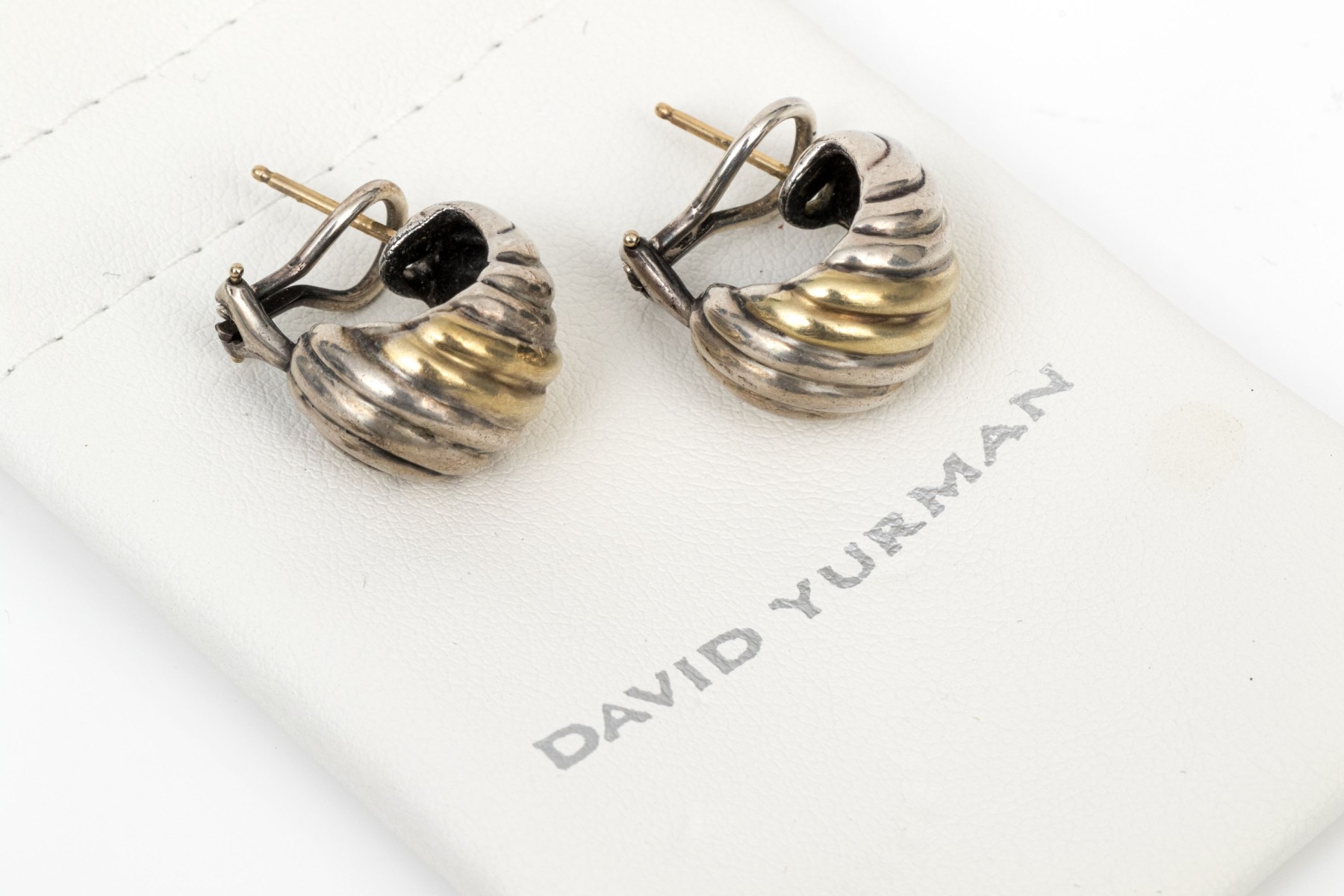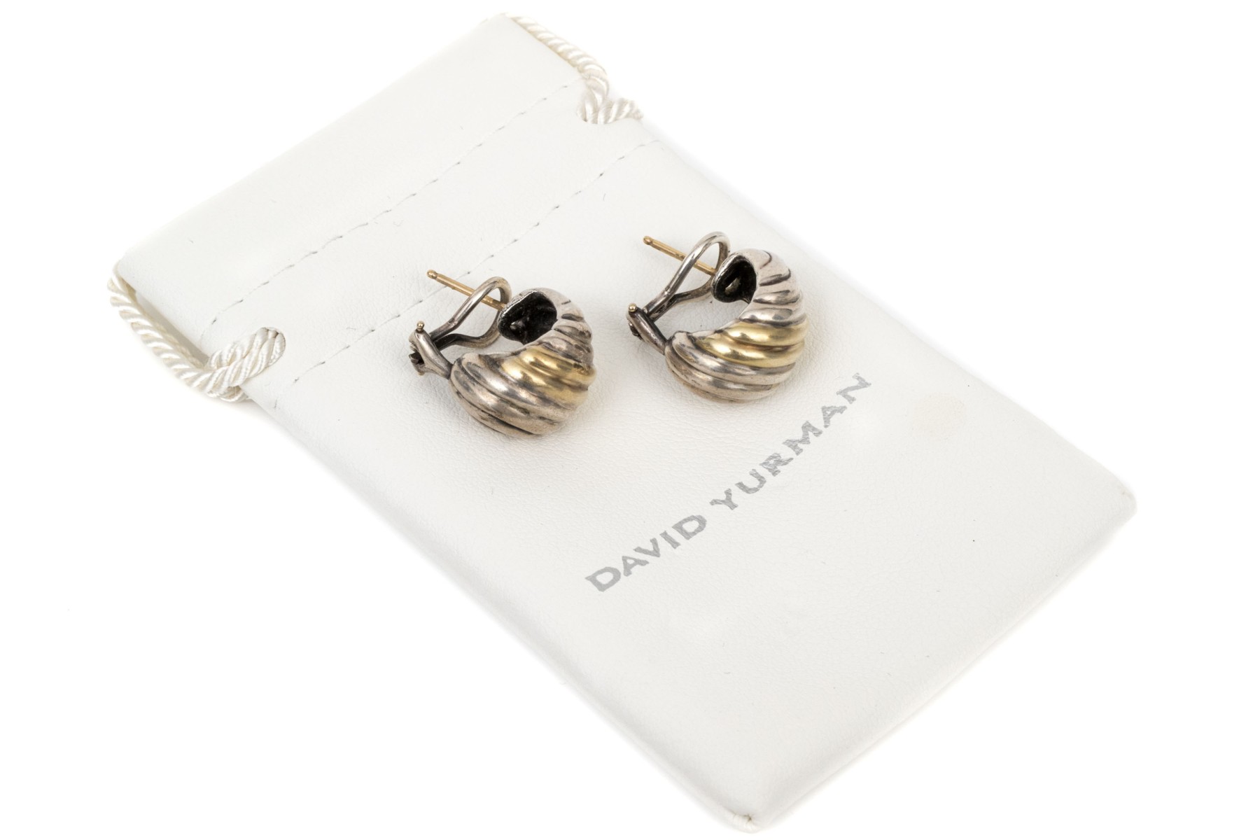 David Yurman sterling silver and 14k yellow gold classic ribbed half hoop earrings, with pouch, finished with posts and omega style backs