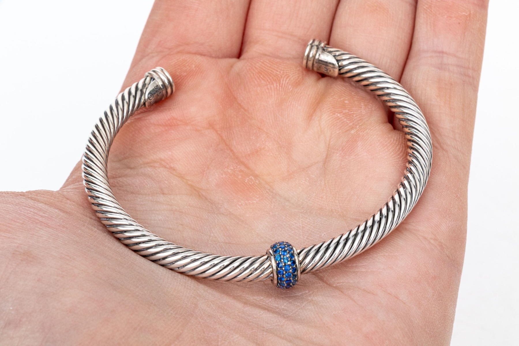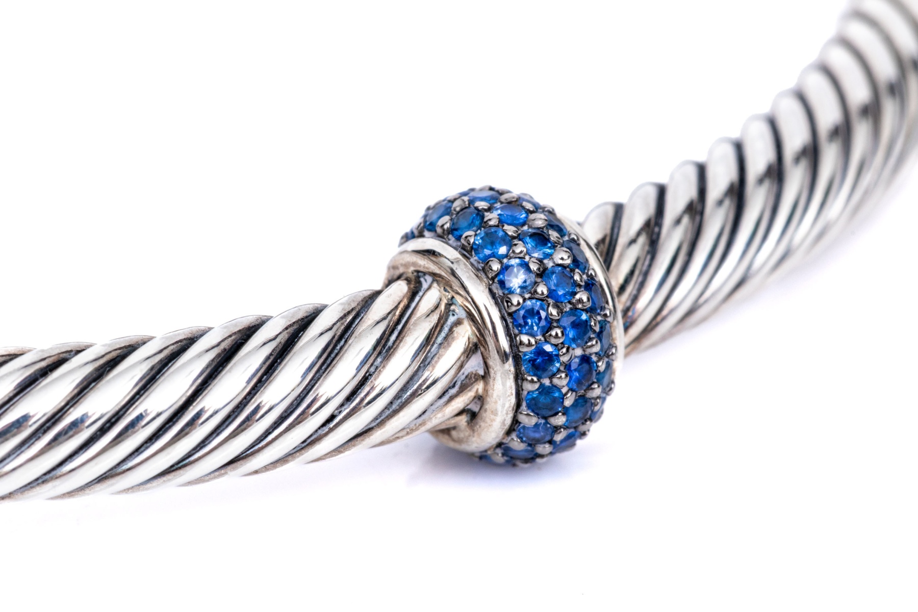 David Yurman sterling silver and blue sapphire classic cable station cuff, app. 0.40 TCW. This beautiful bracelet features a classic sterling silver cable, decorated with a center station of pave set, round faceted blue sapphires, app. 0.40 TCW. With box.