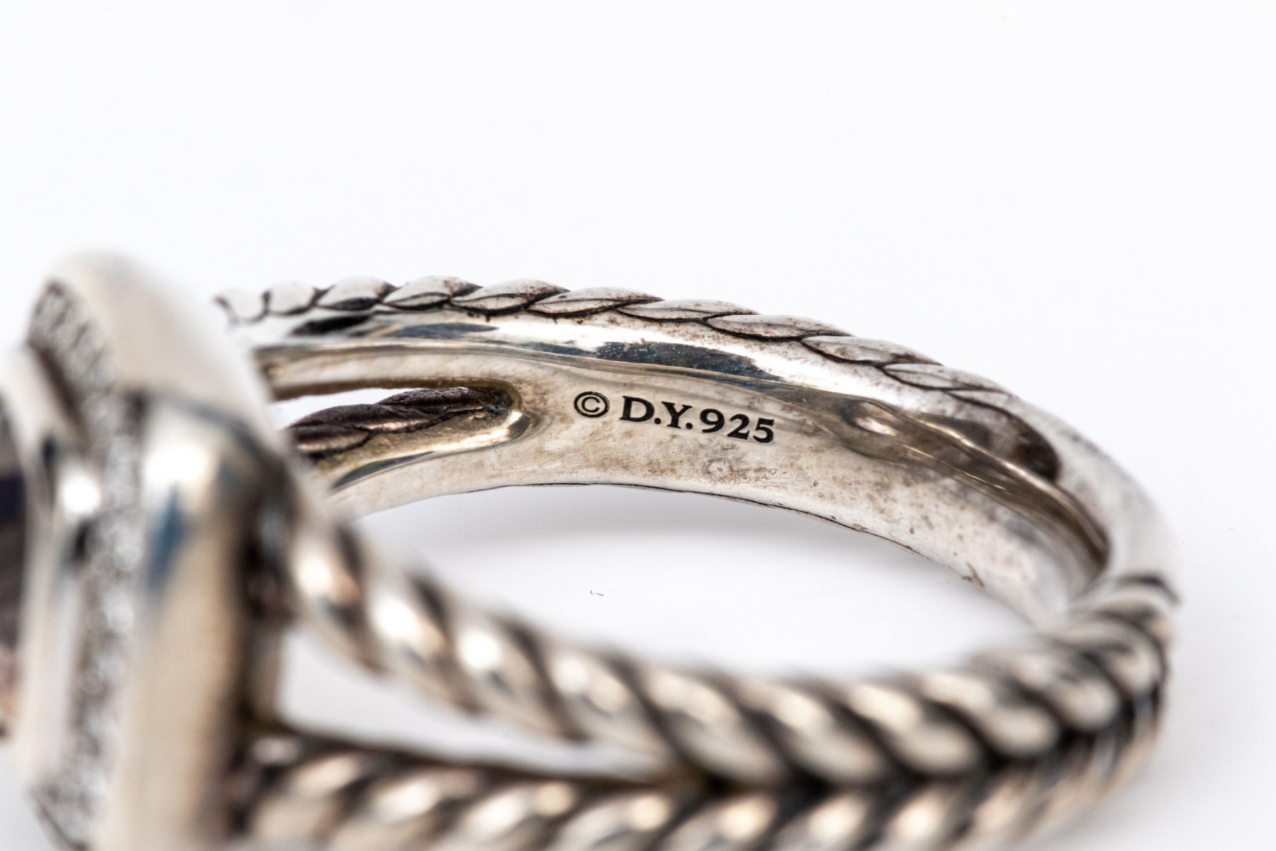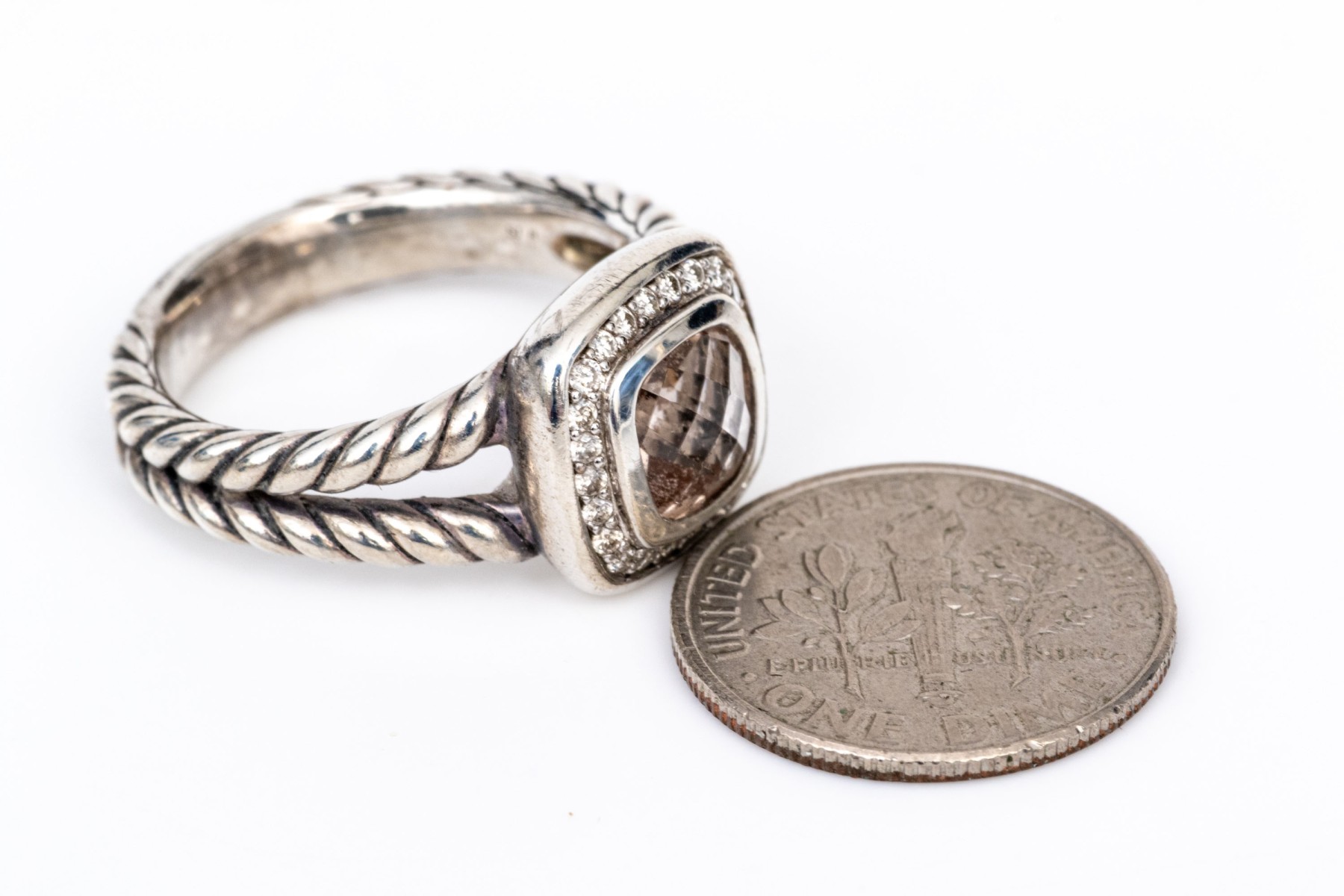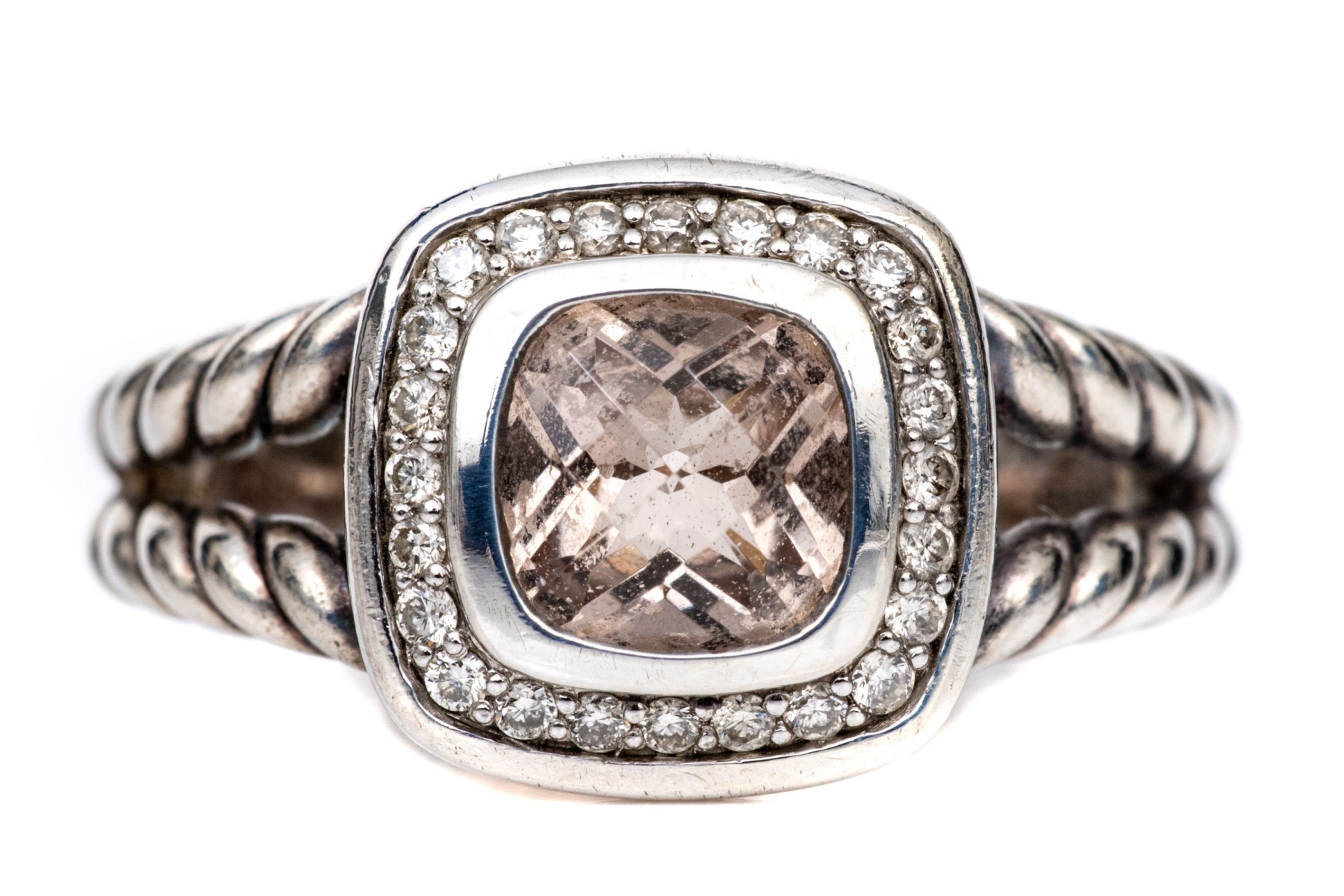 David Yurman sterling silver "Petite Albion" pink morganite and diamond ring. This pretty ring features a checkerboard cushion pink morganite, 1.50 CTS, and a diamond halo border, app. 0.16 TCW, finished with a split cable style shank