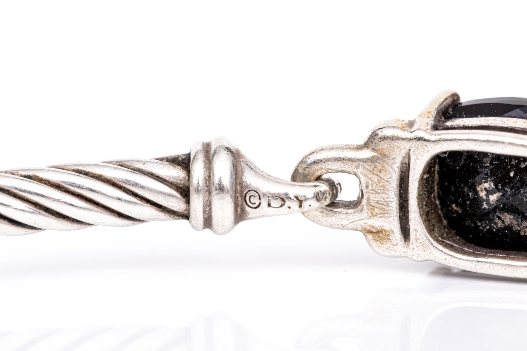 David Yurman sterling silver petite black onyx and diamond "Wheaton" bracelet. This elegant bracelet features a classic sterling silver cable, set in the center with a rectangular checkerboard cushion shaped black onyx, flanked by round faceted diamonds, prong set, app. 0.06 TCW. With box.